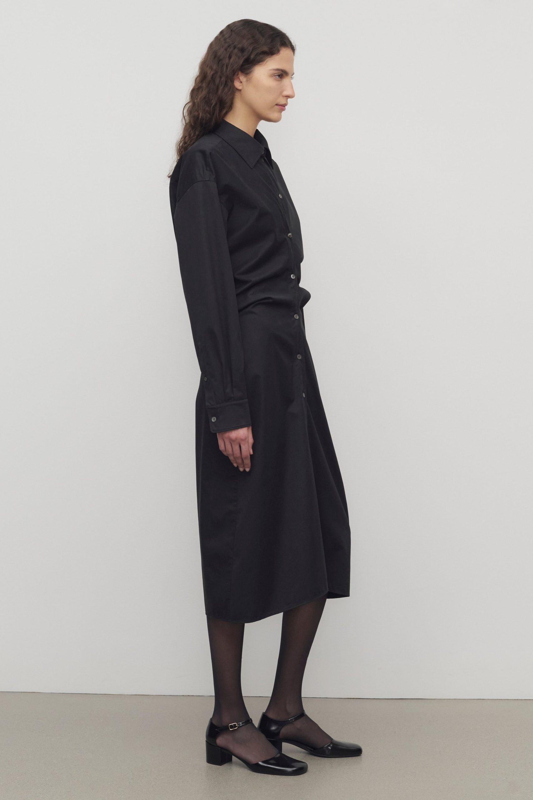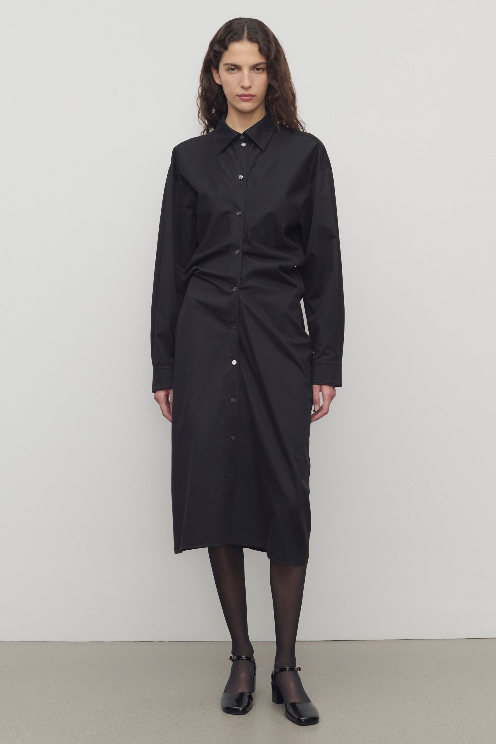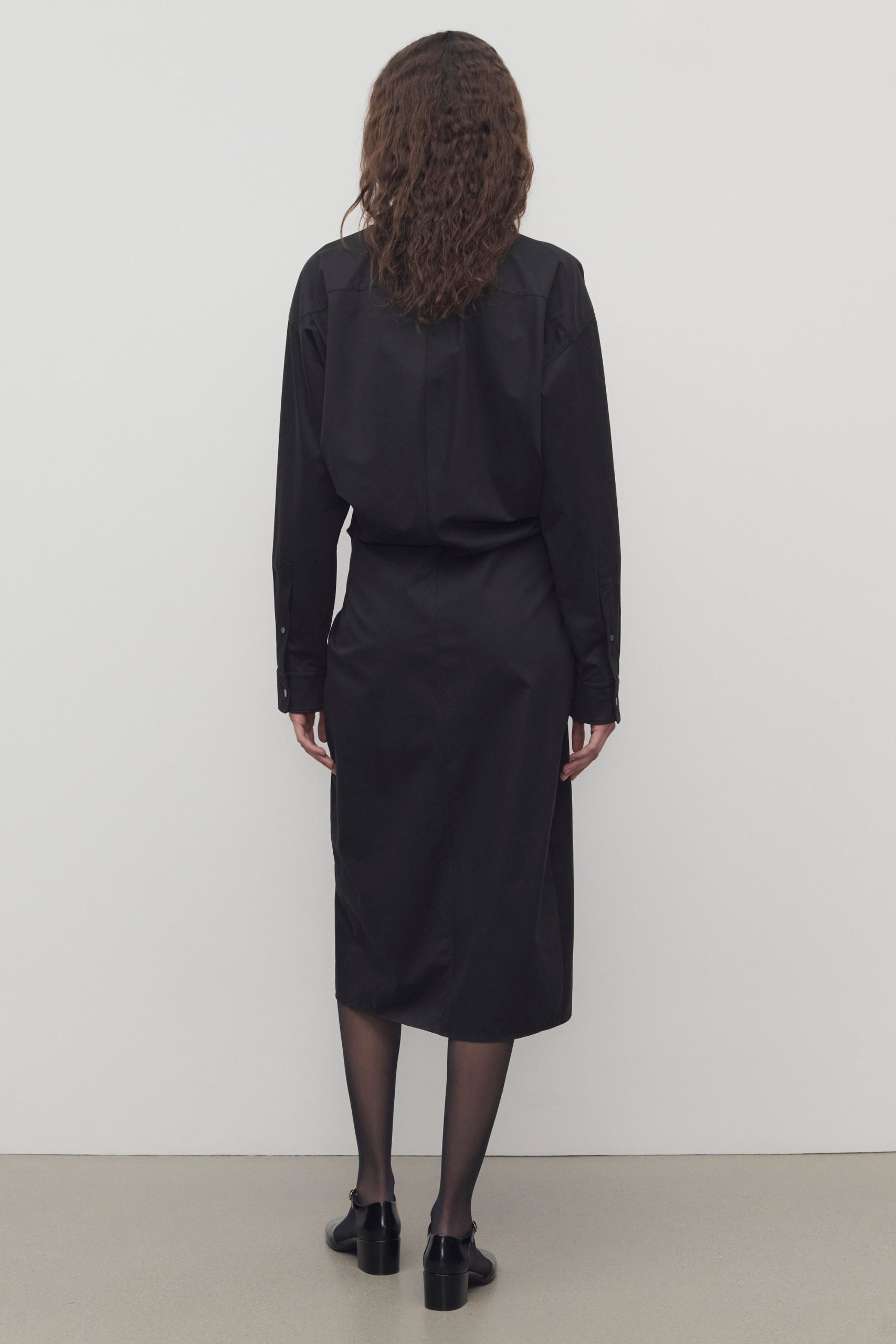 Calf-length shirtdress in cotton and cashmere gabardine with fitted silhouette. slight shirring at waist. and exposed front button placket.