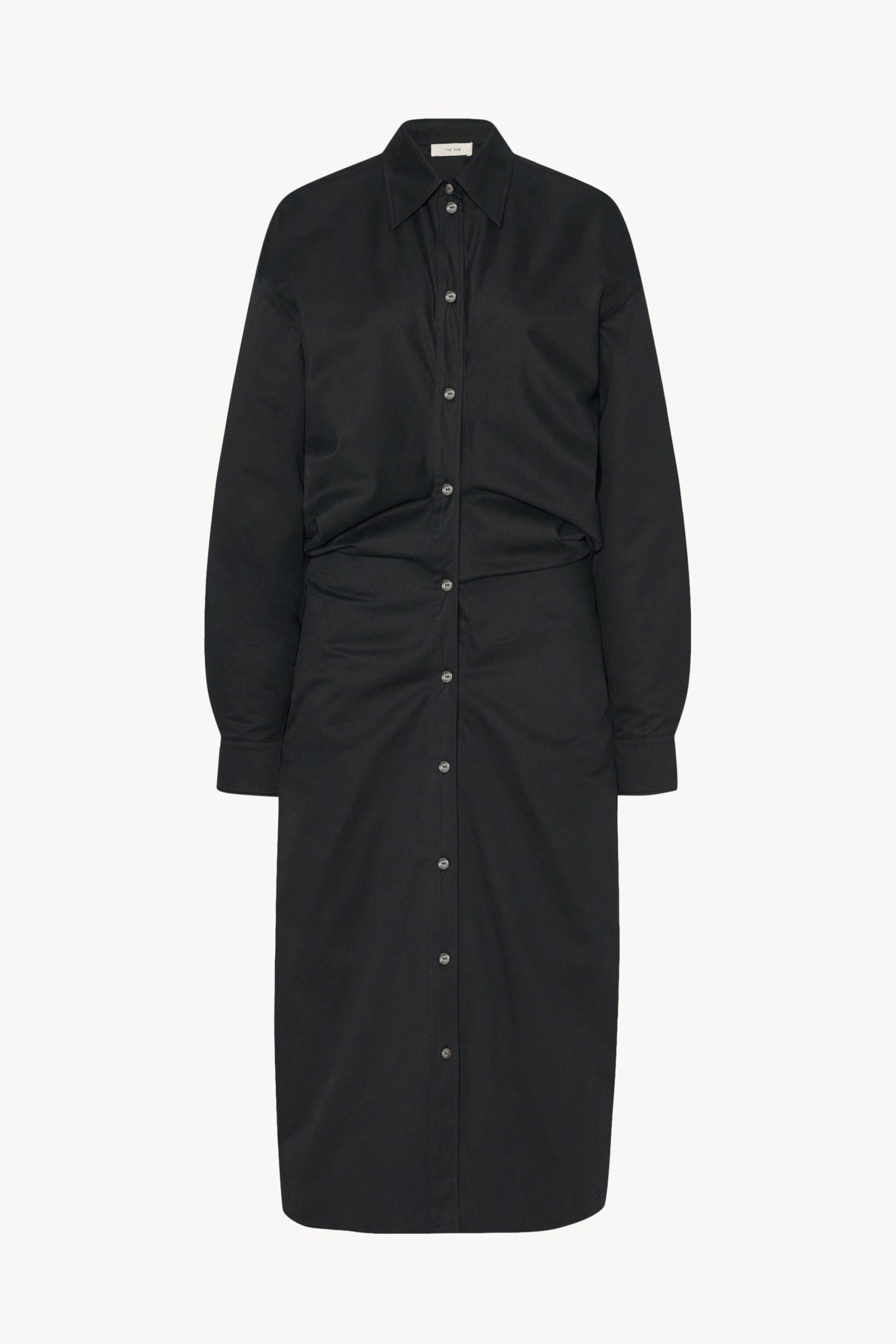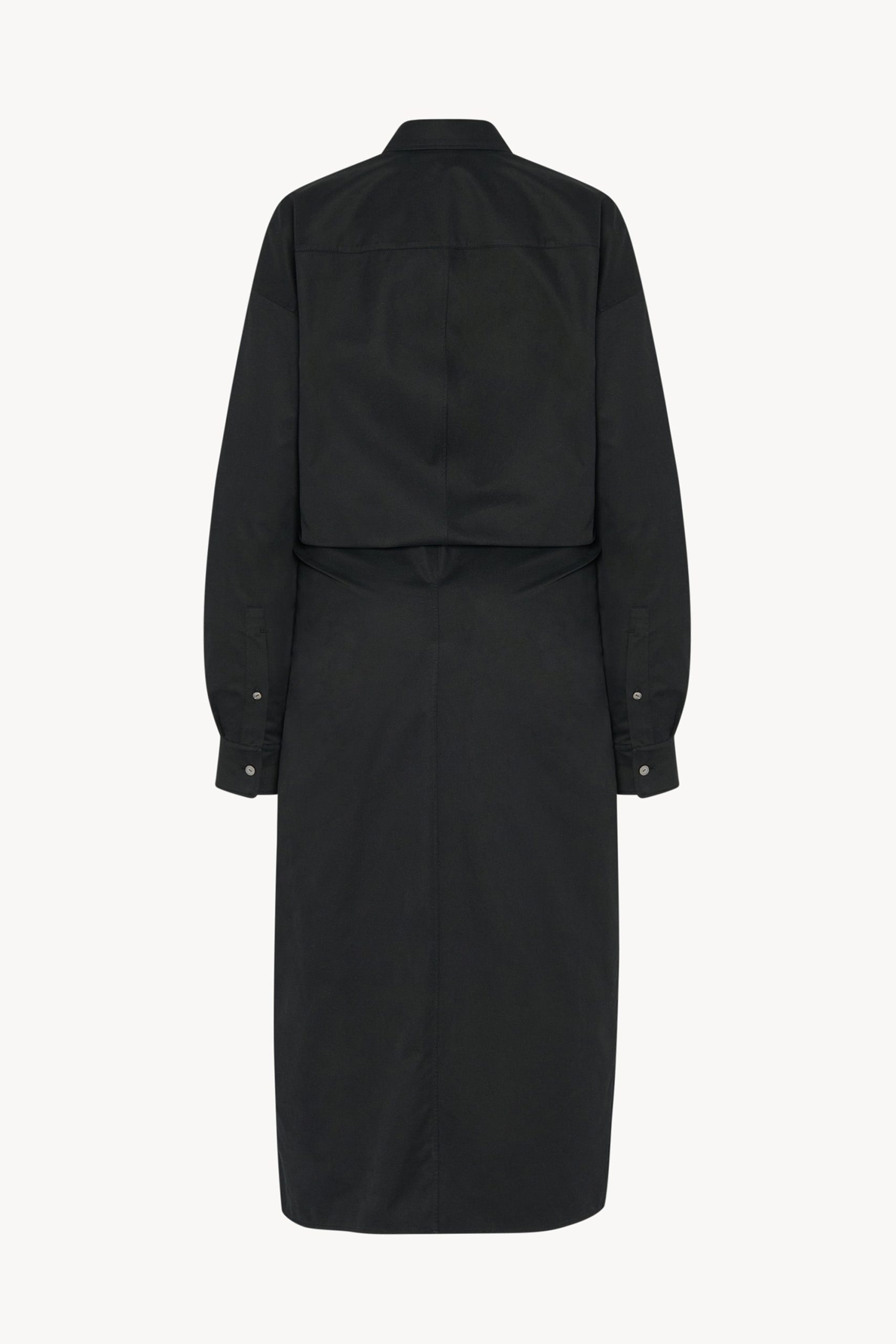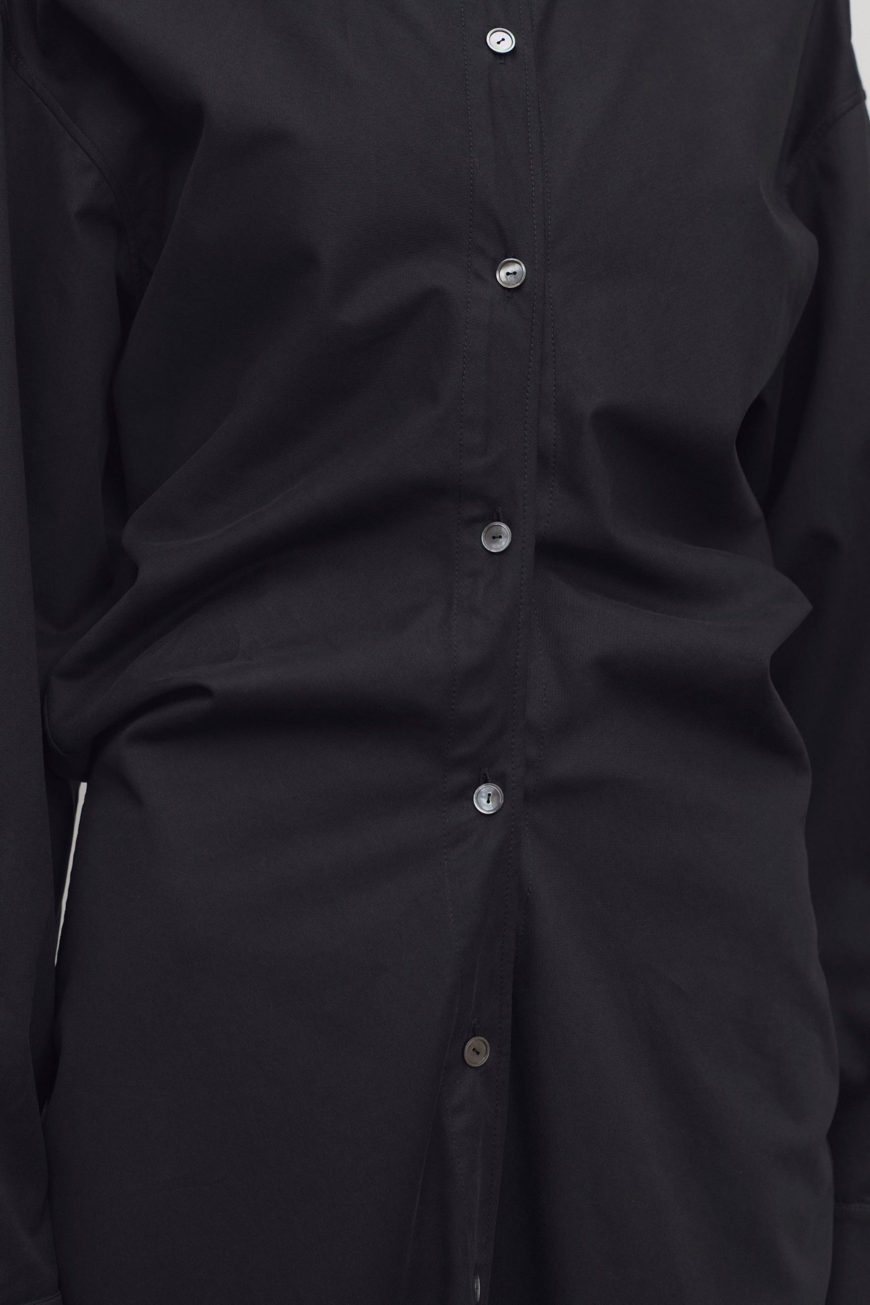 Calf-length shirtdress in cotton and cashmere gabardine with fitted silhouette. slight shirring at waist. and exposed front button placket.