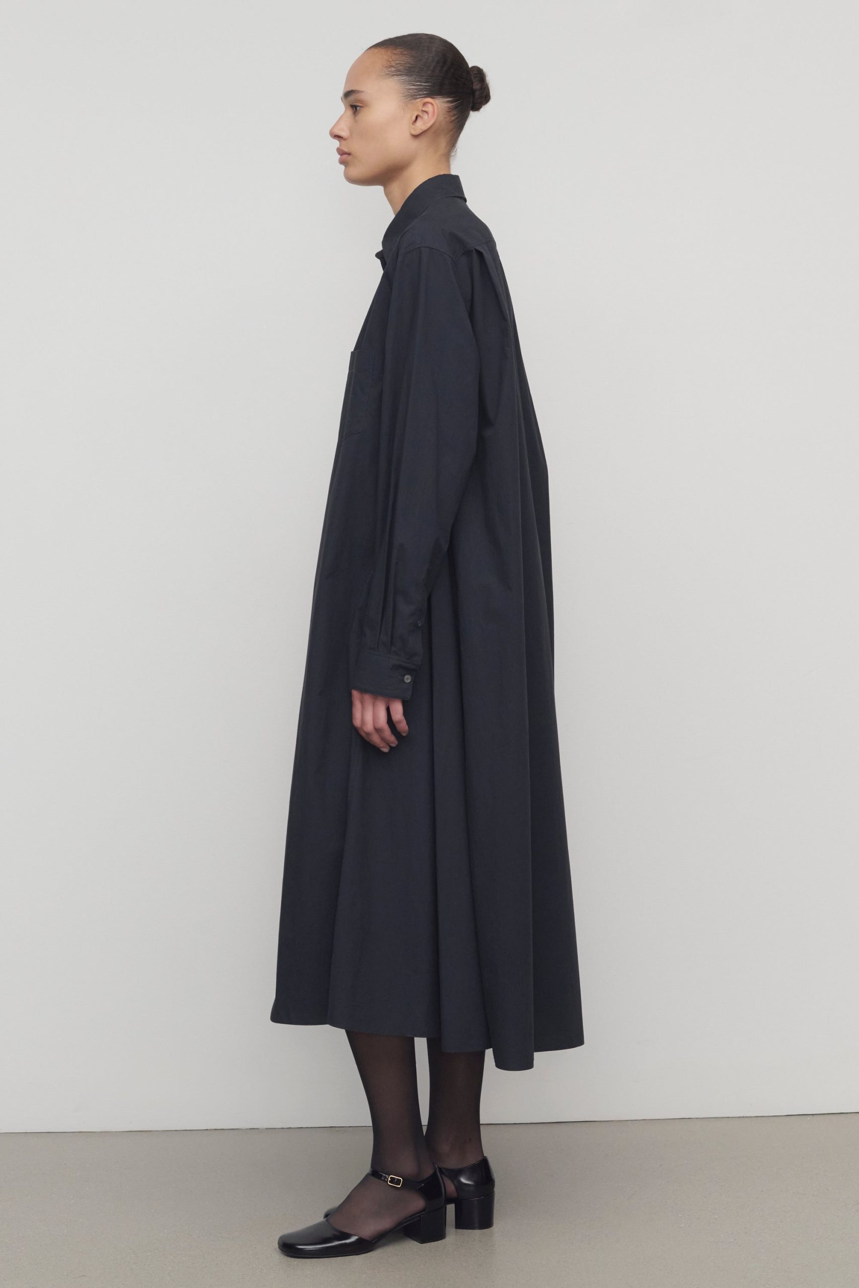 Calf-length shirtdress in sanded cotton poplin with A-line silhouette. side seam pockets. and exposed front button placket.