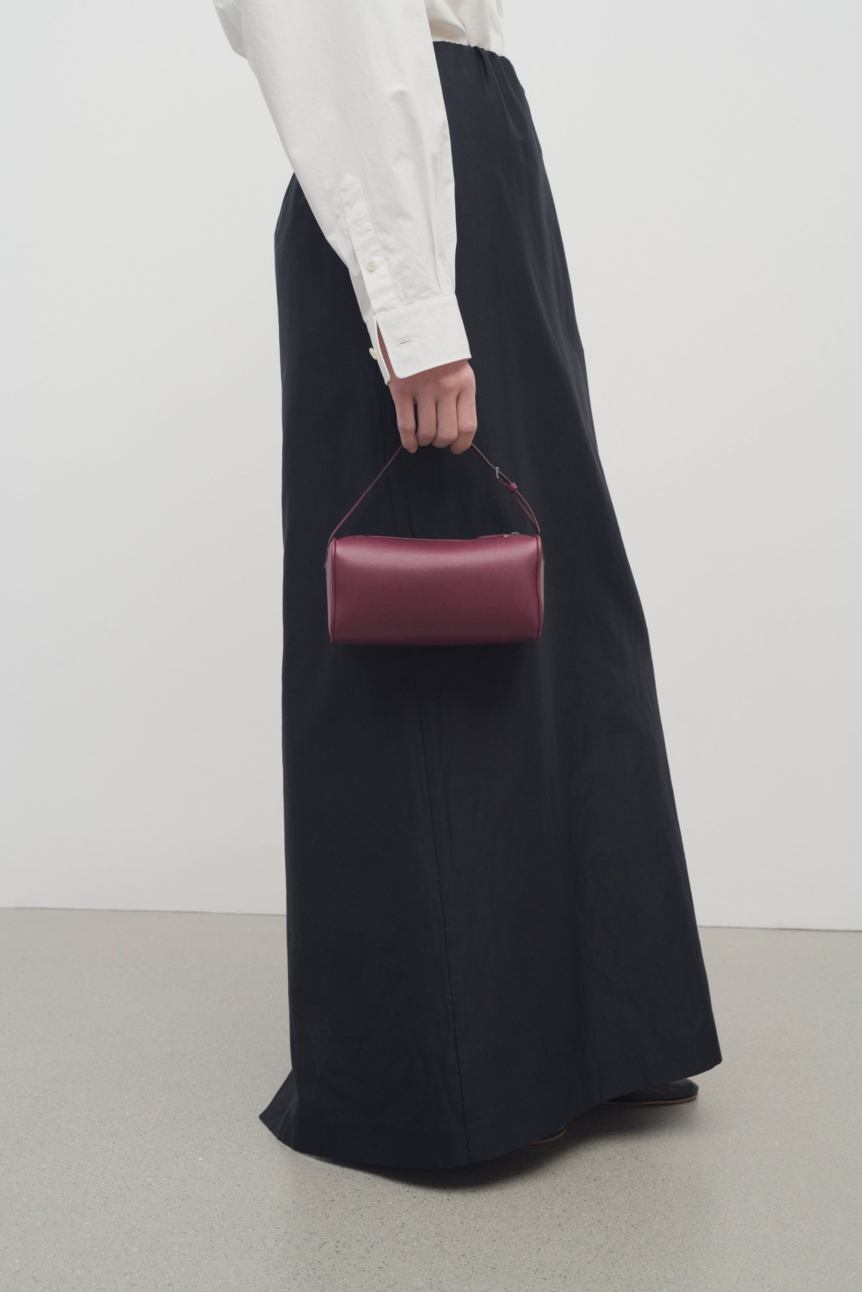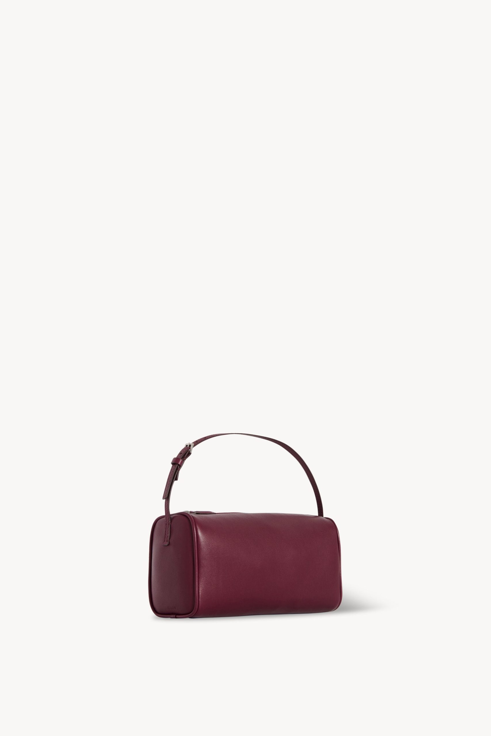 Top handle bag in buttery lambskin leather with softly rounded edges. leather piping. and adjustable slim leather strap.