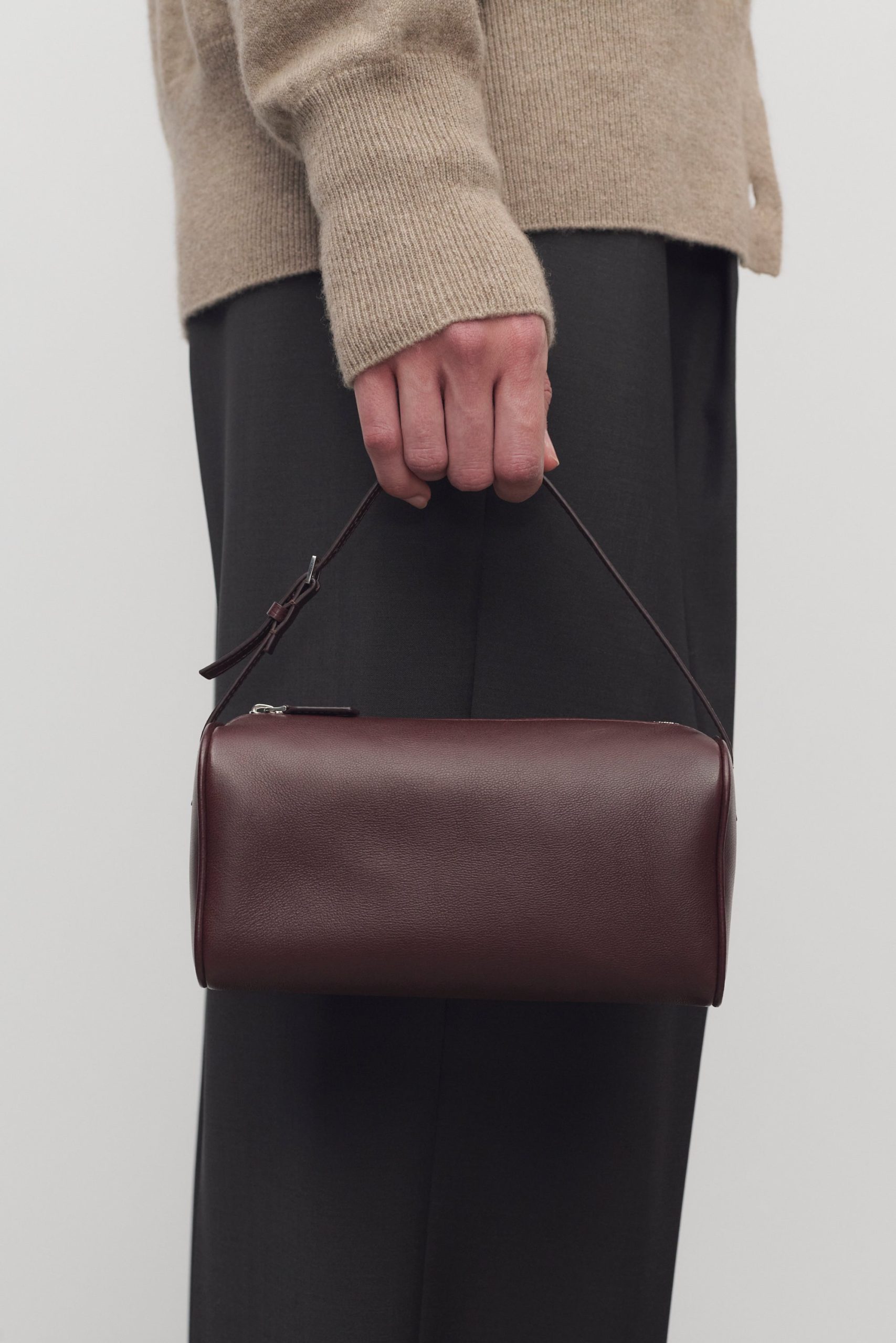 Top handle bag in smooth nappa leather with softly rounded edges. leather piping. and adjustable slim leather strap.