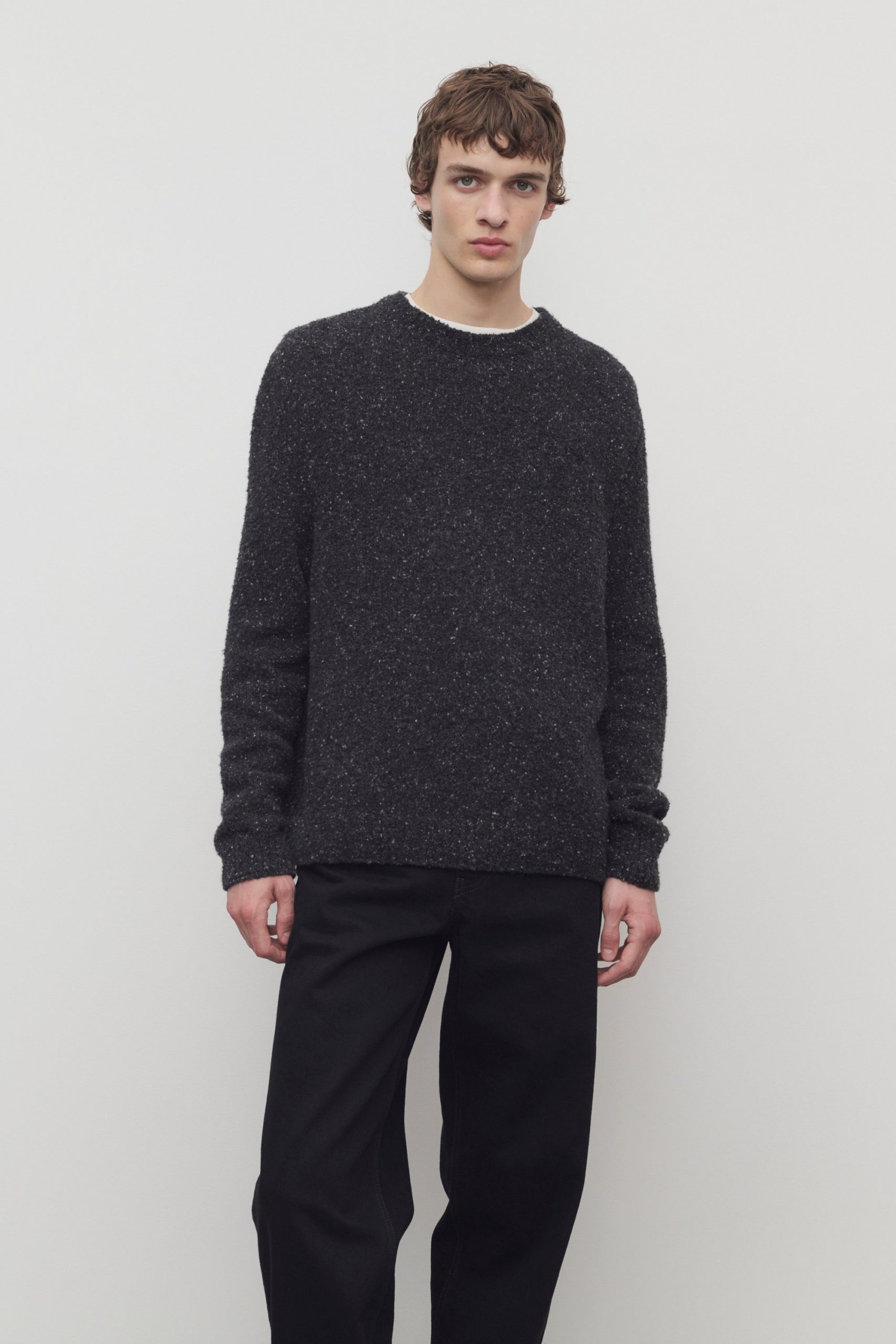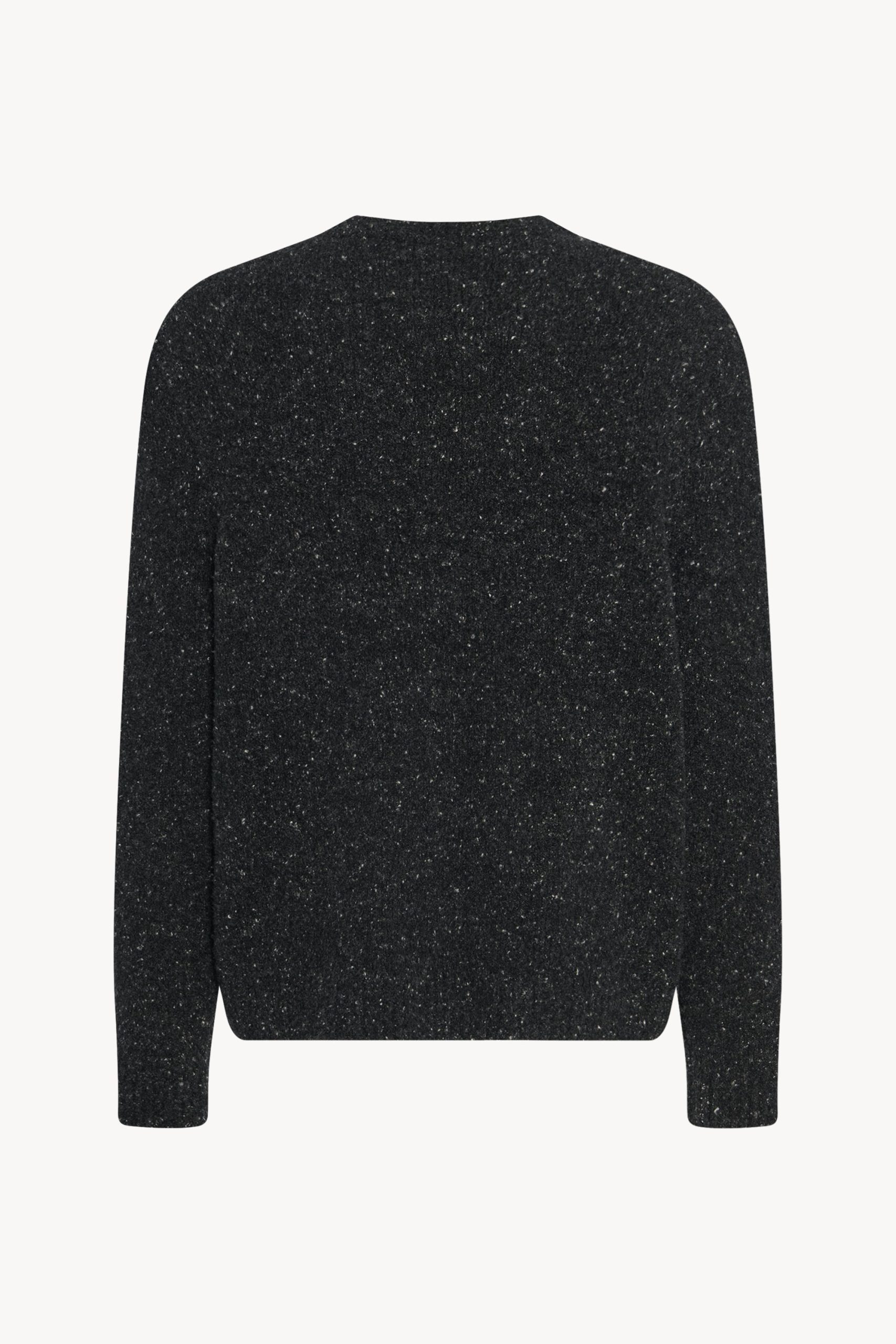 Classic crewneck sweater in flecked midweight cashmere with relaxed fit and ribbed neckline. cuffs. and hem.