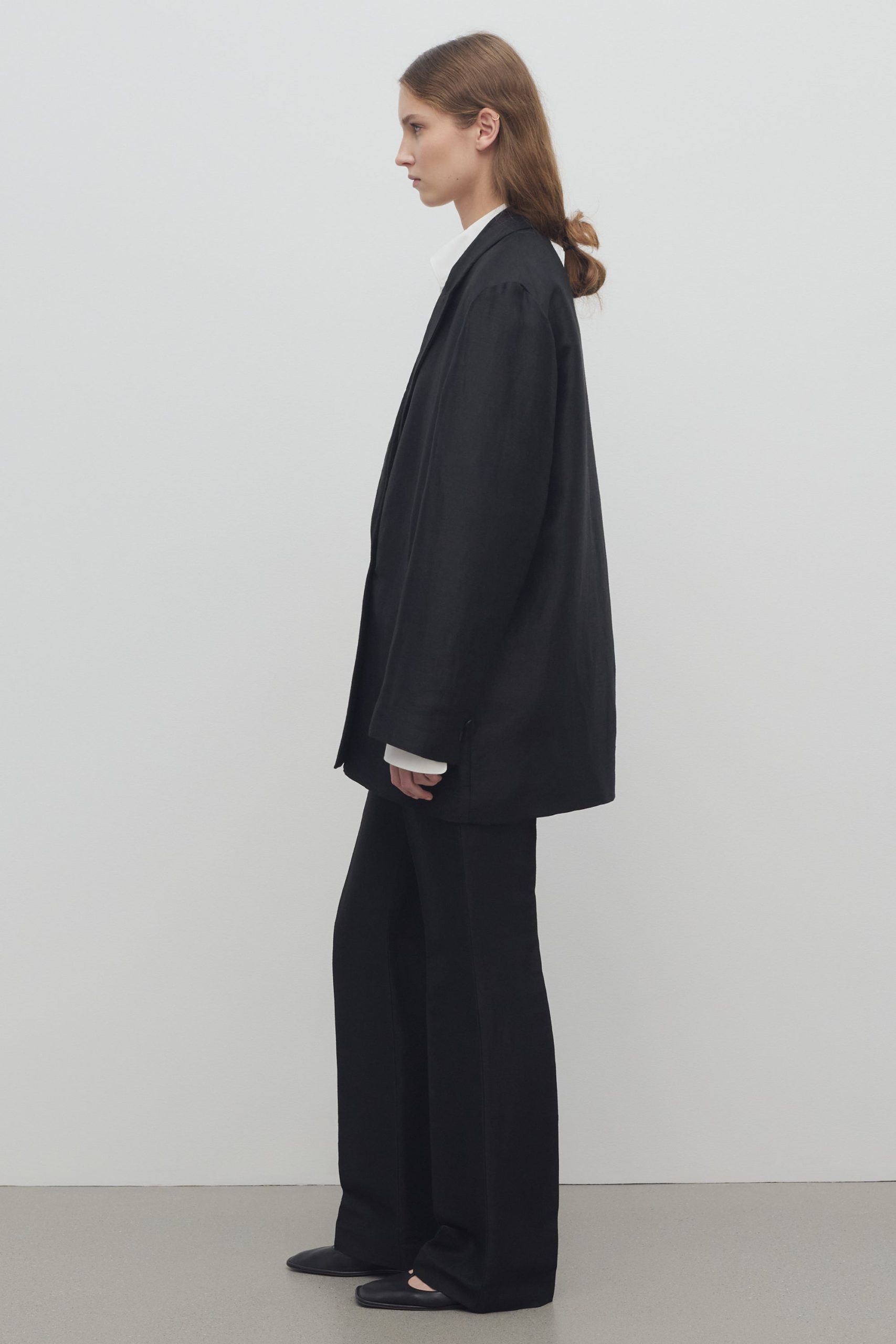 Mid-rise tailored trouser in textured linen with straight leg. pressed front and back creases. and slanted side pockets.