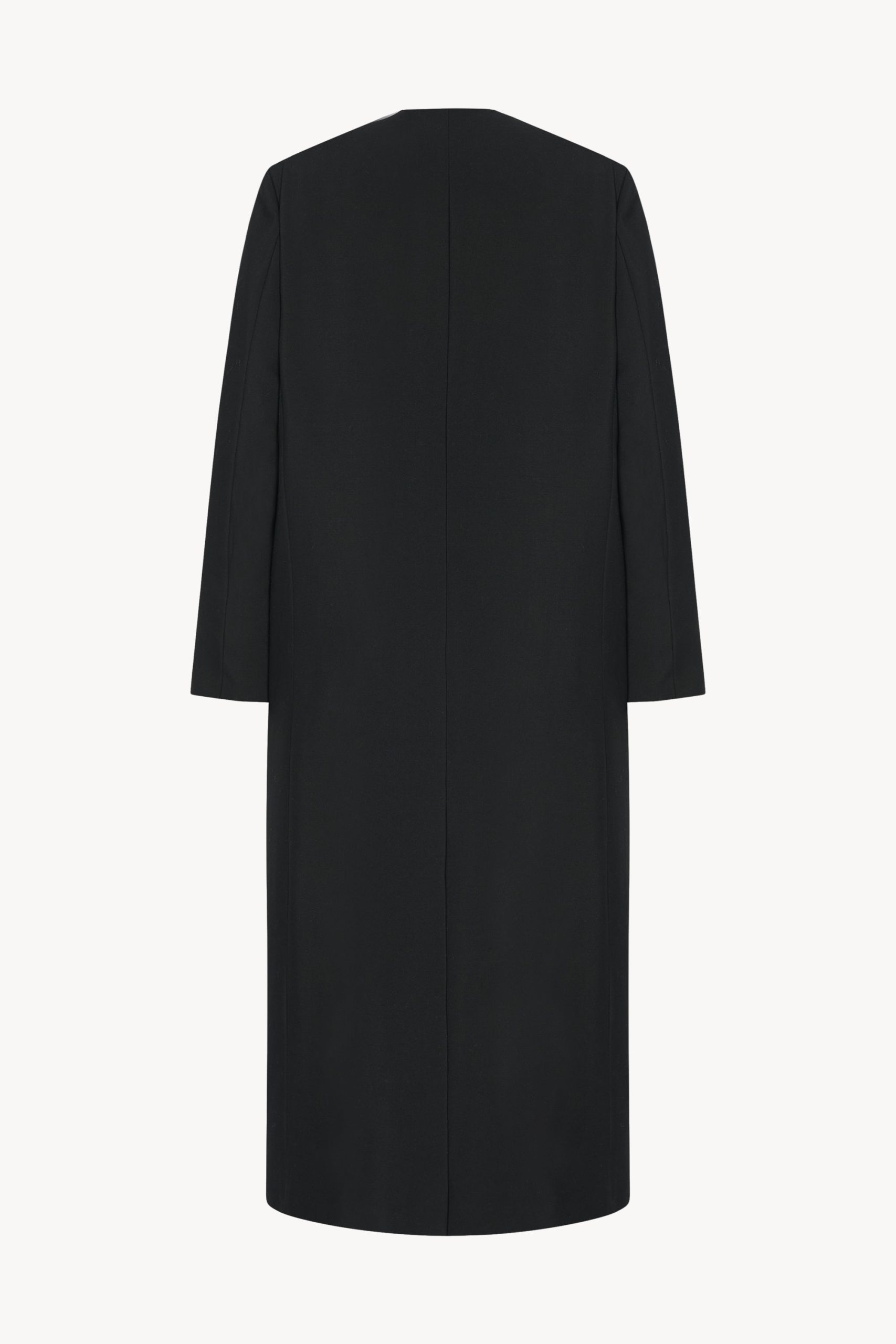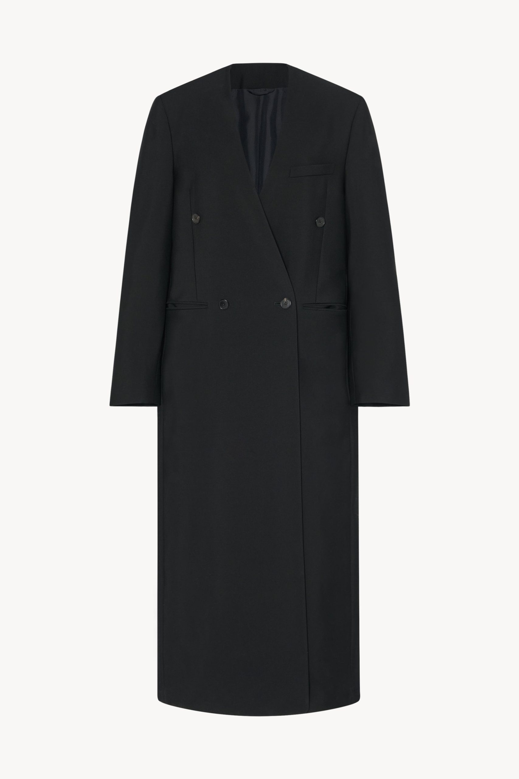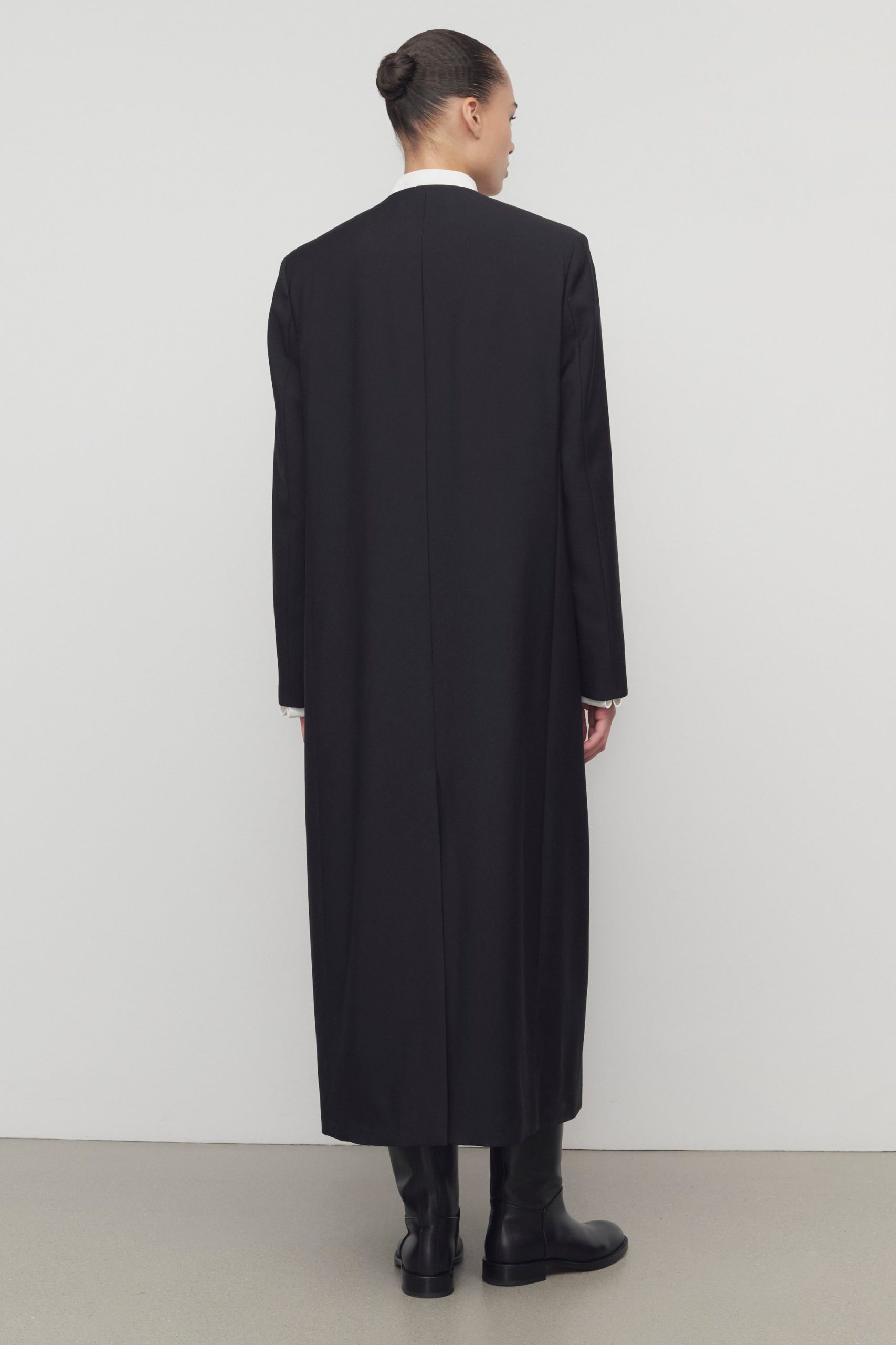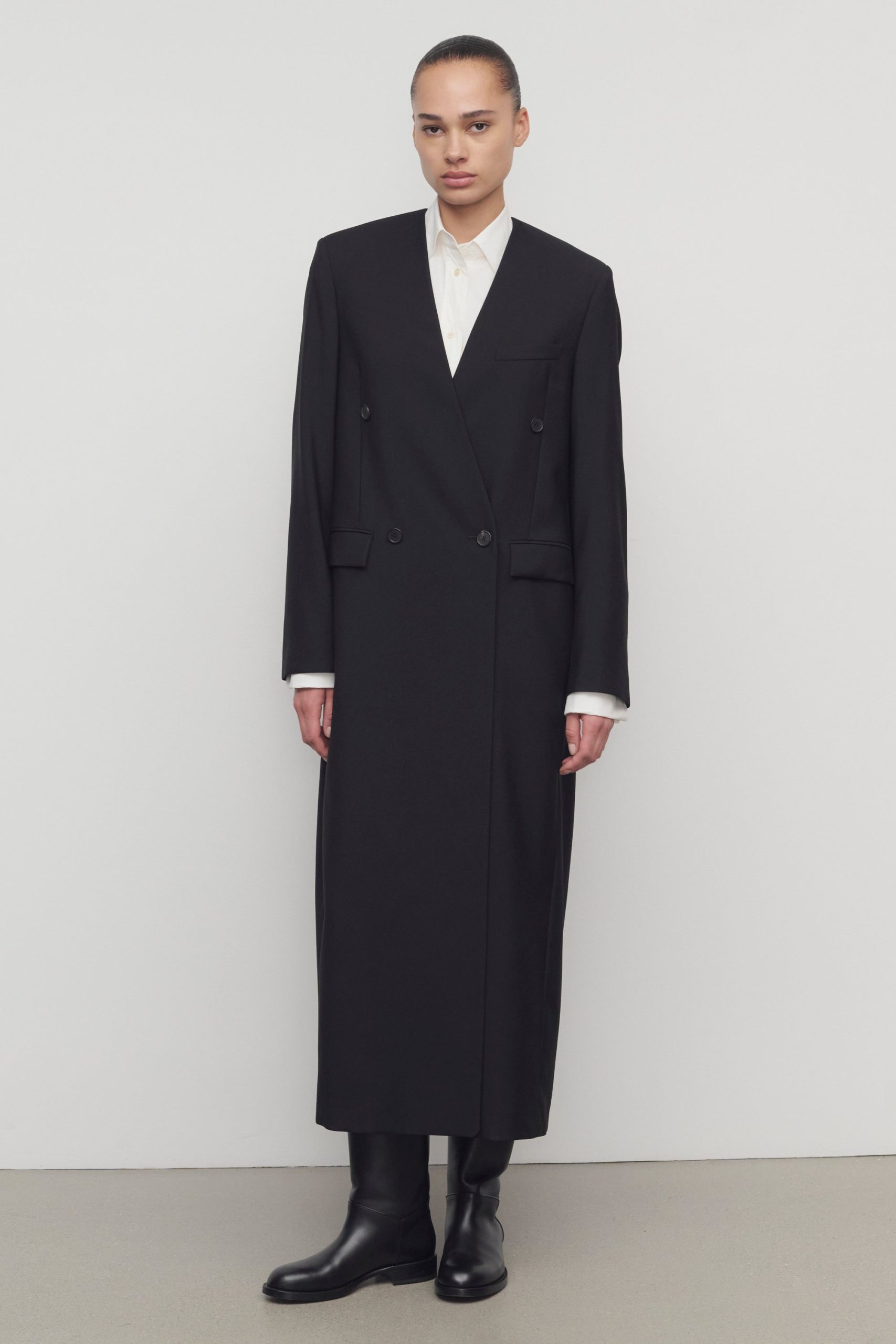 Ankle-length tailored coat in fluid virgin wool with front besom pockets and double-breasted horn button closure.