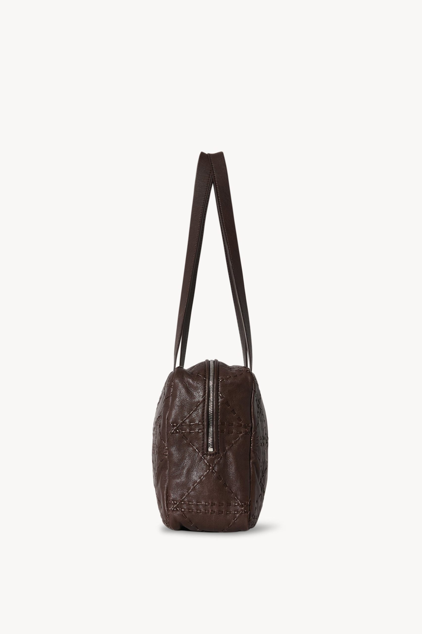 Soft bowling bag in hand-embroidered nappa leather with elongated flat handles. dual zipper closure. and hand-stitched detailing throughout.