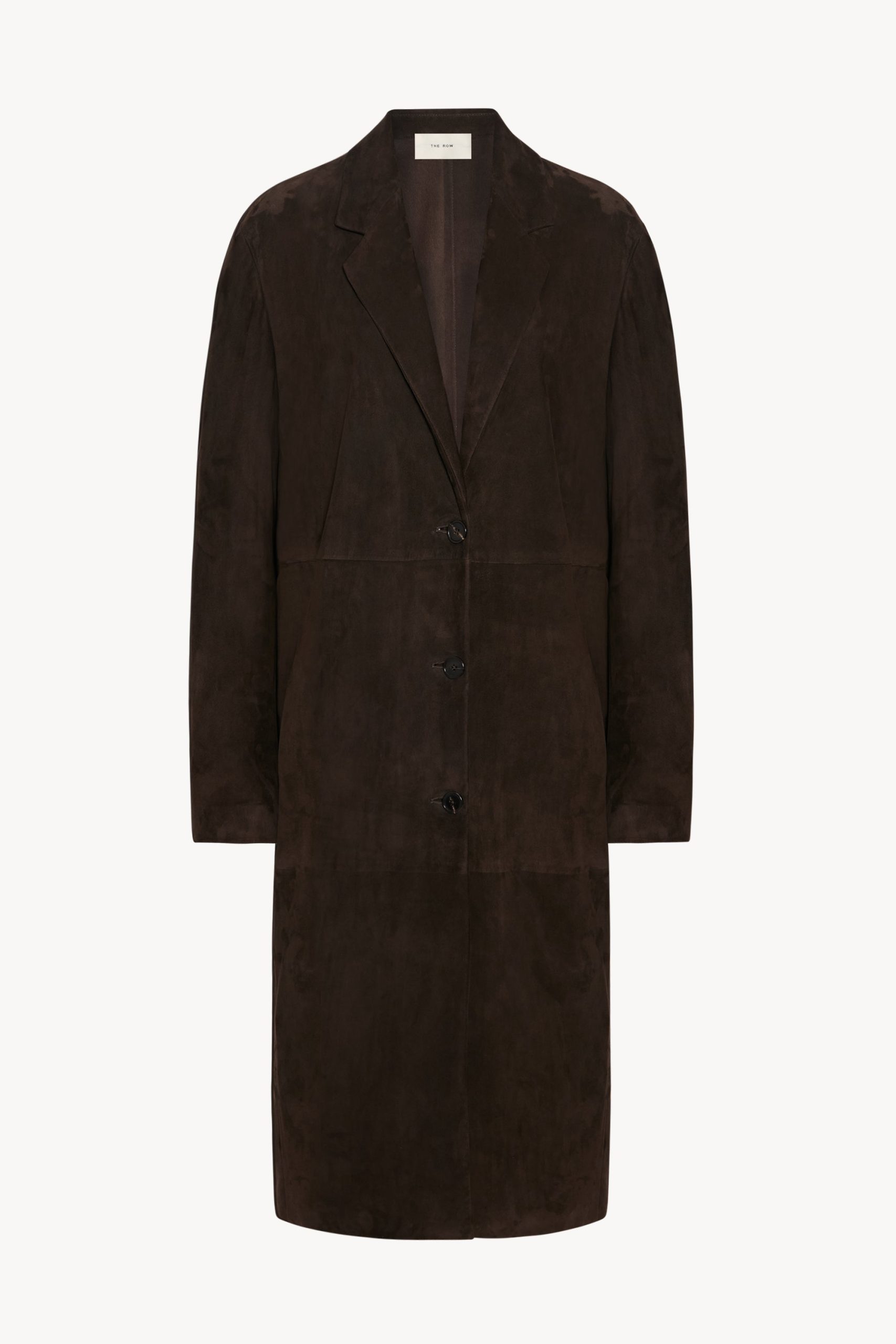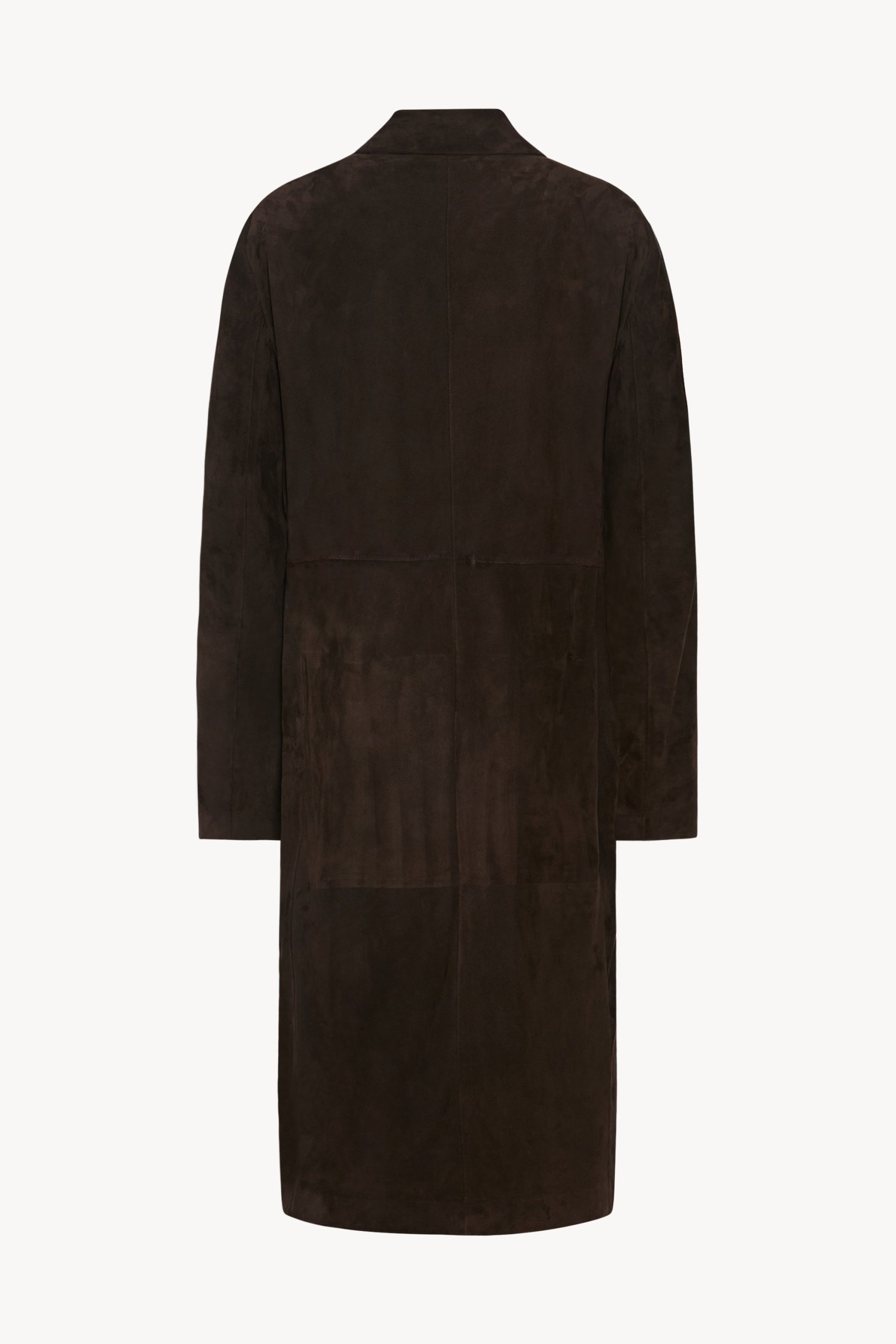 Single-breasted car coat in ultralight lambskin suede with notch lapel and paneled construction.