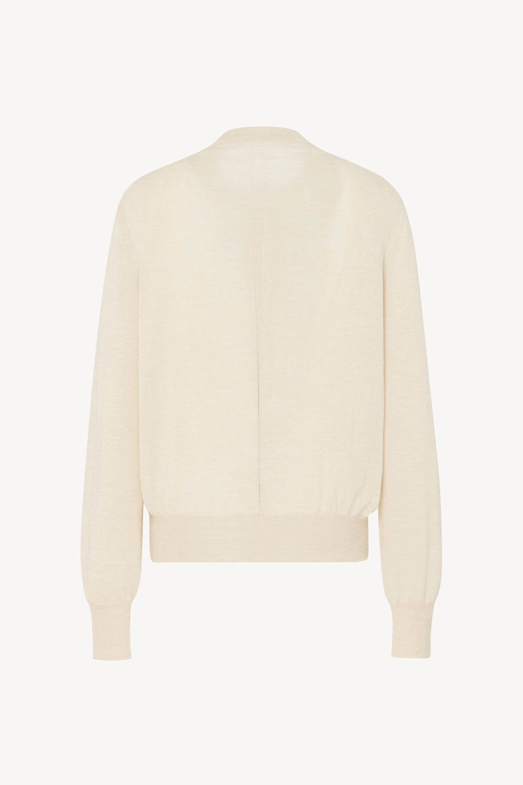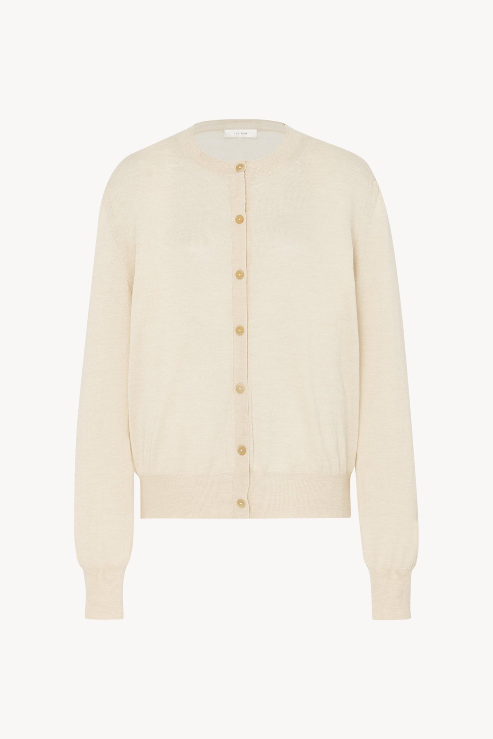 The Row Essentials cardigan sweater in superfine cashmere knit with finely ribbed neckline. cuffs and hem.