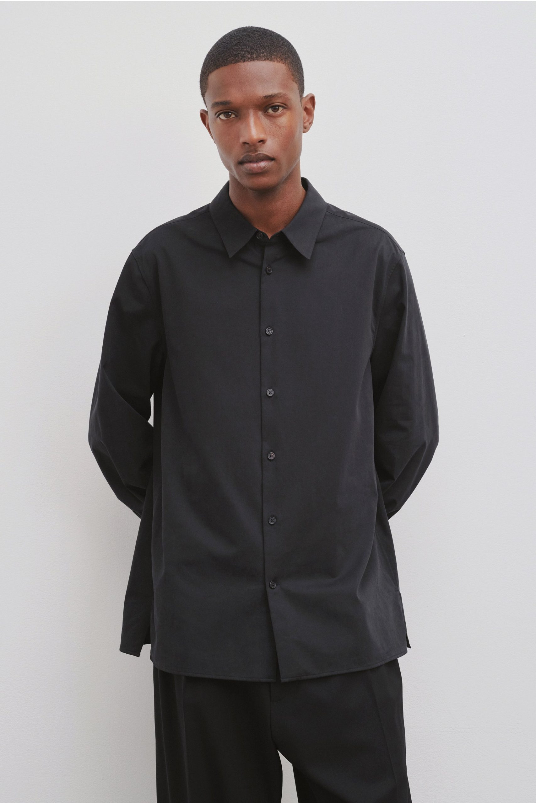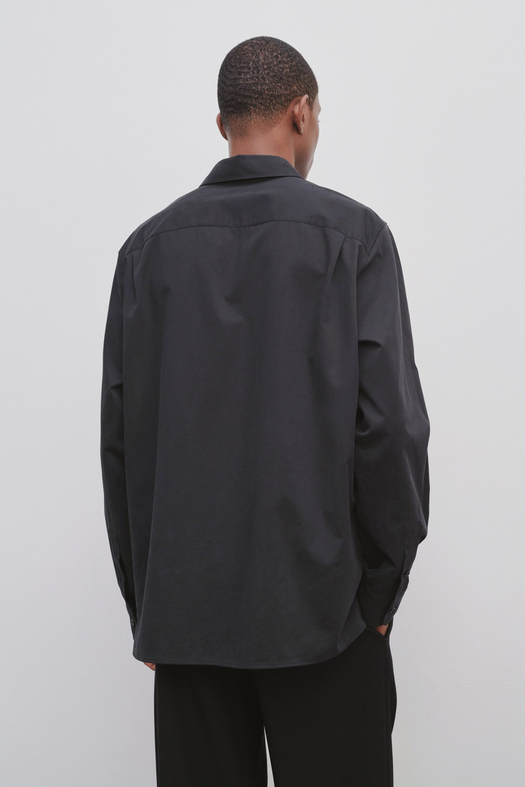 Classic button-up shirt in soft wool gabardine with medium relaxed fit. exposed horn buttons and back yoke with edged stitch.