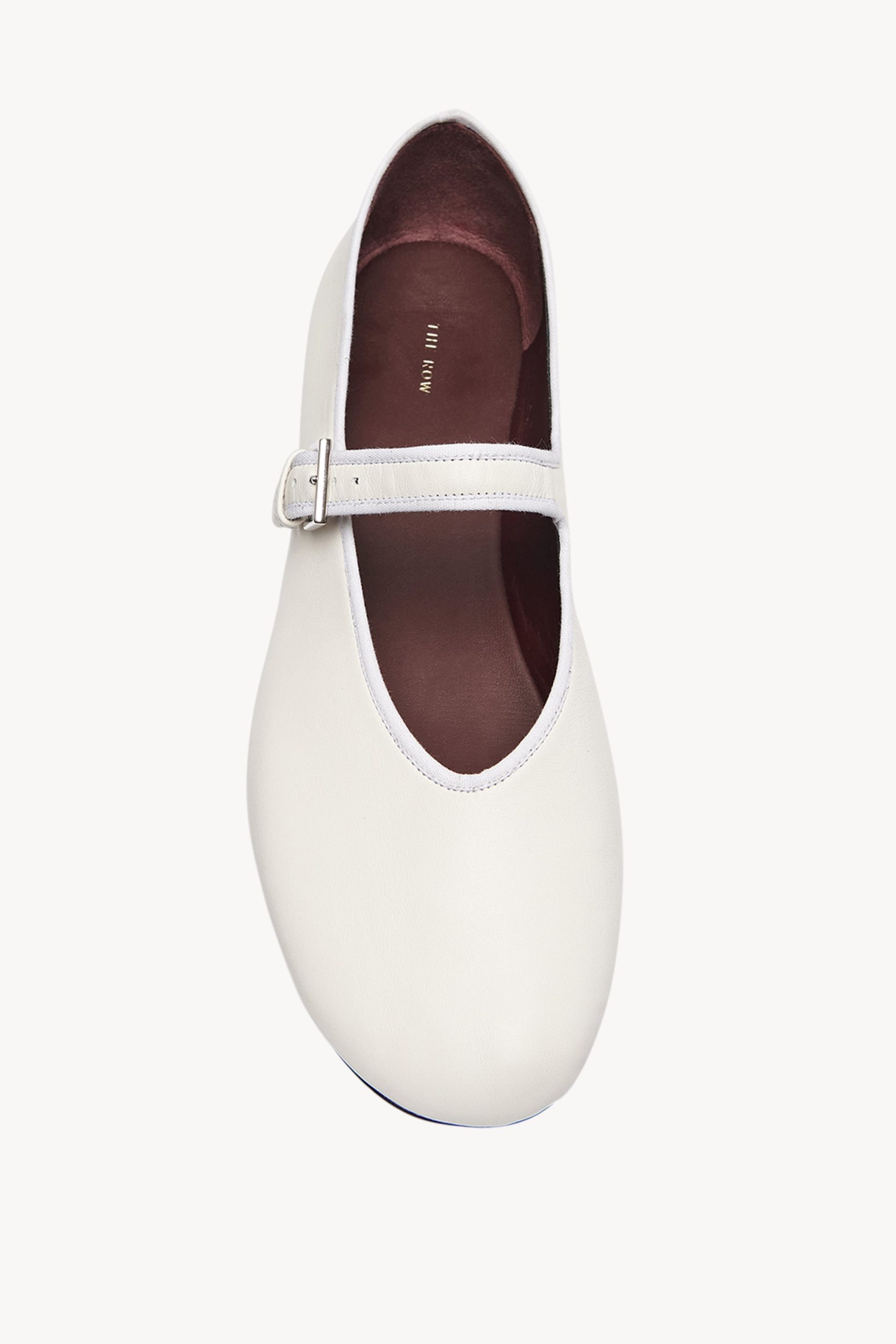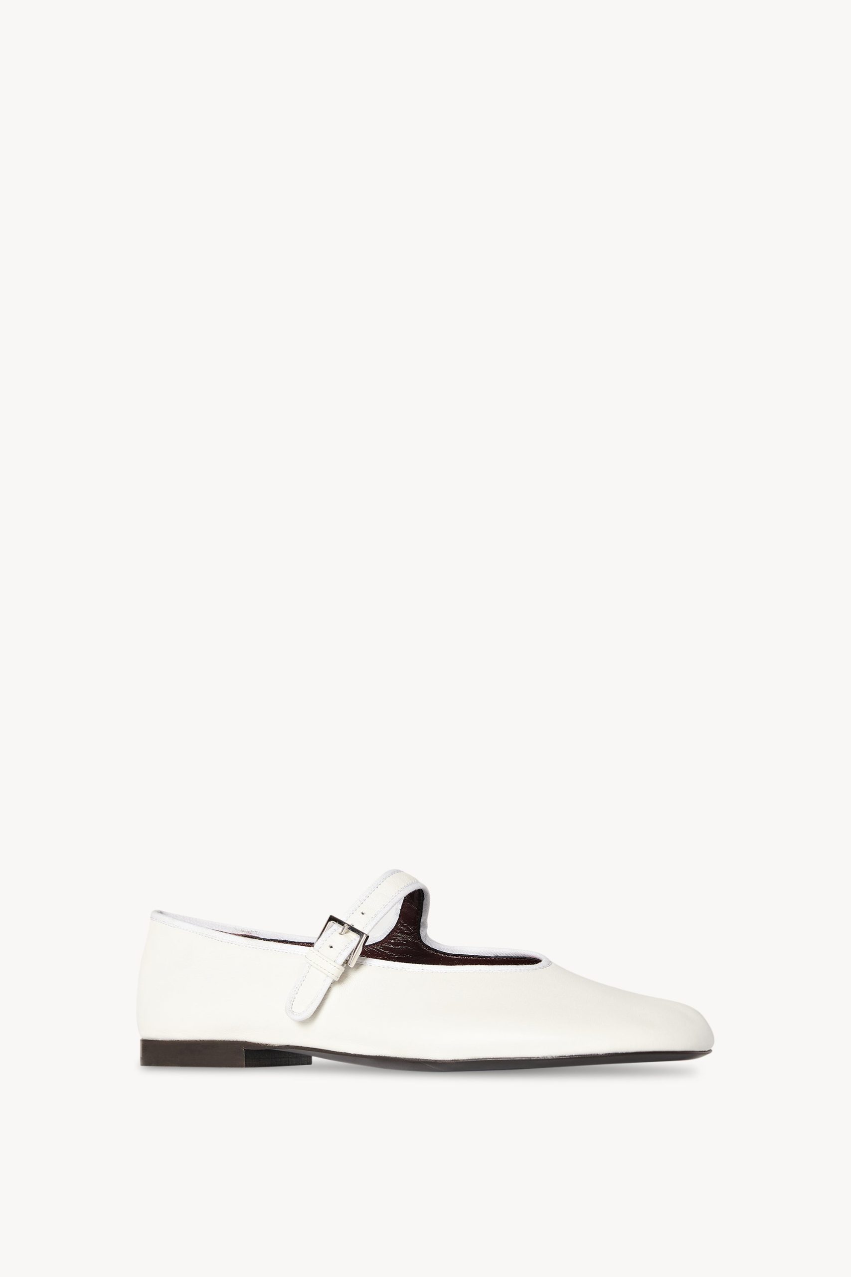 Classic mary jane shoe in sleek nappa leather with v-neckline and buckled strap closure.