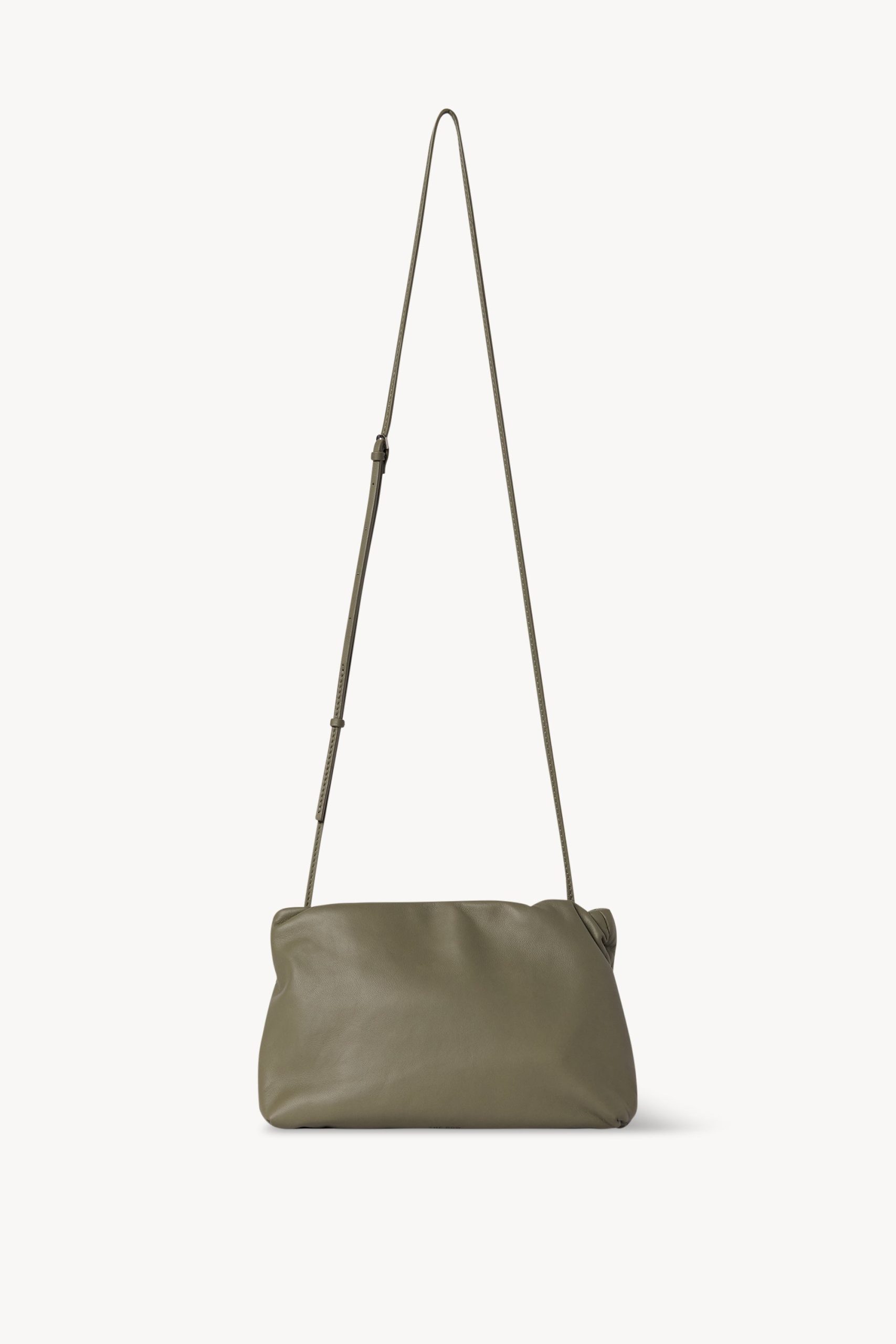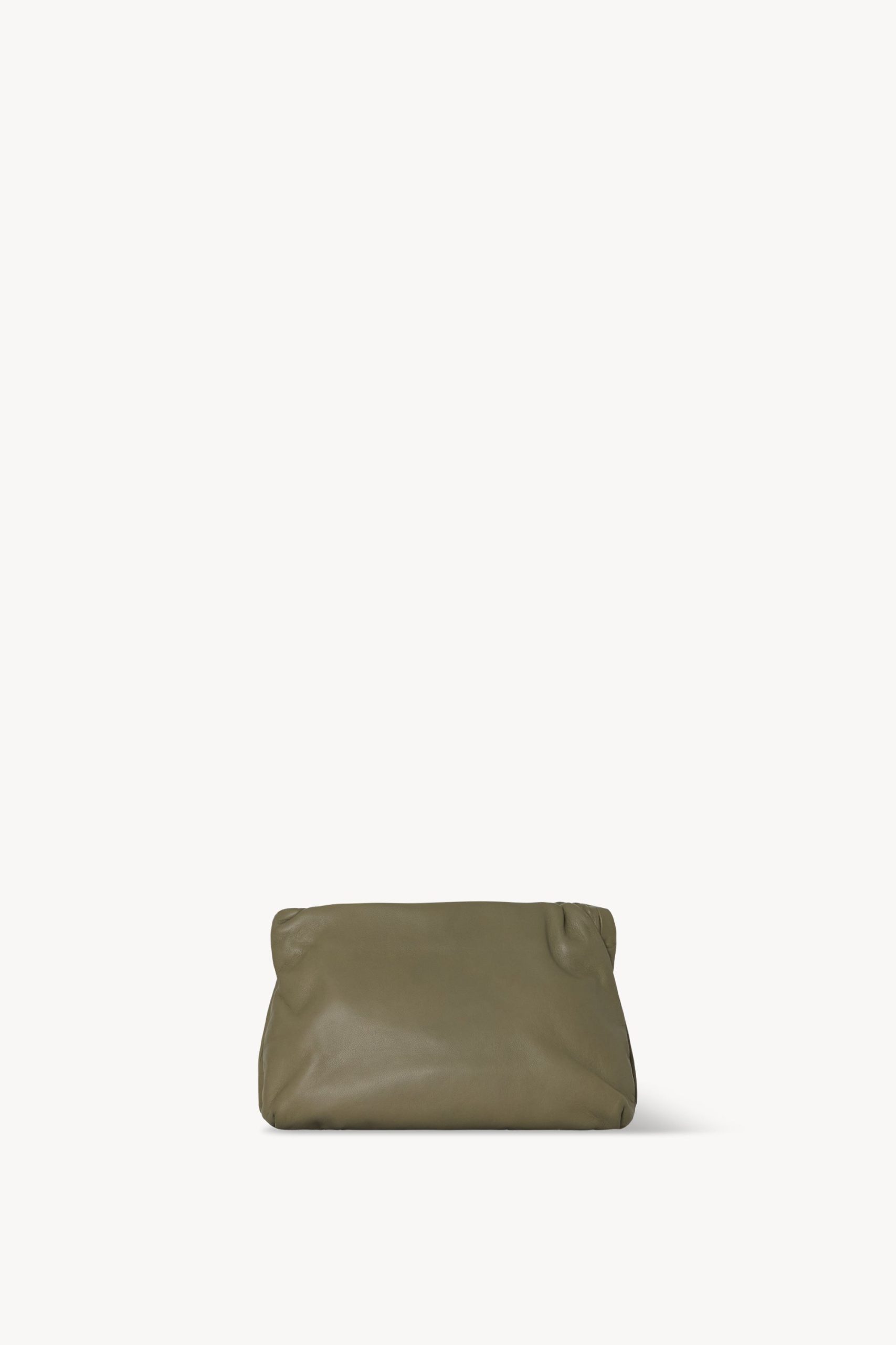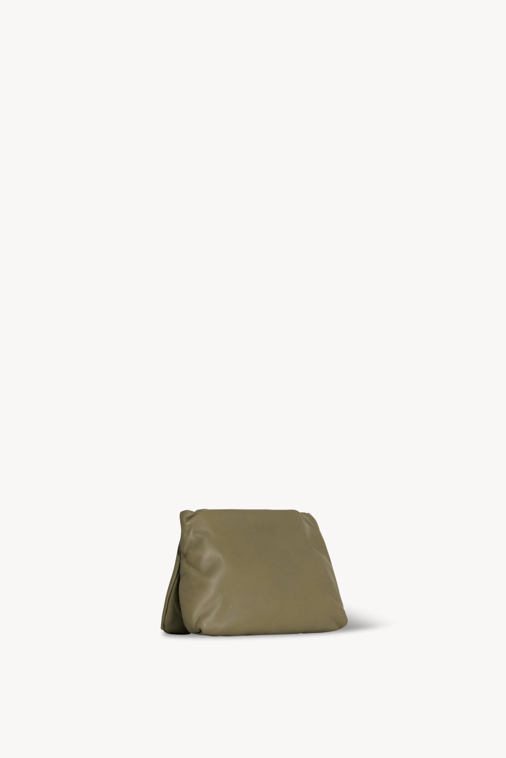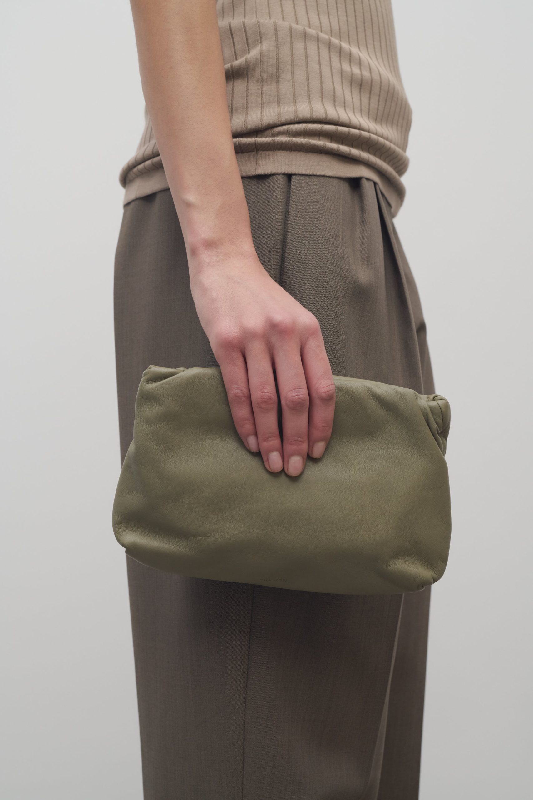 Ruched clutch in buttery lambskin leather with hidden adjustable shoulder strap and hinged frame closure.
