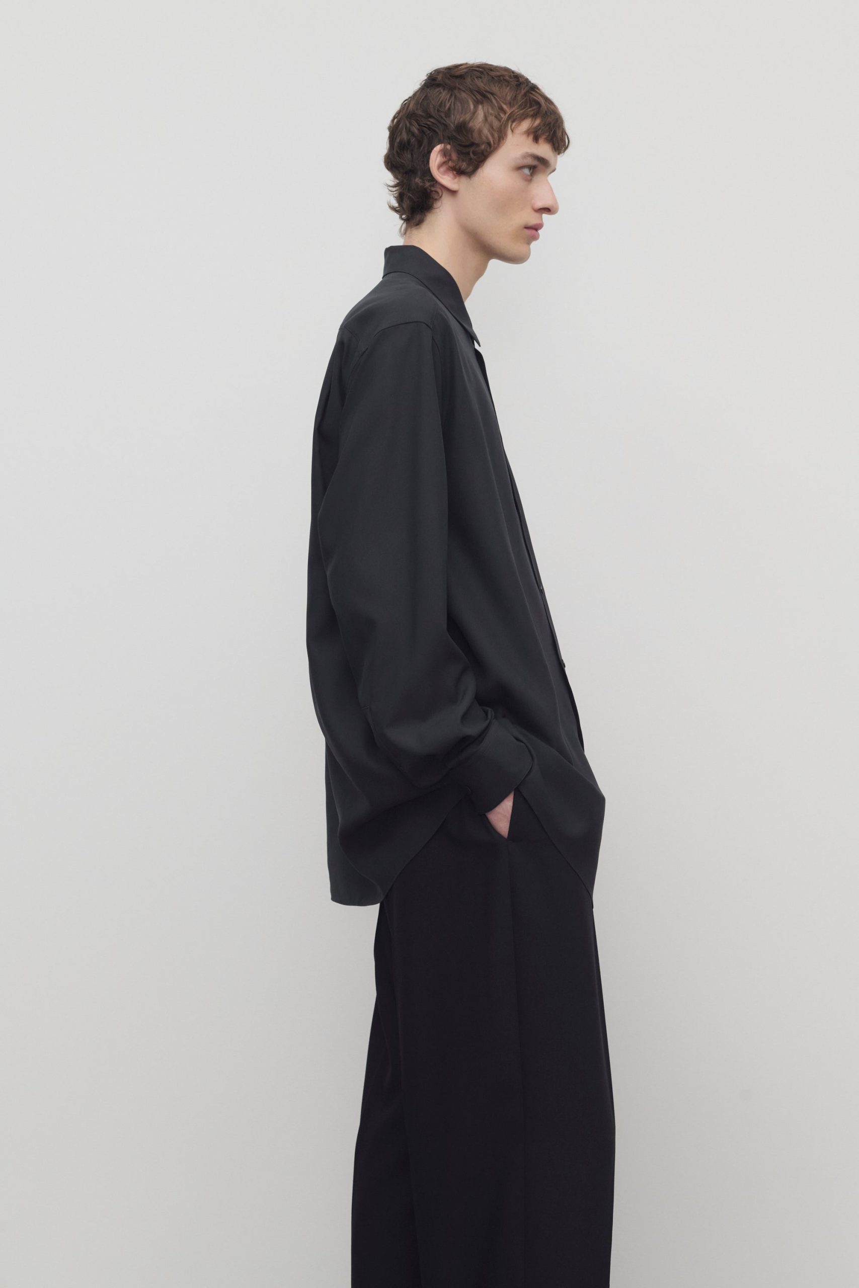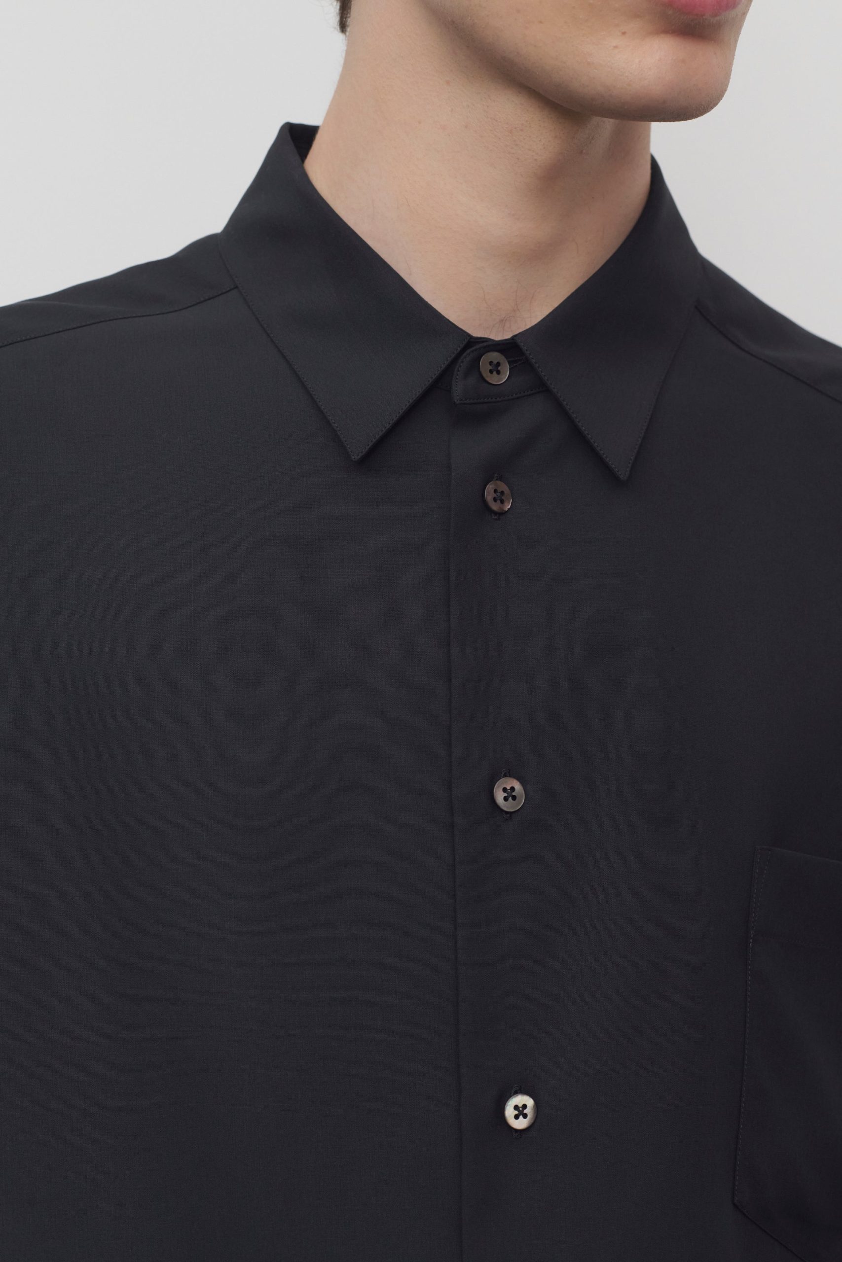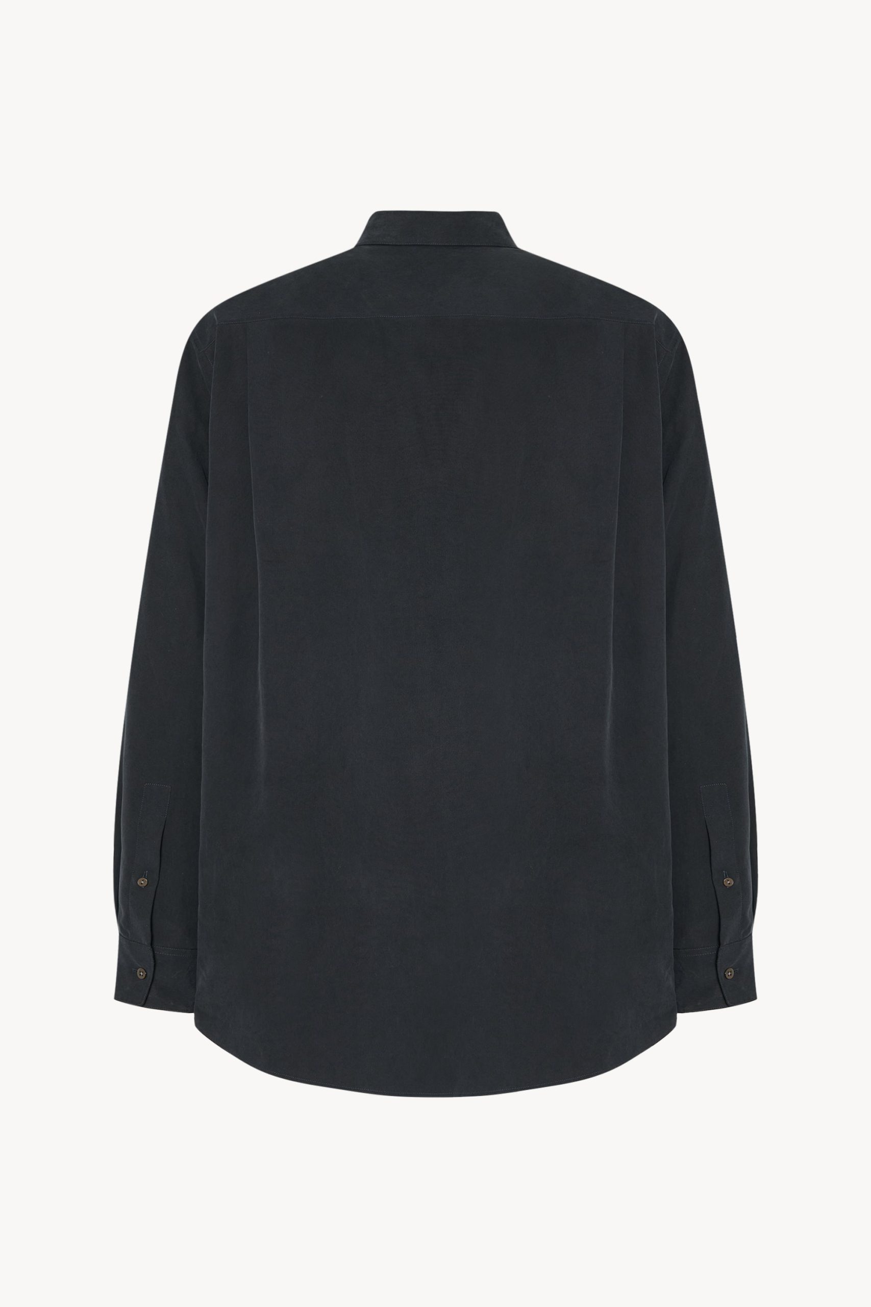 Classic button-up shirt in enzyme-washed silk with relaxed fit. front patch pocket. and exposed front placket with button closure.