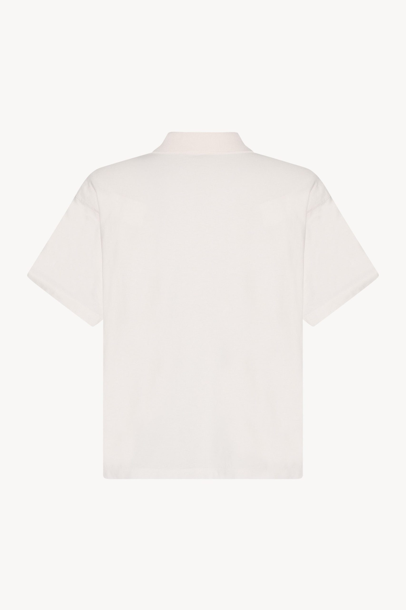 Short-sleeved polo top in midweight cotton jersey with boxy fit. ribbed collar. and exposed front button placket.