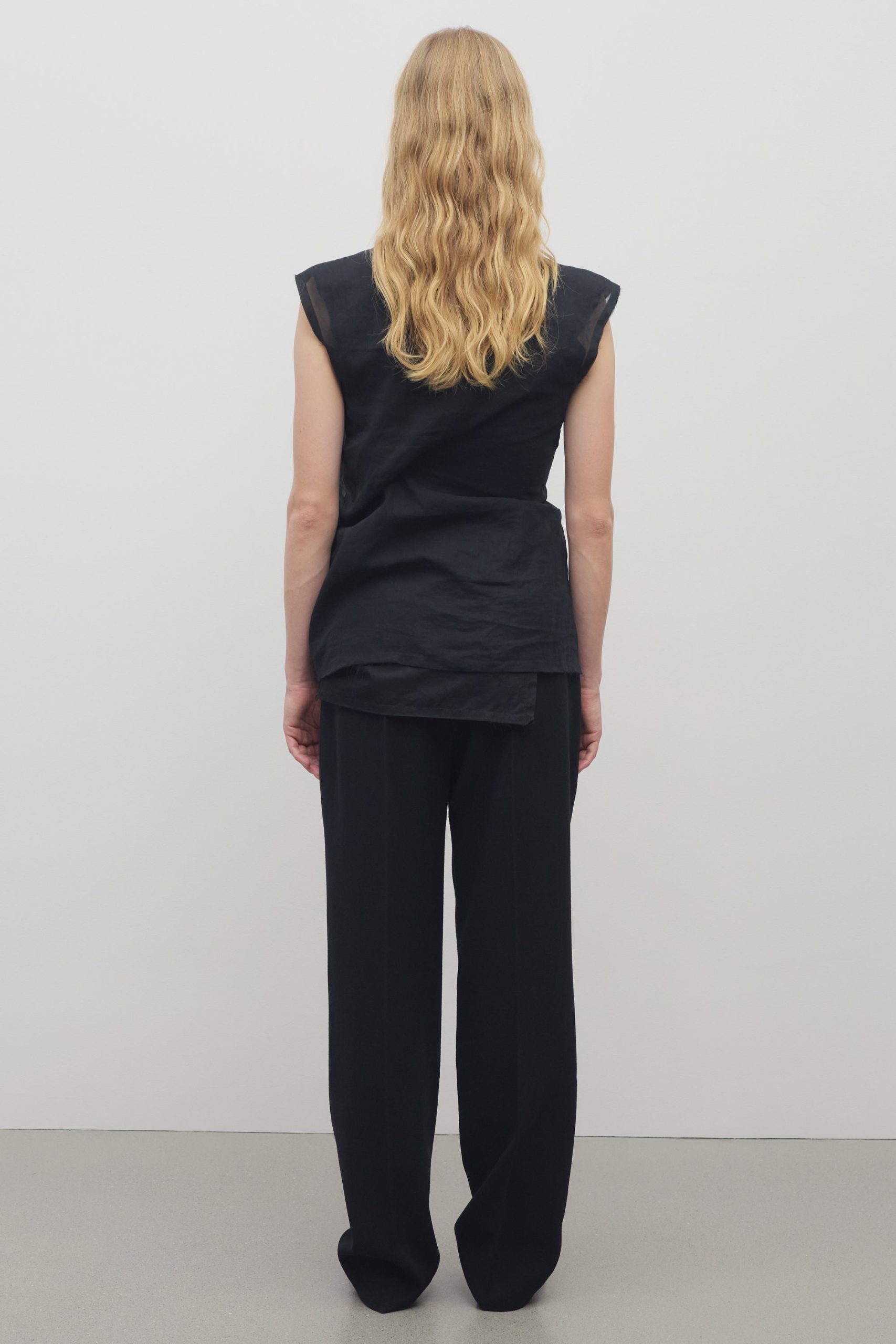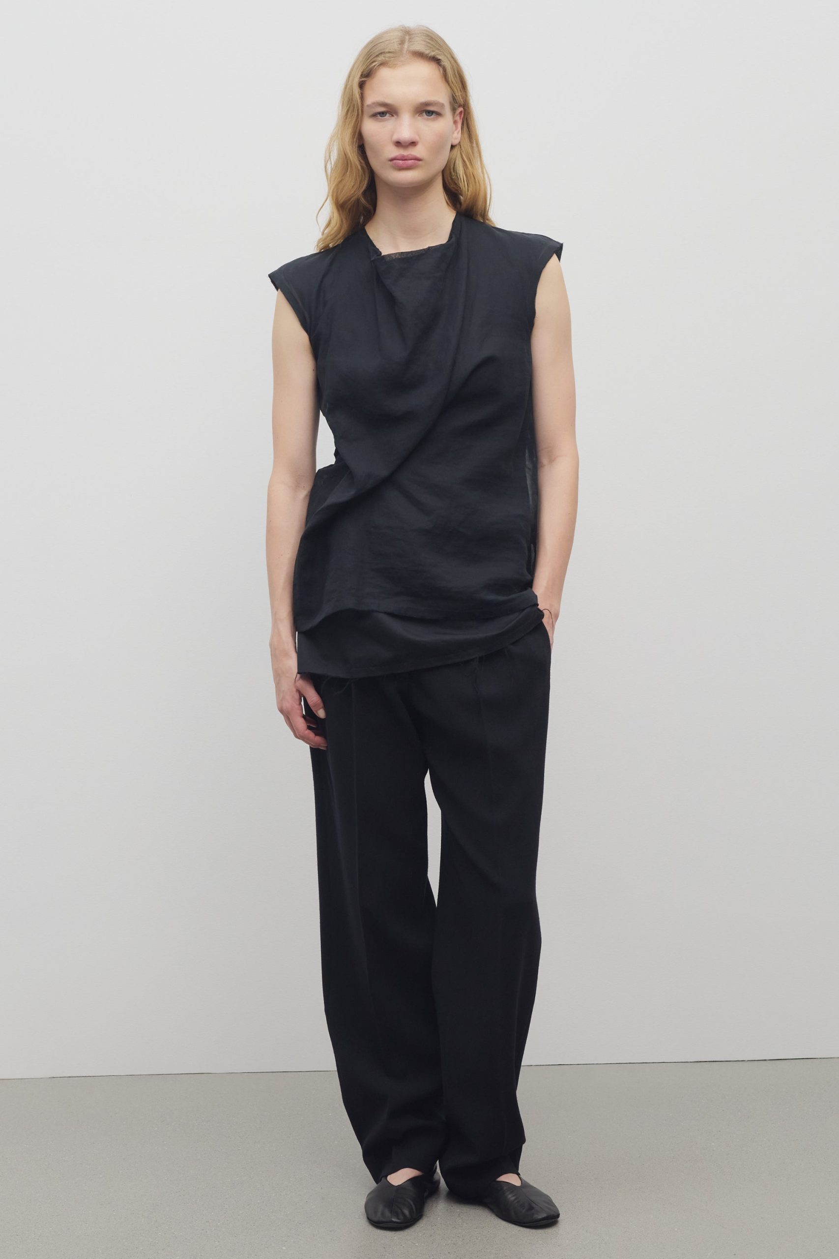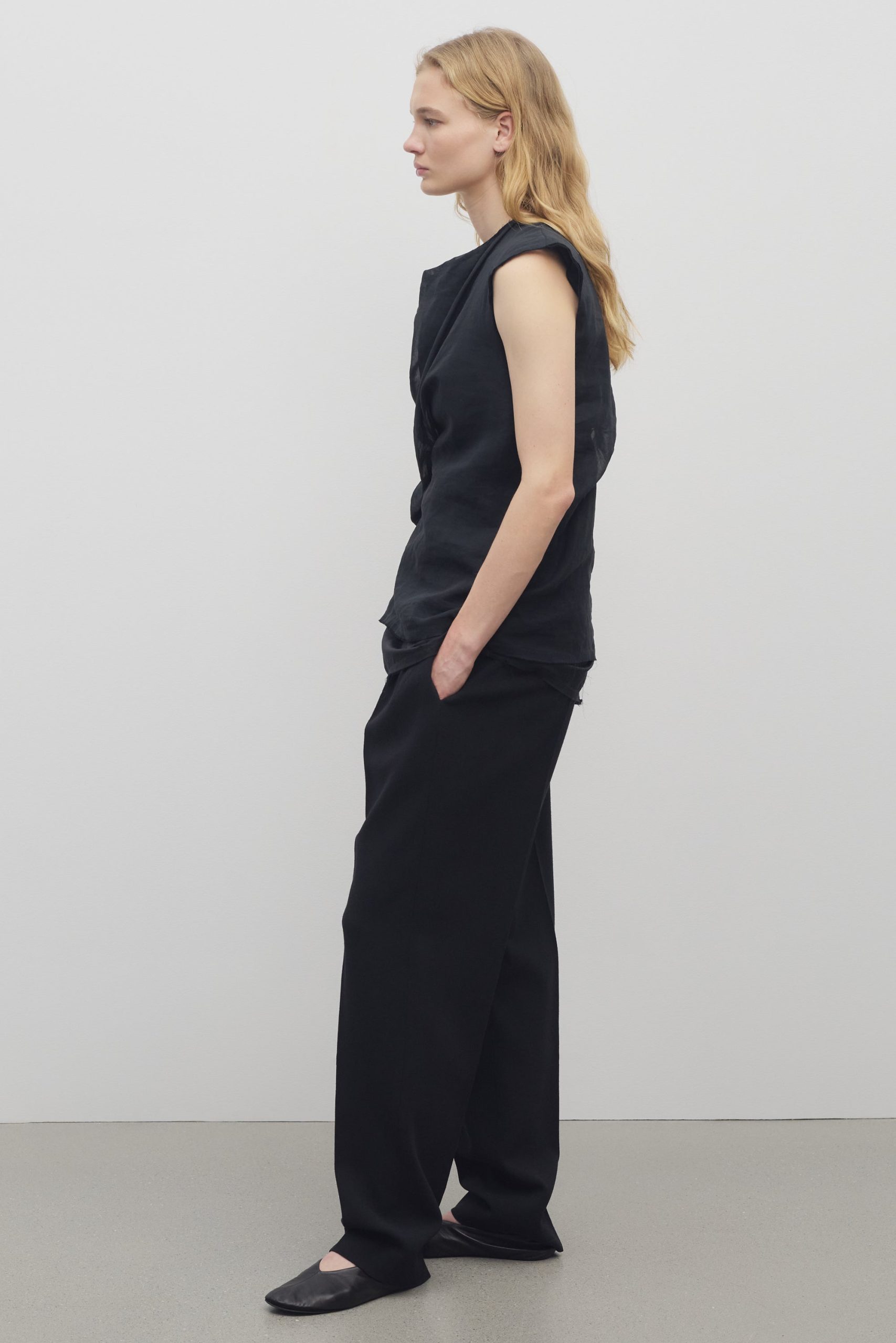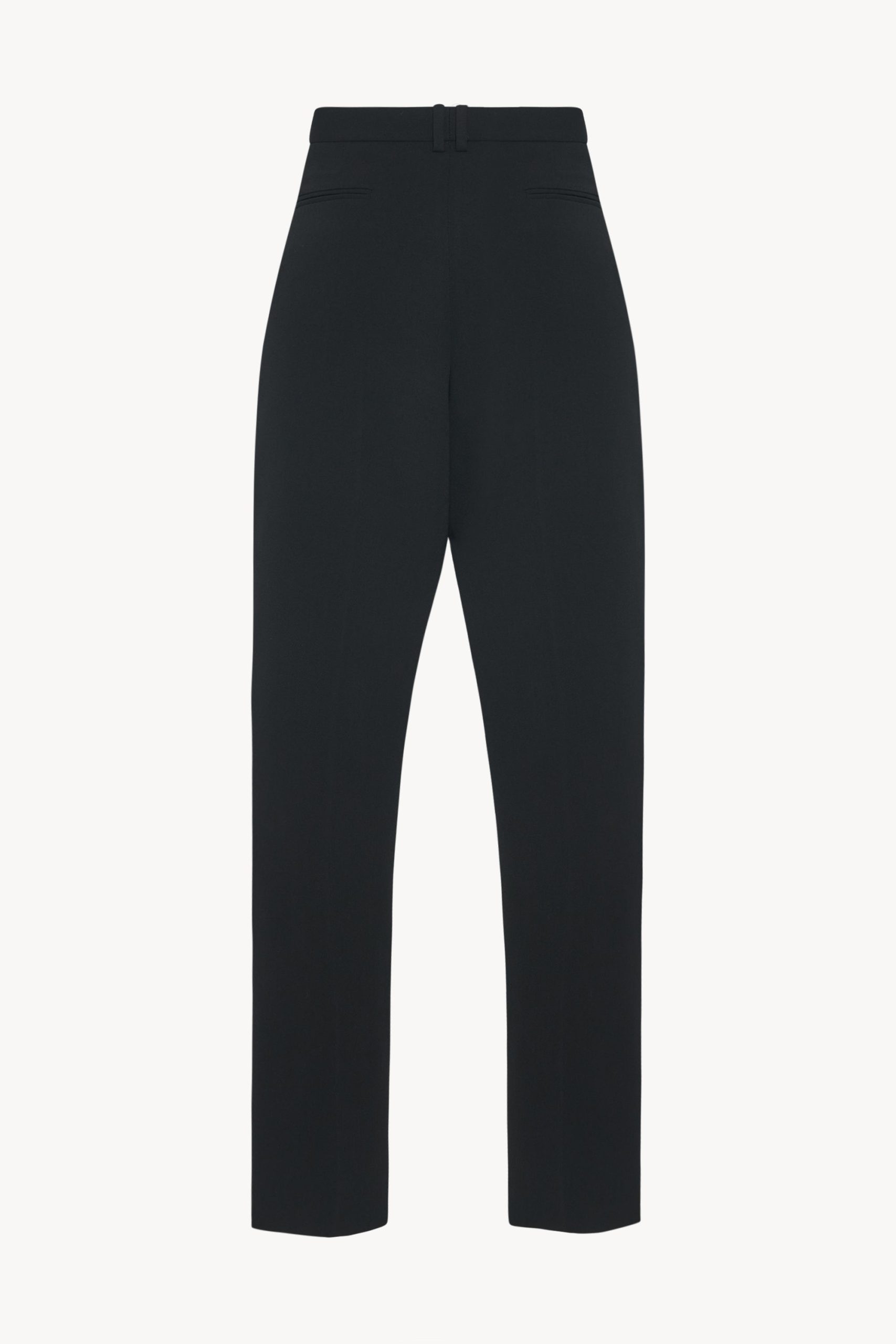 Mid-rise tailored trouser in textured wool tailoring with slightly tapered leg. front double pleats. and side seam pockets.