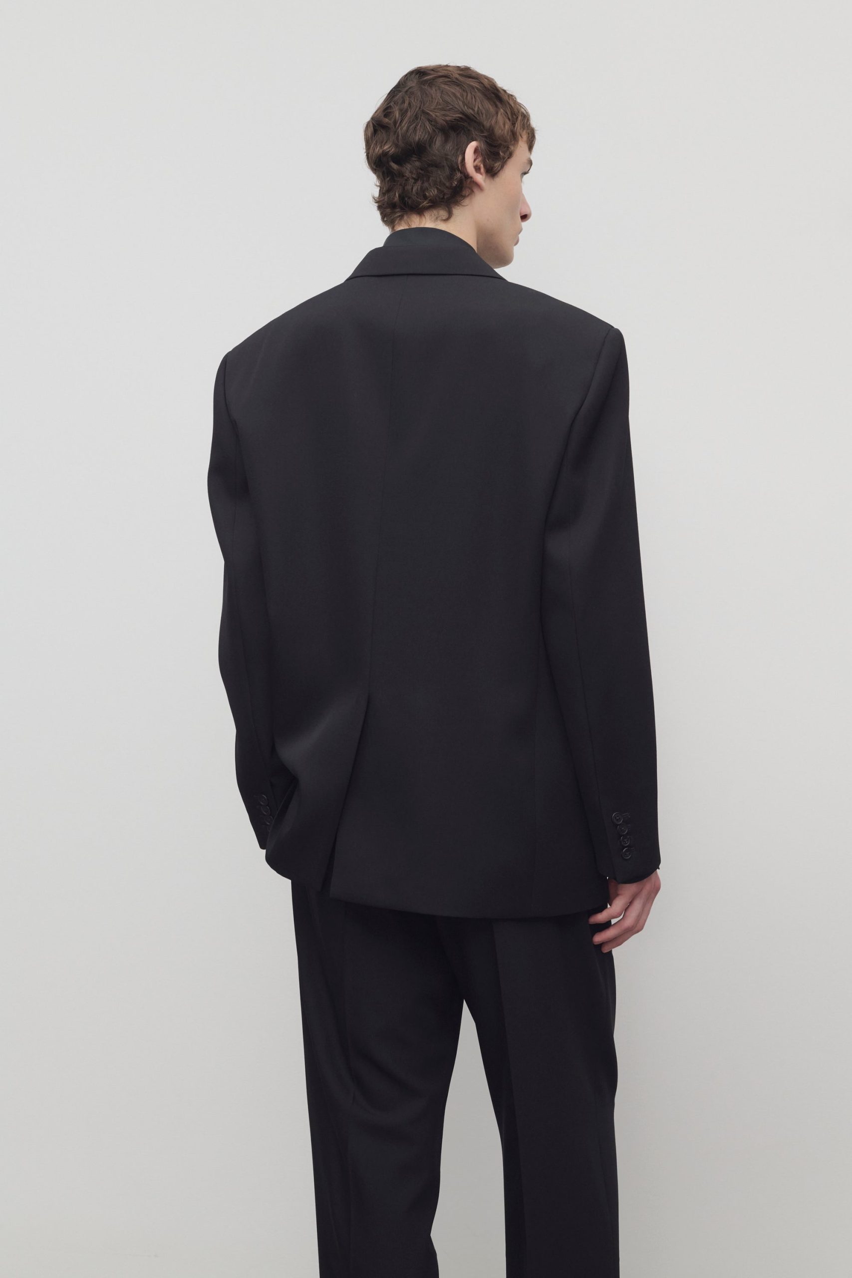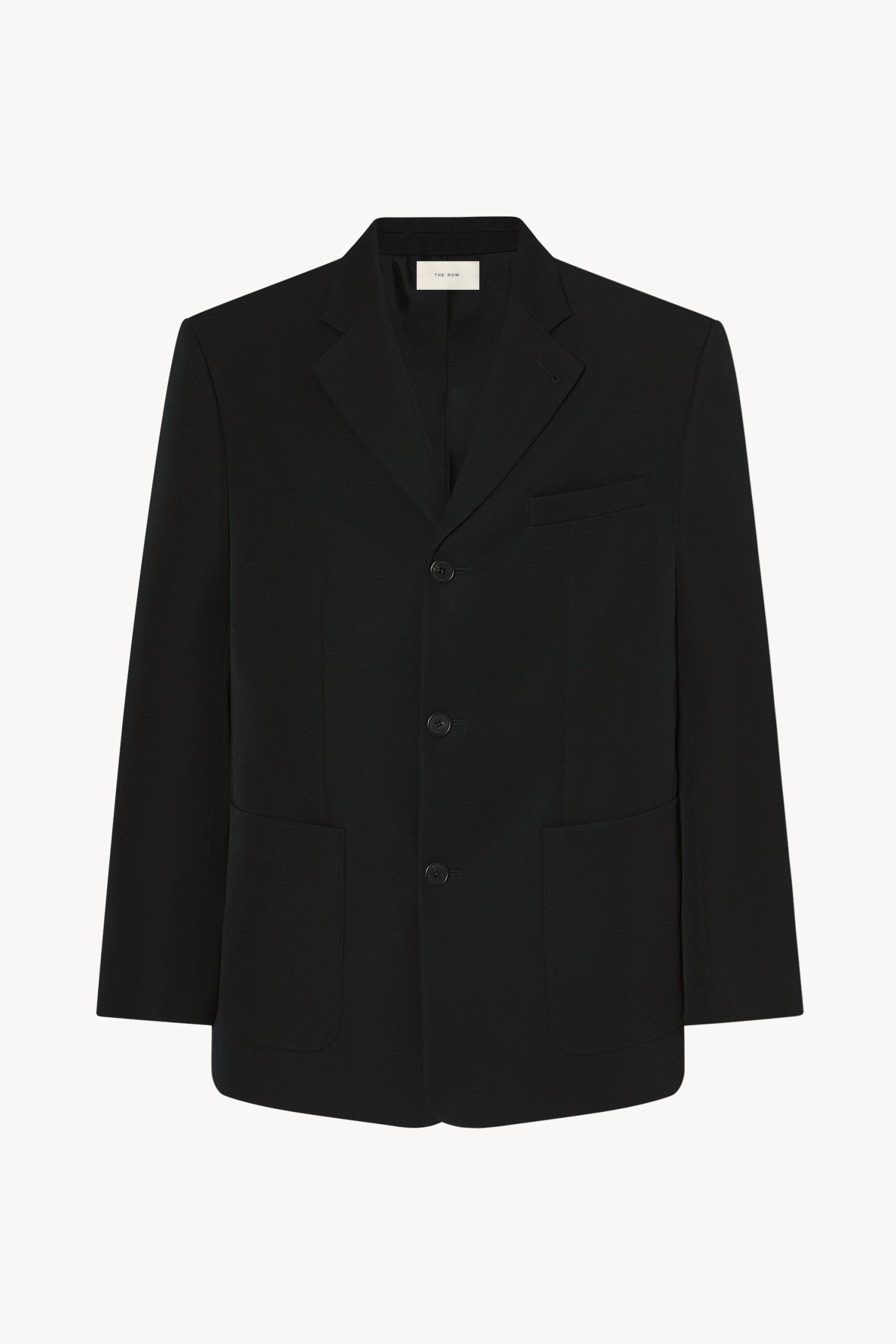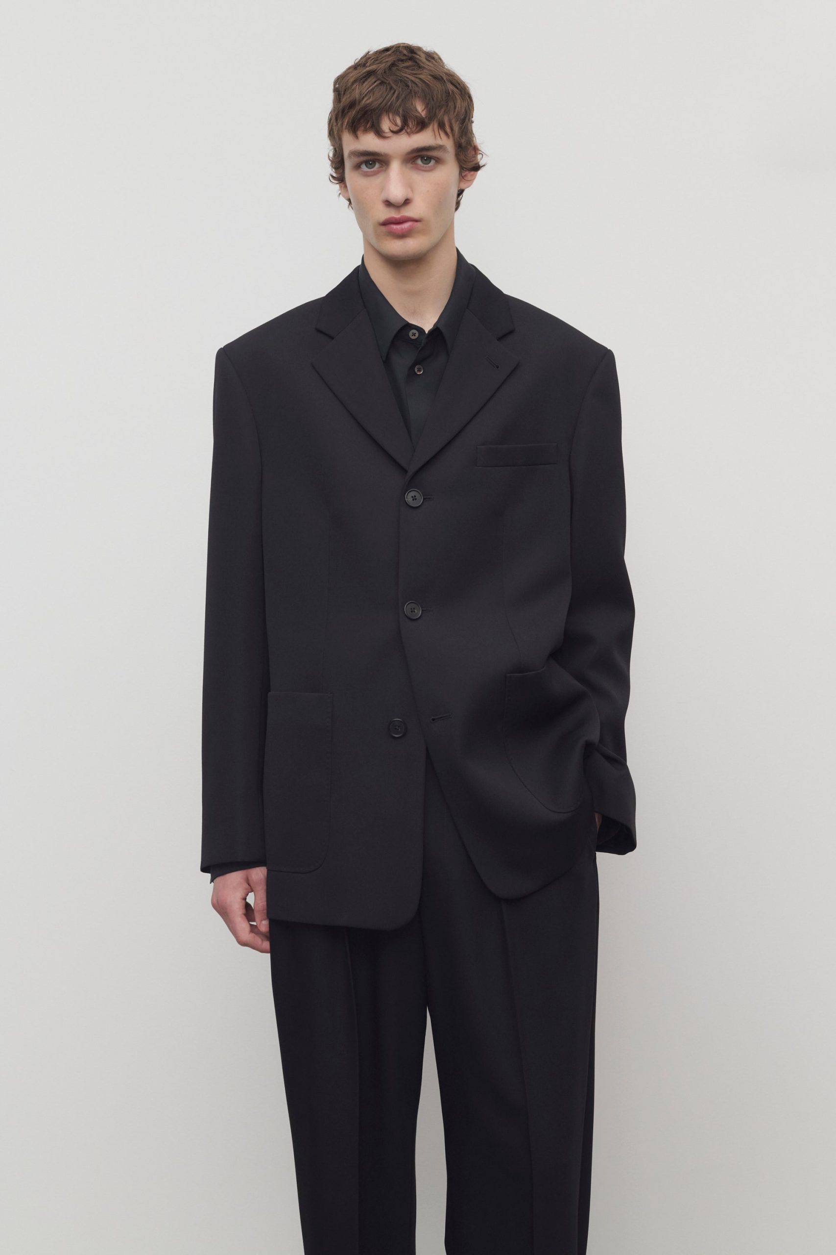 Single-breasted tailored jacket in Japanese wool gabardine with notch lapel. front patch pockets. and front button closure.