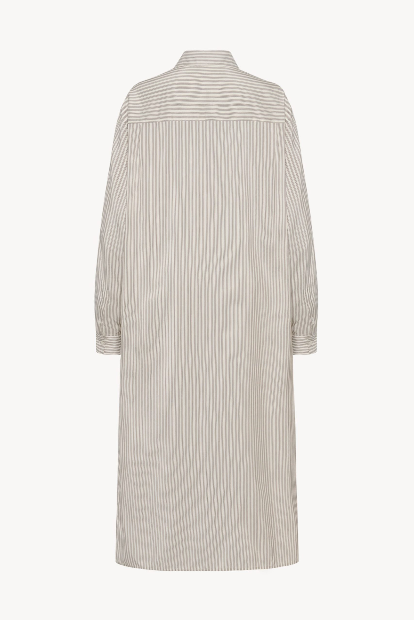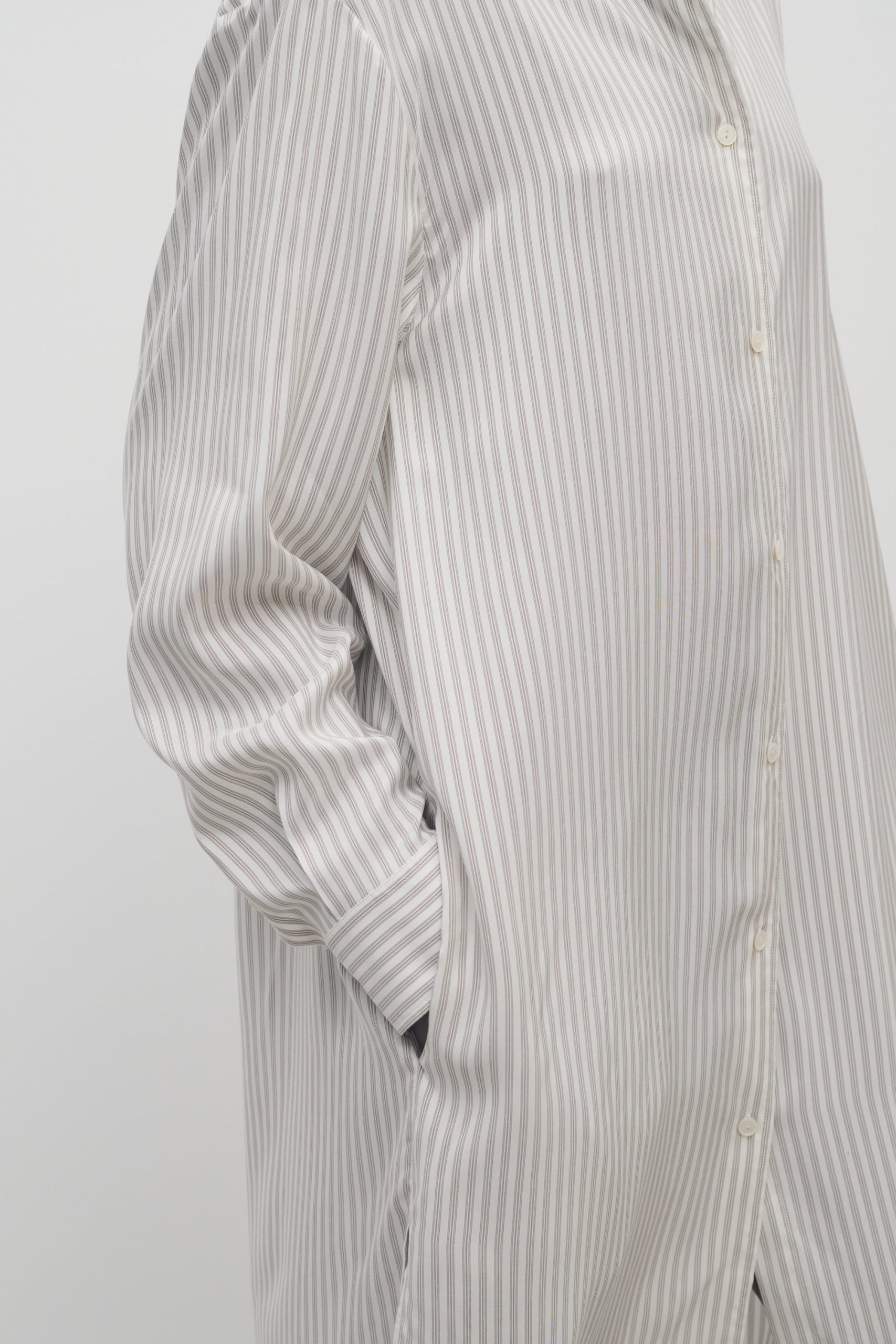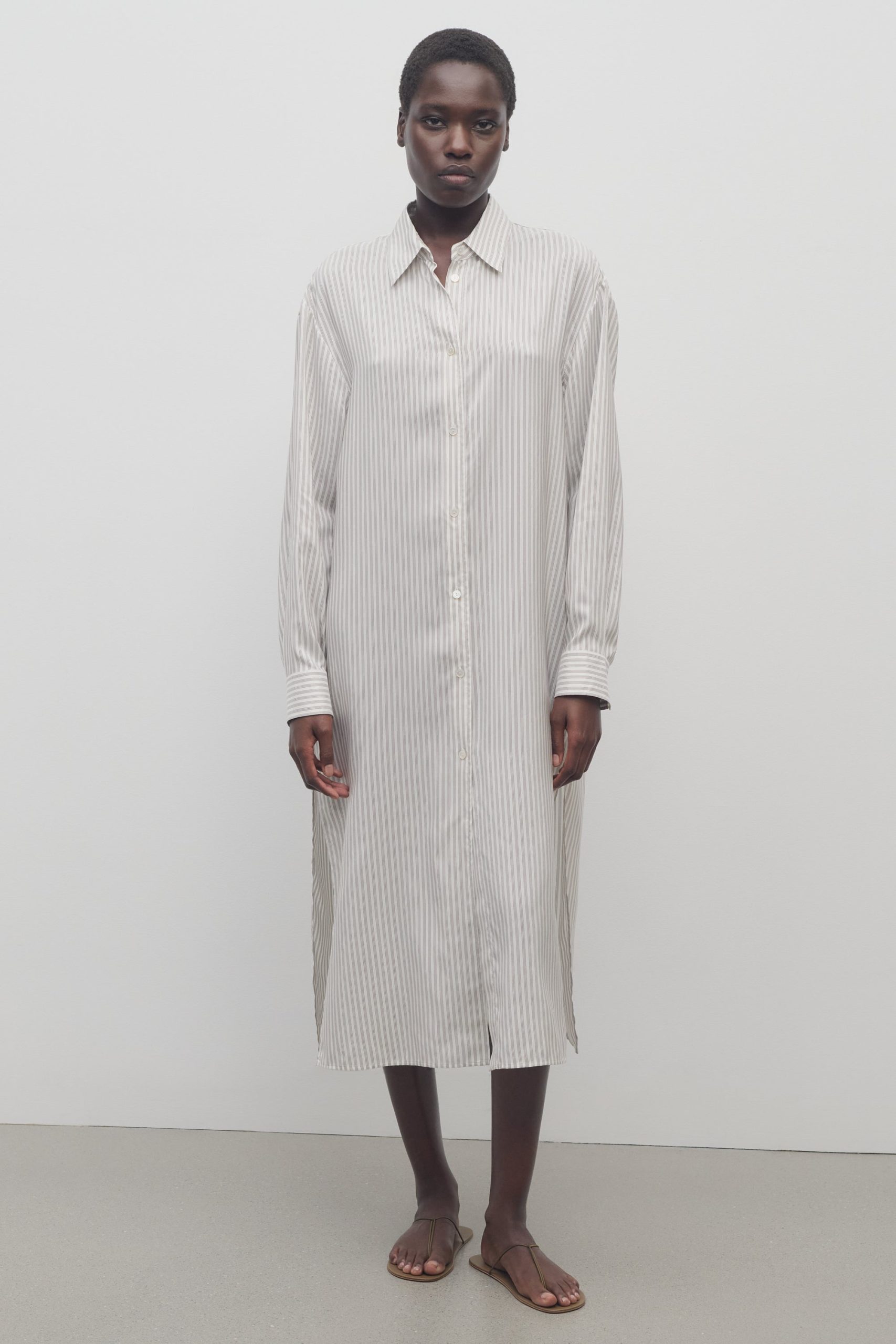 Calf-length shirtdress in fluid striped silk with side hem slits. exposed button placket. and straight fit.