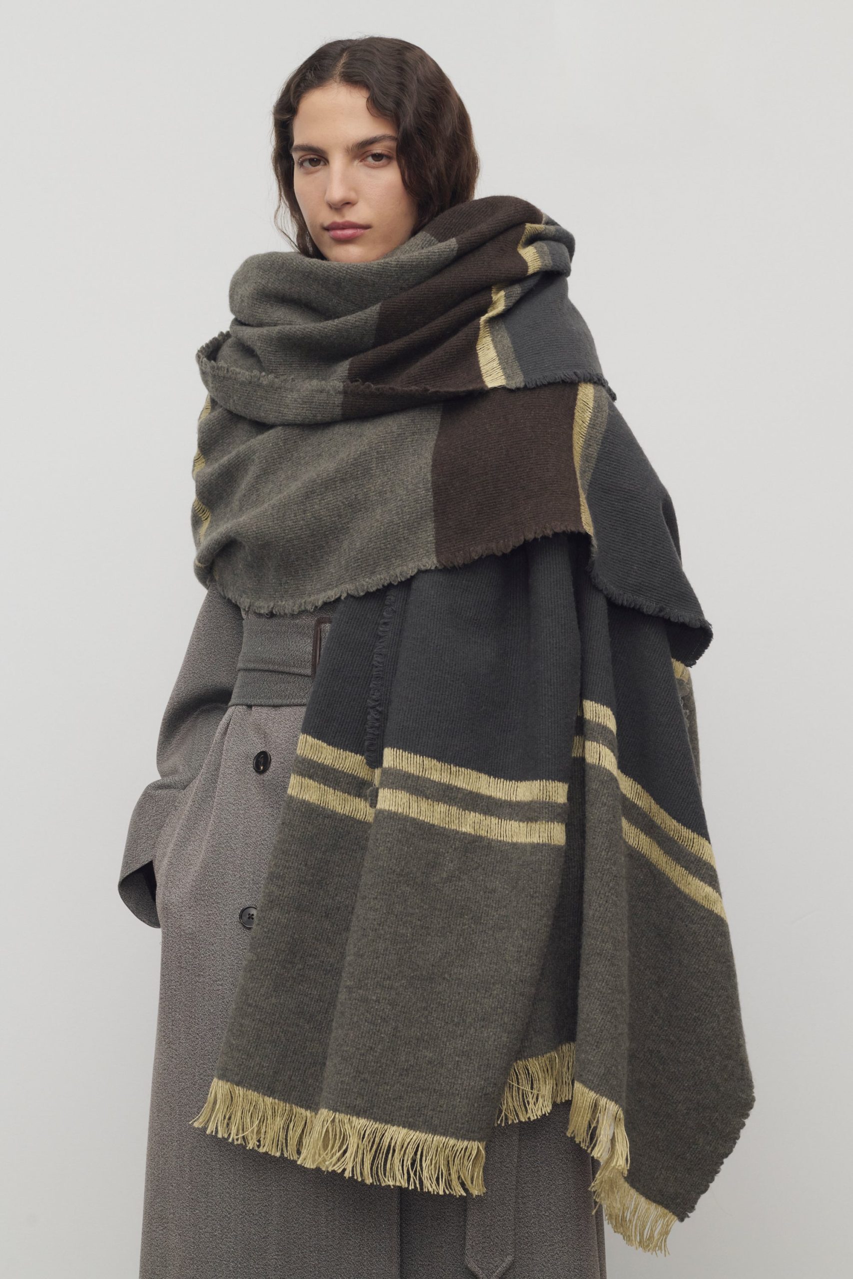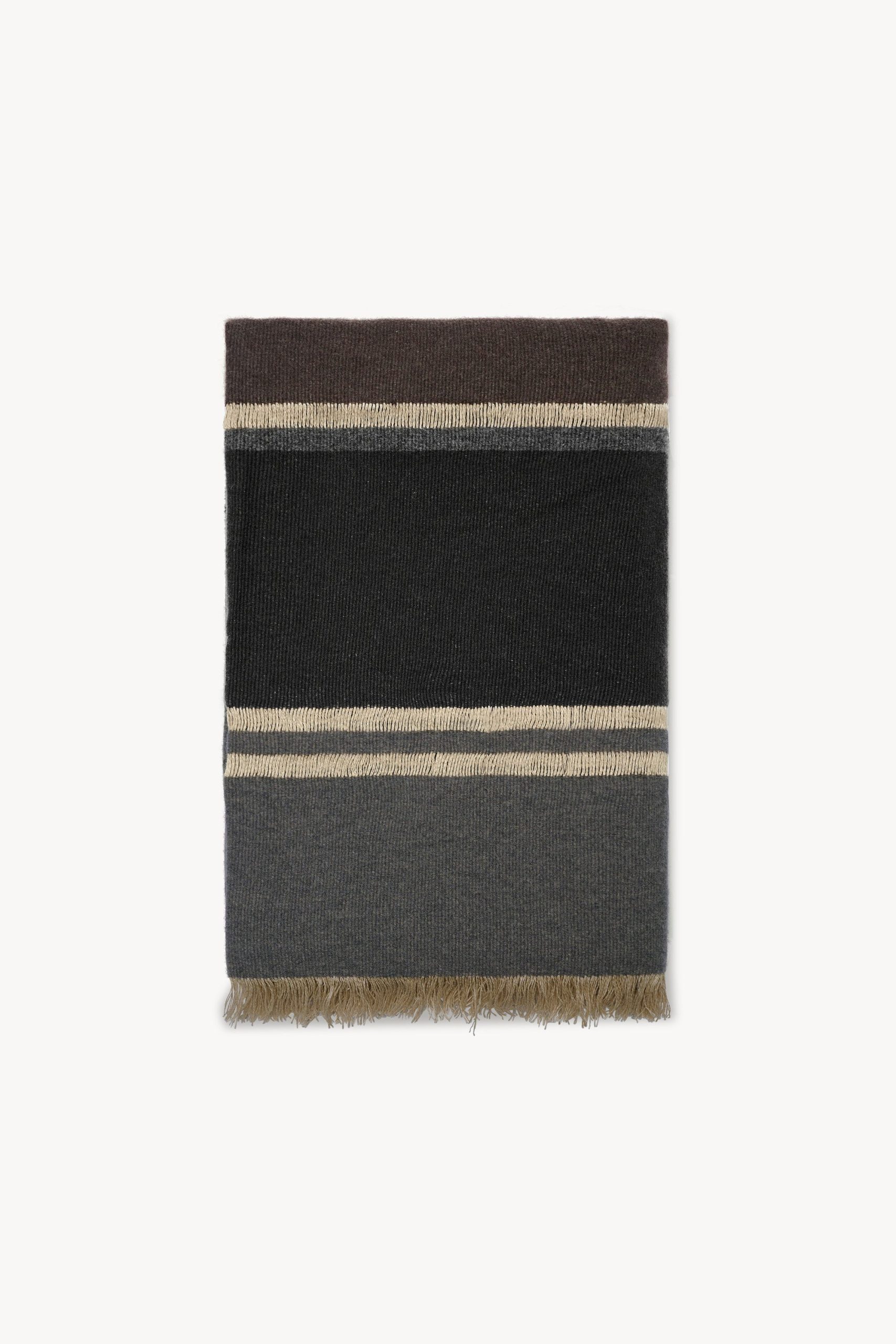 Wide stole in linen. wool. and cashmere with woven stripe motif and fringed finish.