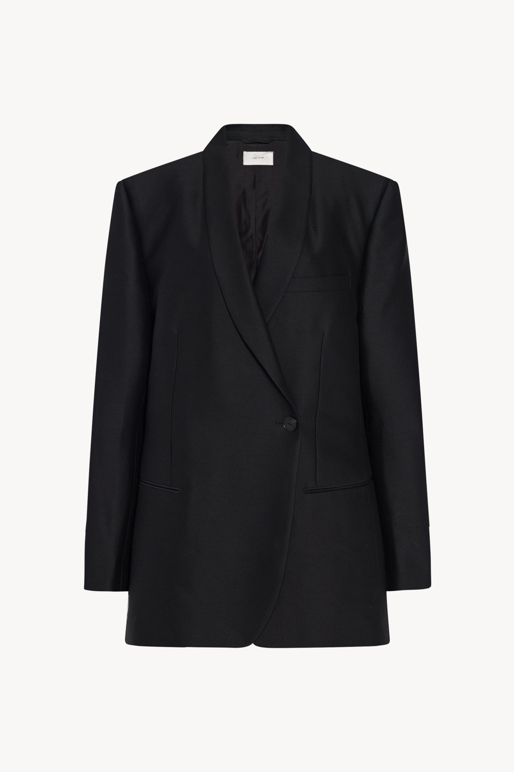 Double-breasted smoking jacket in lightweight wool and silk suiting with double horn button closure. front chest and besom pockets. and regular fit.