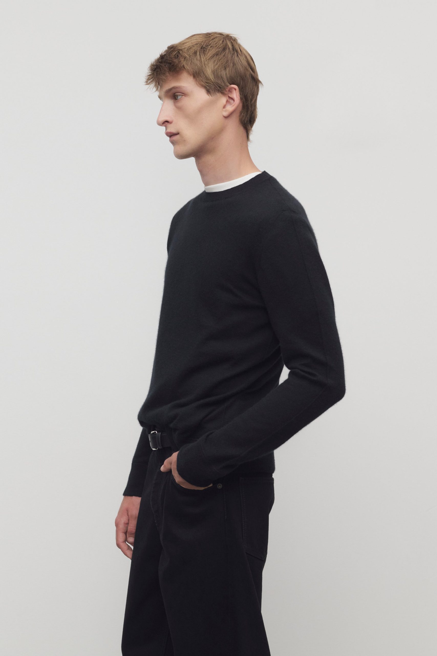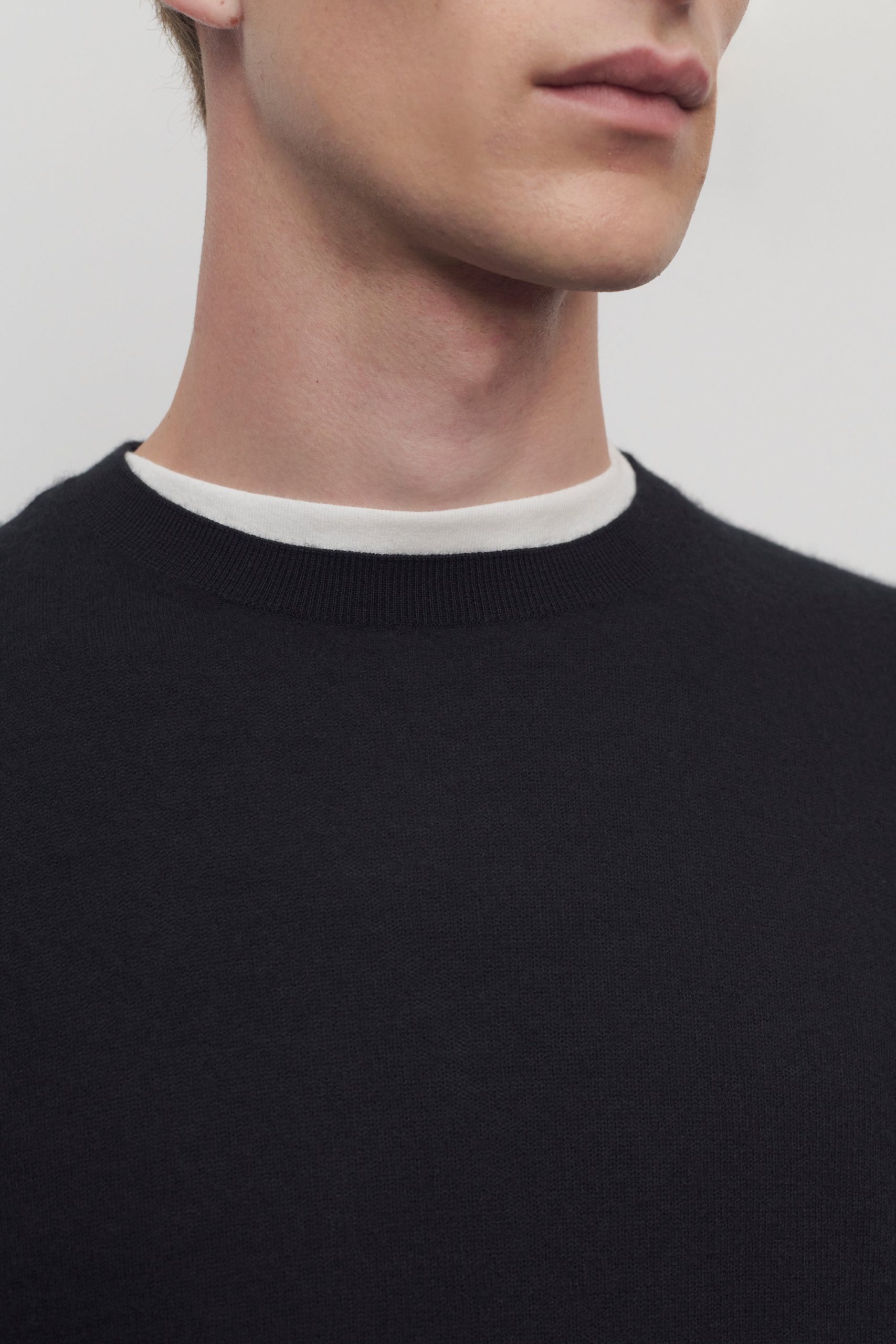 Classic crewneck sweater in ultrafine cashmere jersey with relaxed fit. covered stitch detailing. and ribbed neckline. cuffs. and hem.