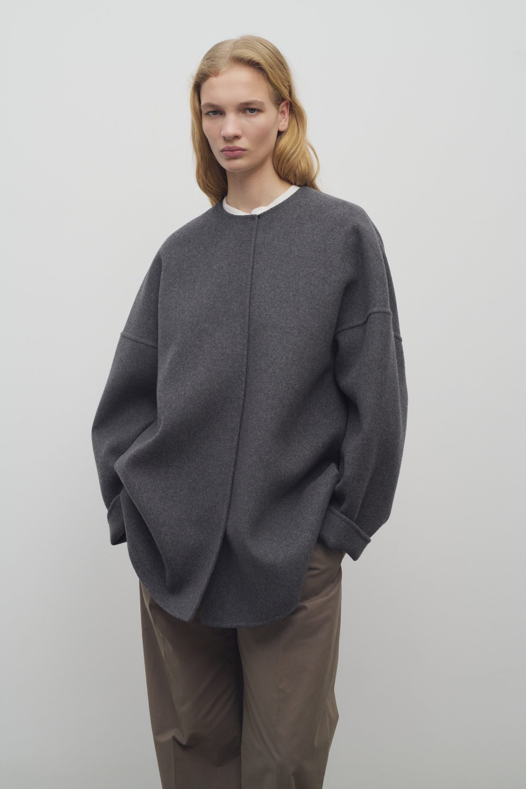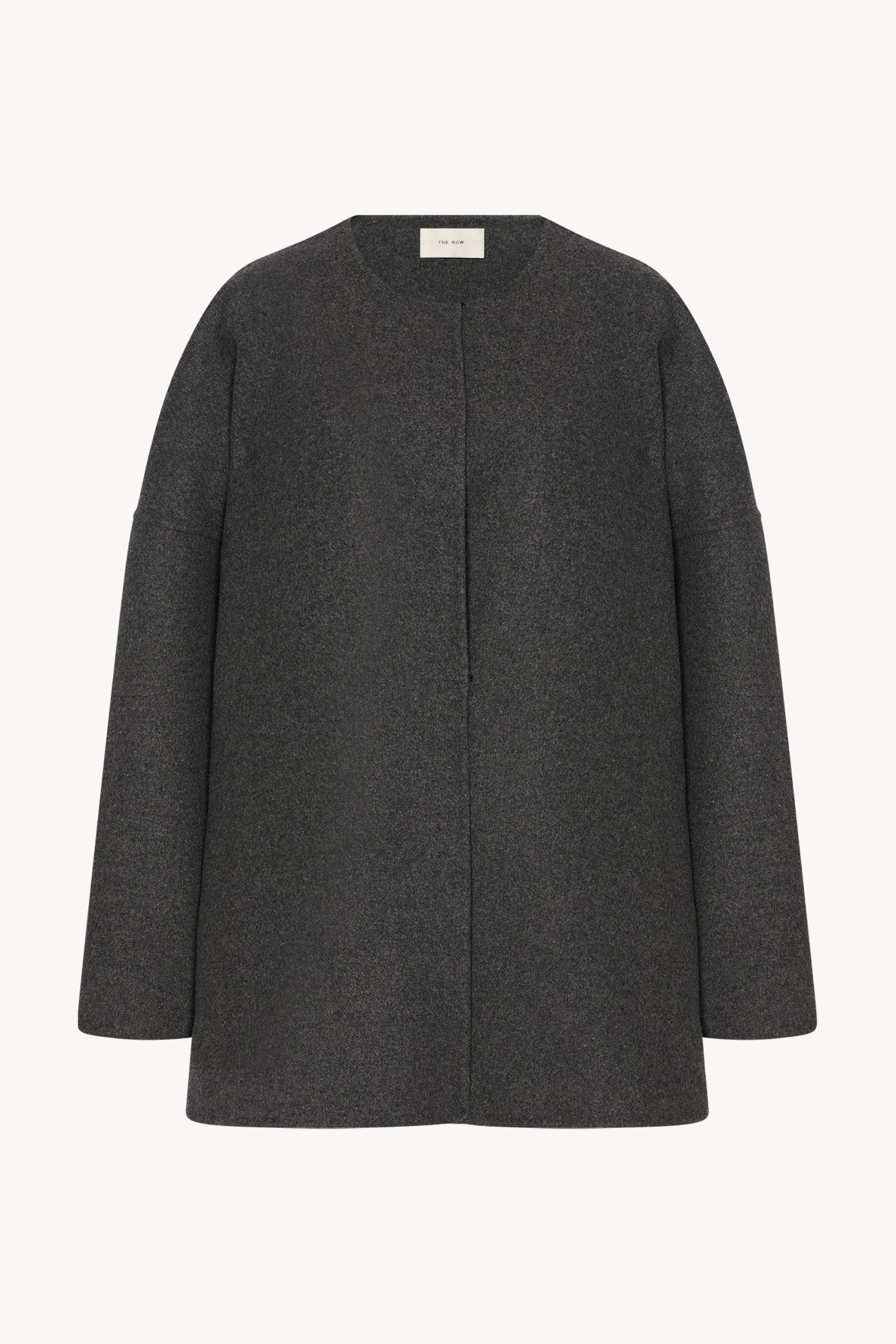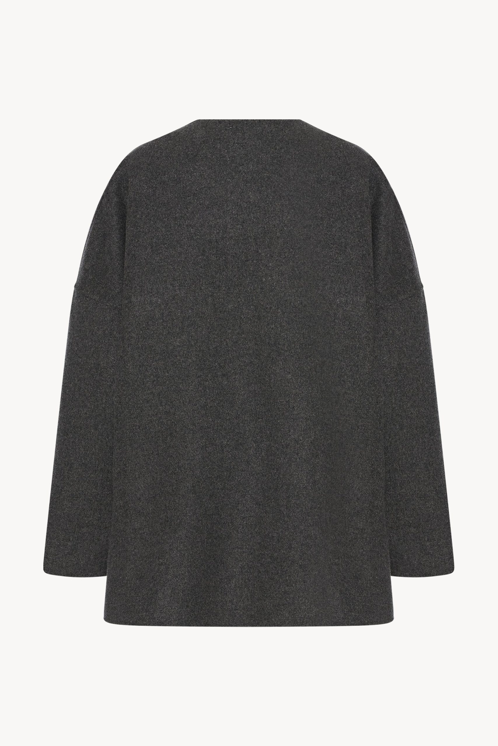 Oversized hand-crafted jacket in double-faced cashmere with dropped shoulders. side seam pockets. and concealed hook and eye closure.