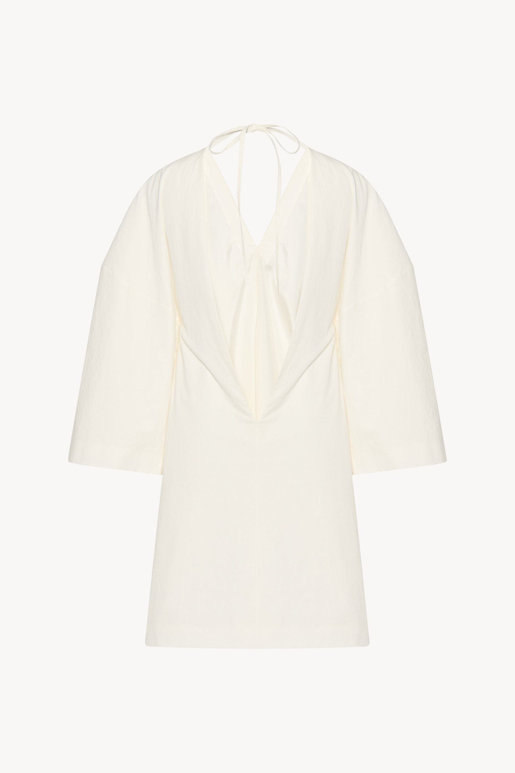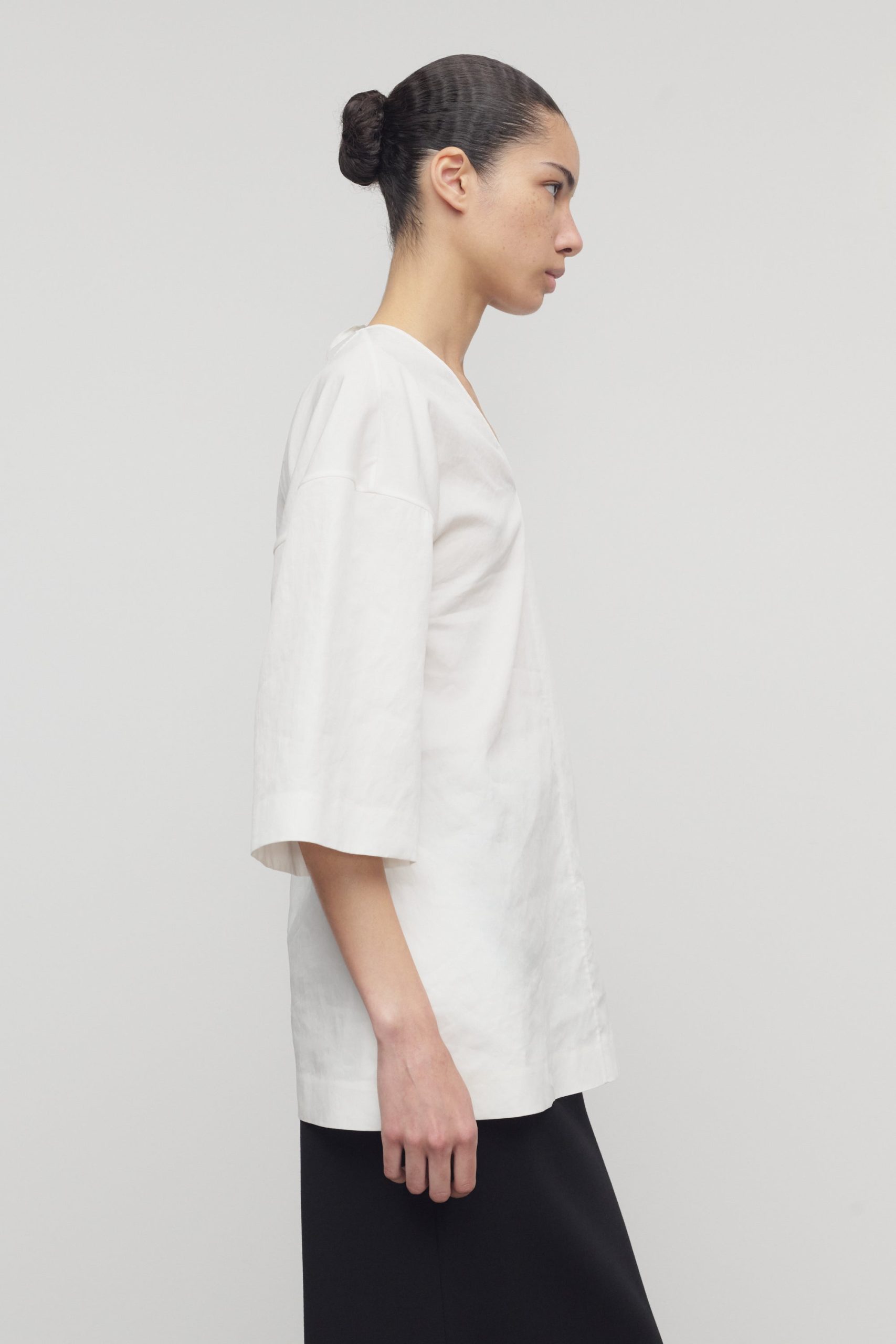 Elongated v-neck top in matte crisp cotton with dropped shoulders. draped low back. and slim tie at back neckline.