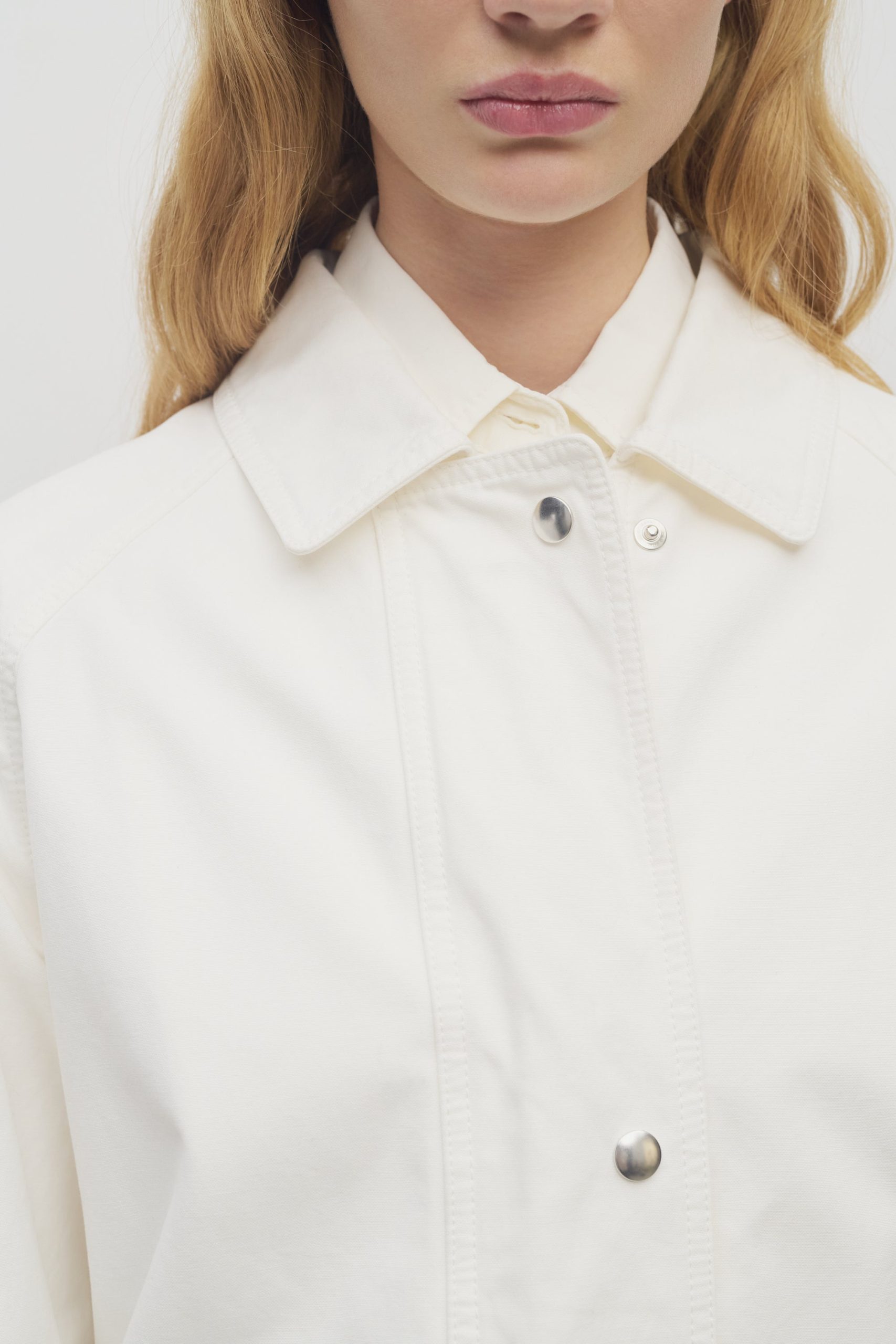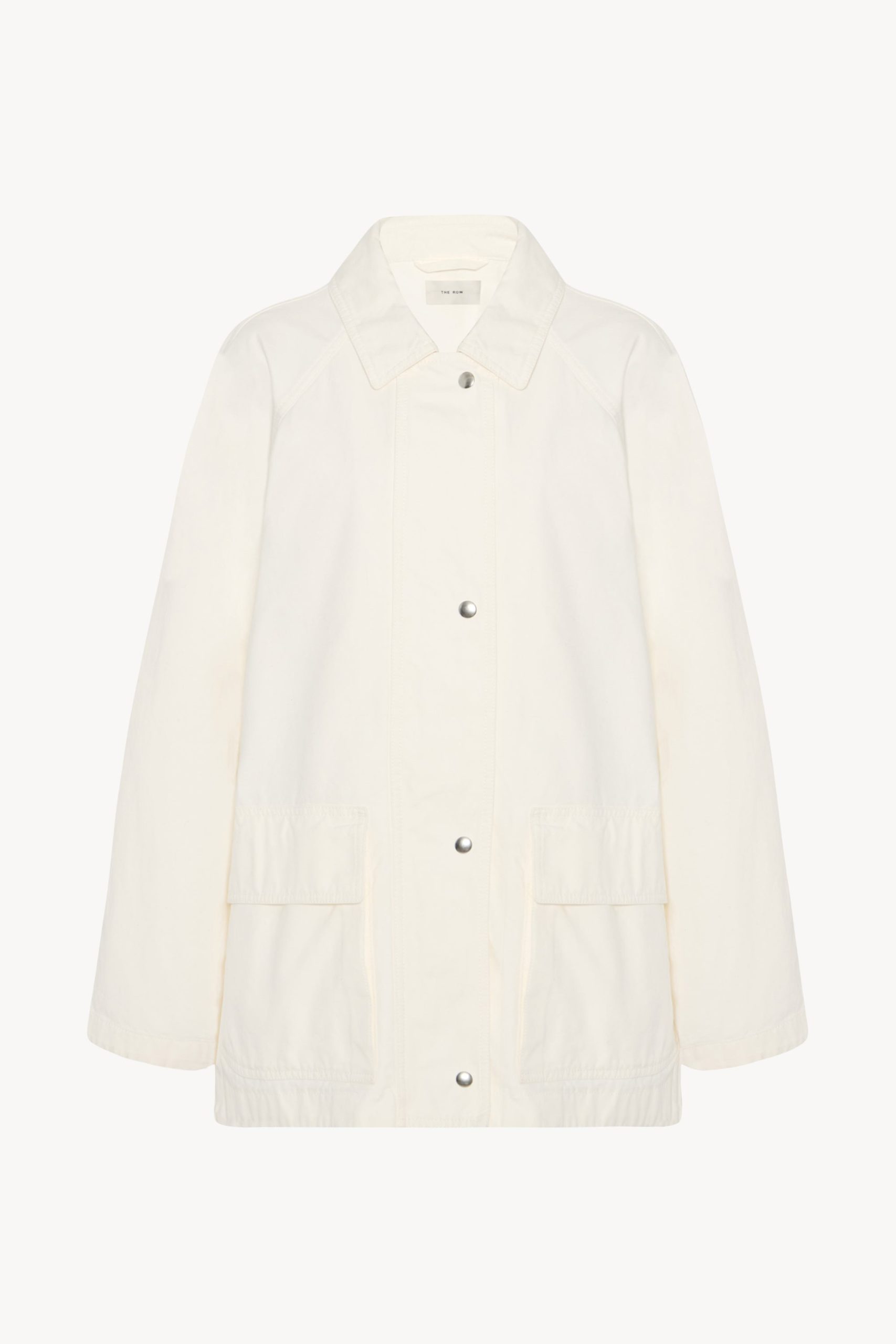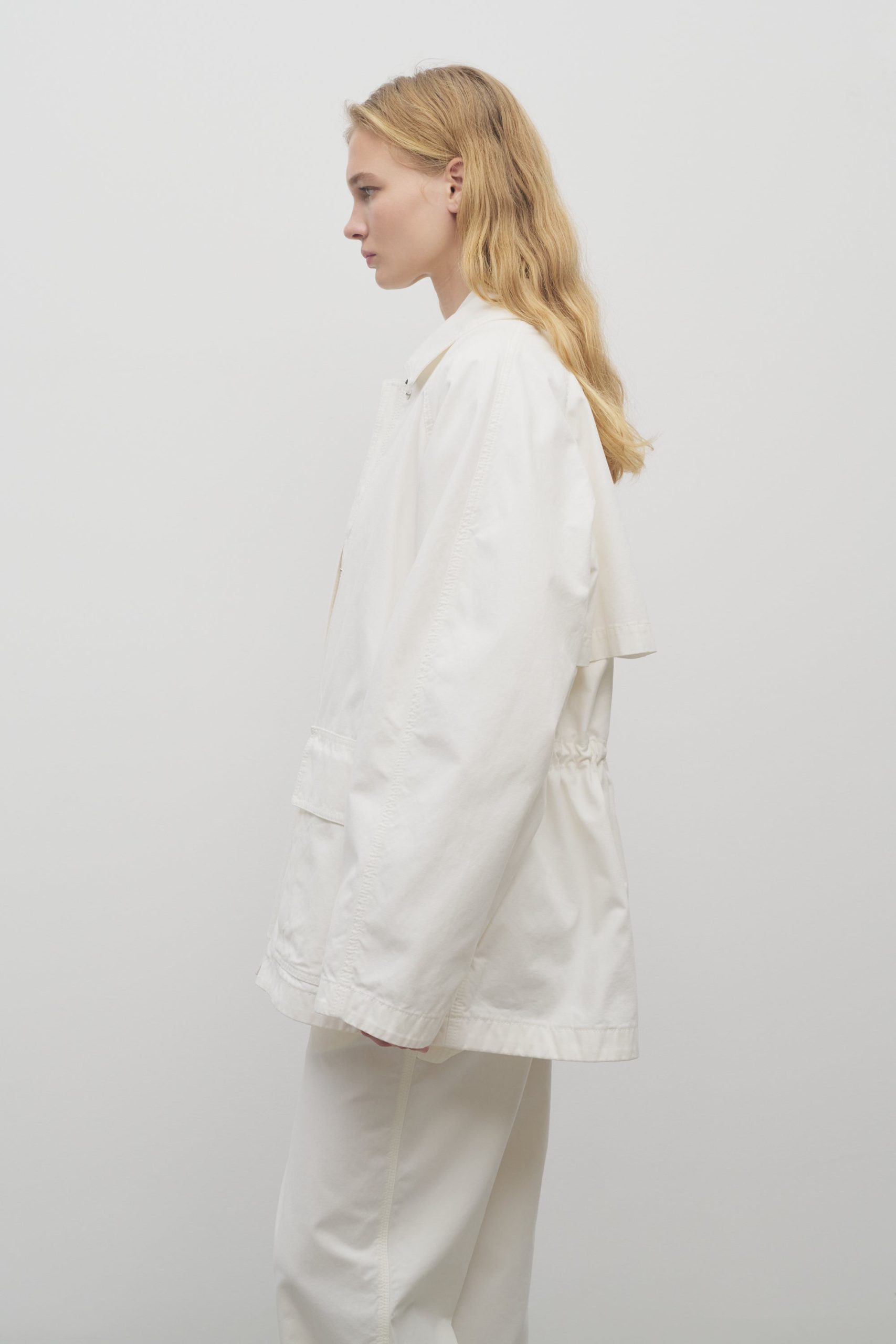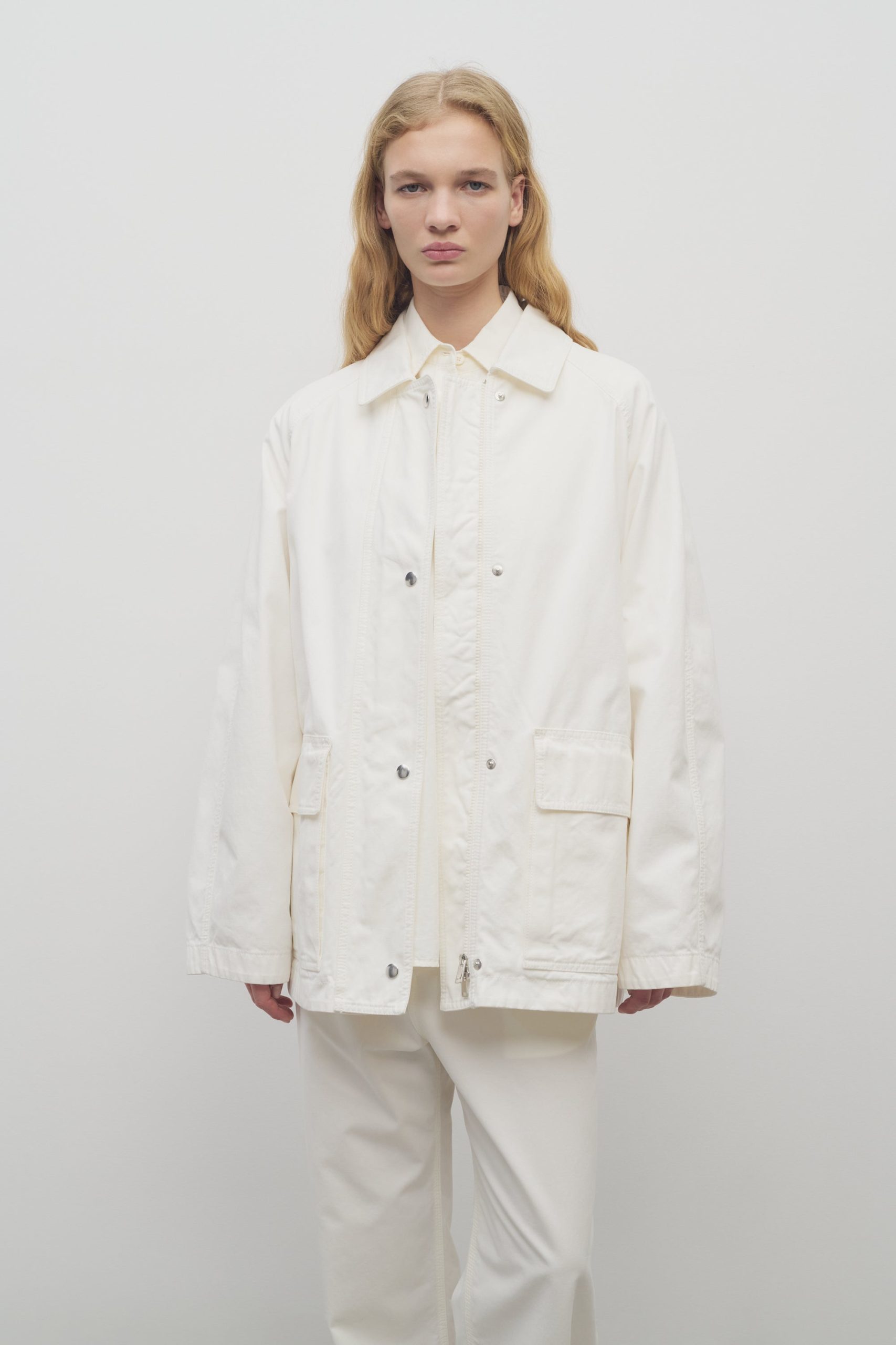 Outdoor jacket in washed Japanese cotton canvas with back storm flap. front patch pockets. and concealed front placket with snap and zipper closure.