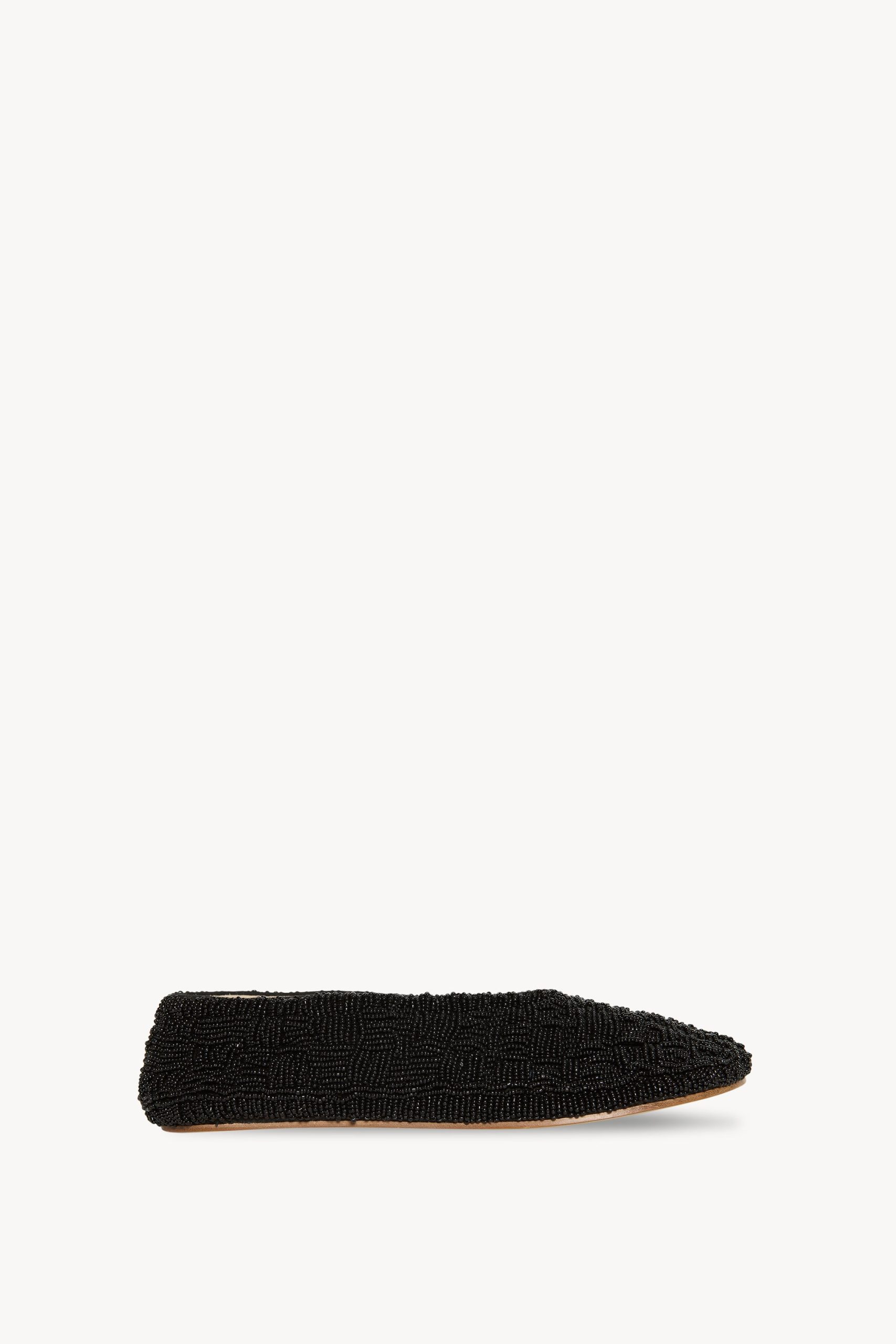 Slip-on shoe in supple goatskin leather with center front seam. hand-embroidered glass beadwork. and flexible leather sole.
