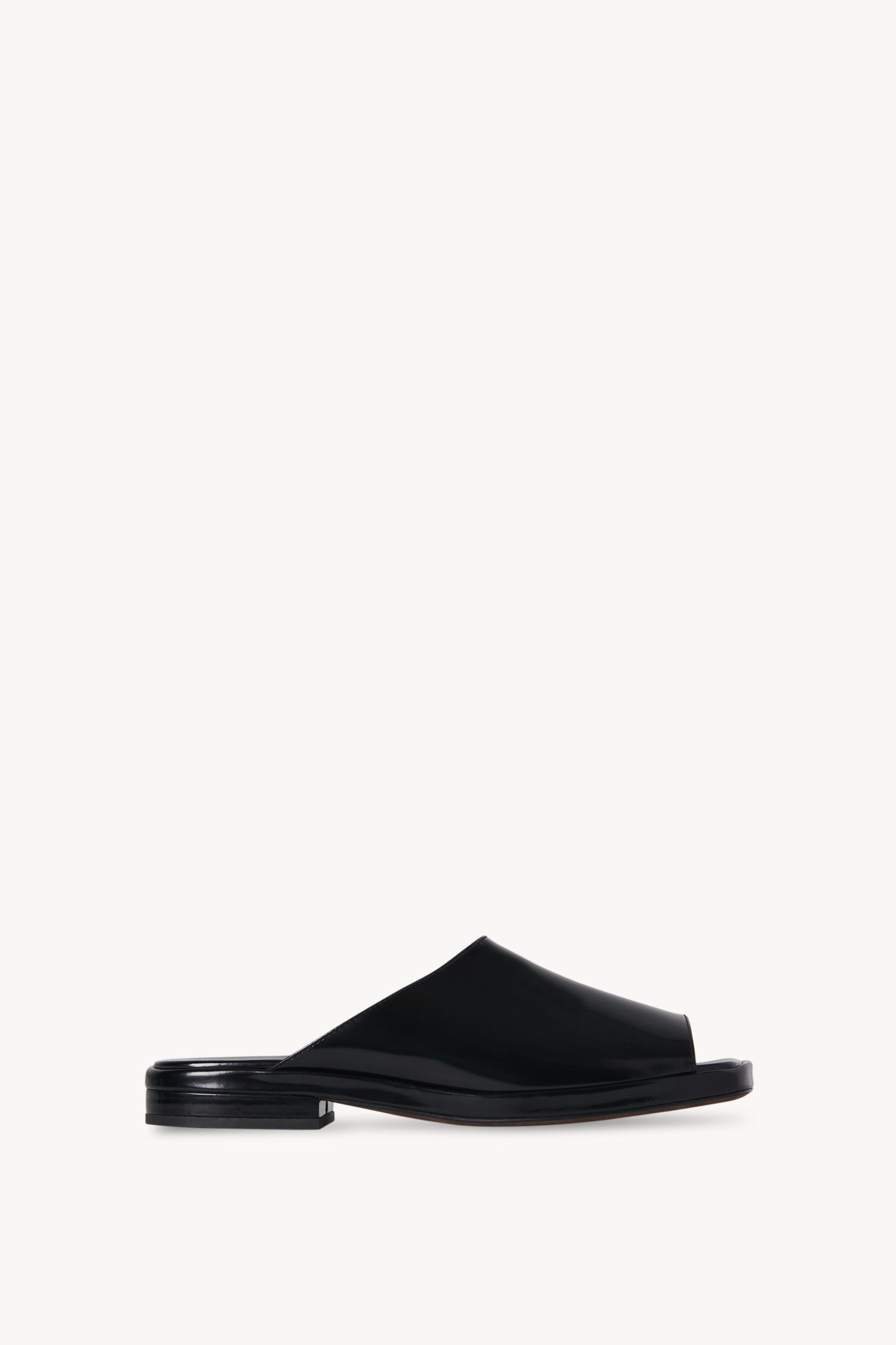 Heeled mule sandal in polished calfskin leather with open. squared toe. contoured footbed. and stacked leather heel.