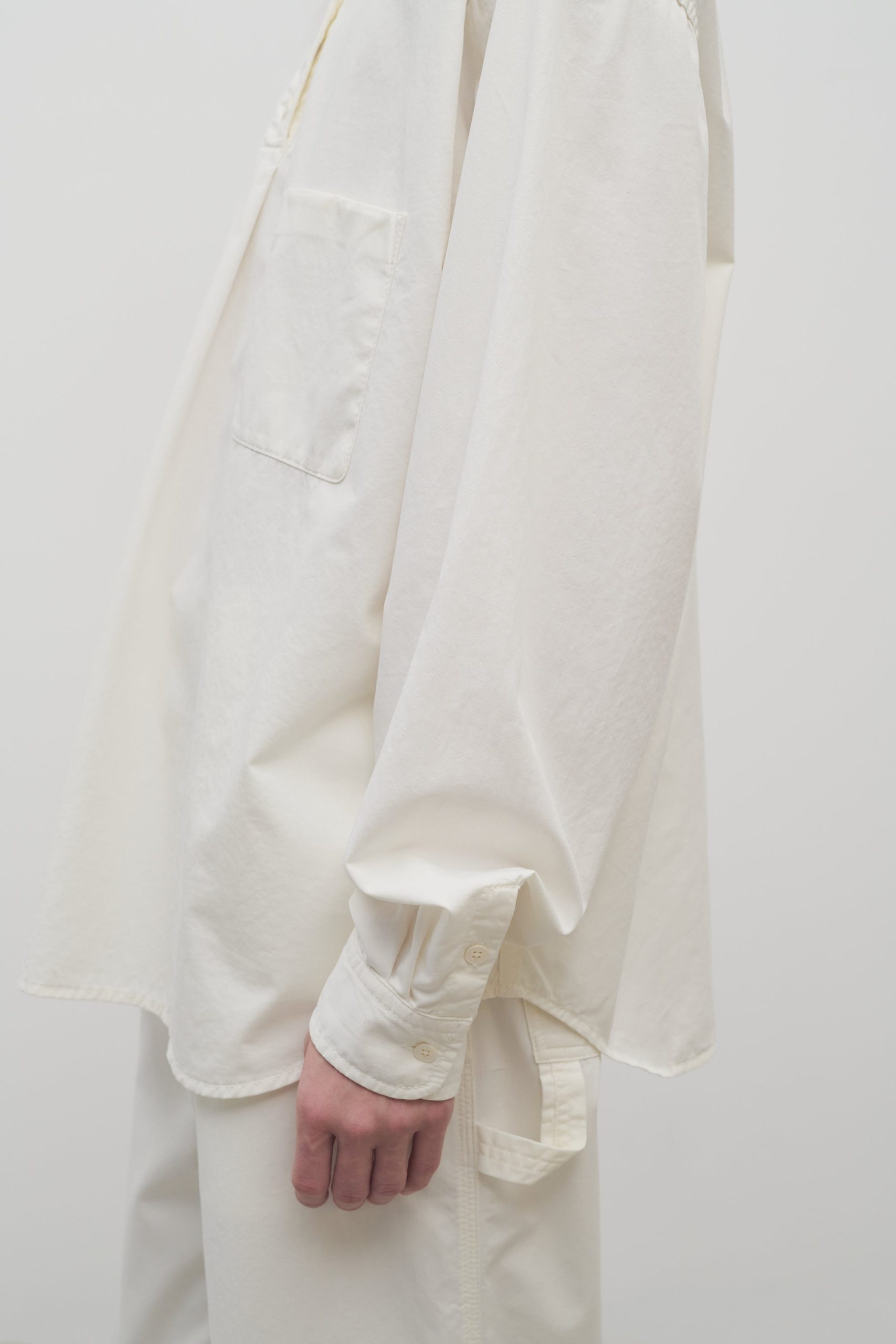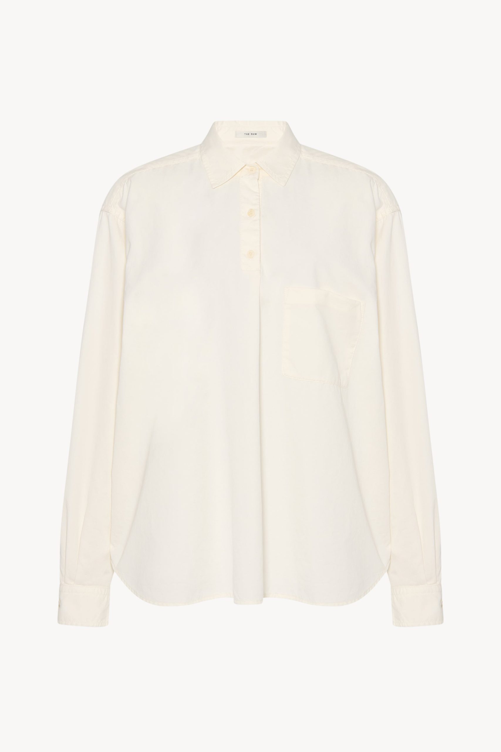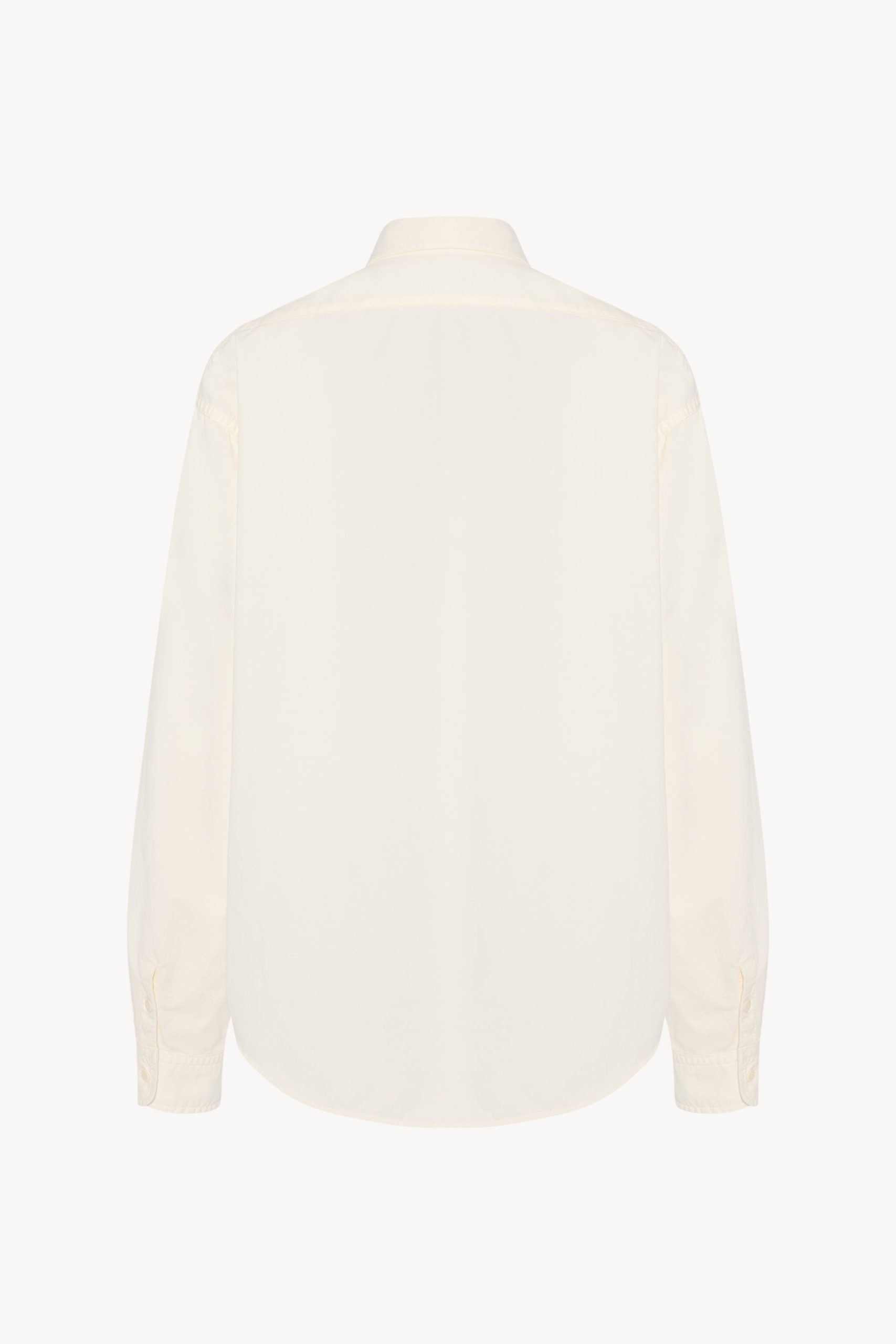 Oversized collared shirt in soft cotton and cashmere gabardine with front patch pocket. slim back yoke. and exposed polo placket.