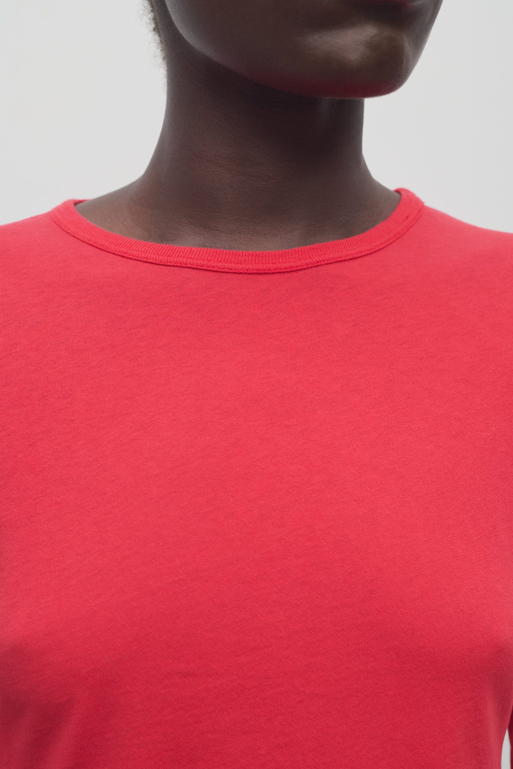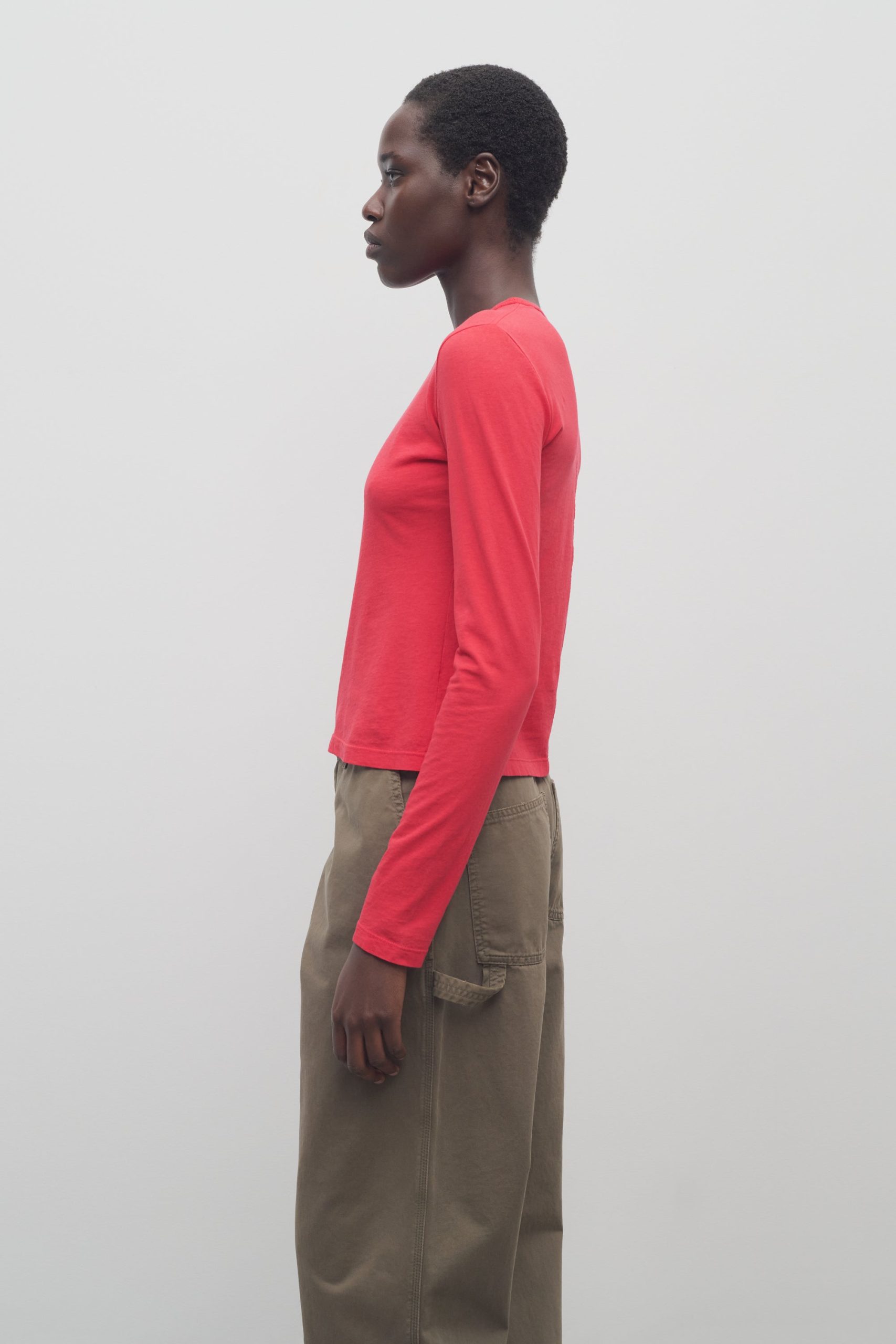 Light long-sleeved top in organic cotton jersey with slim fit. ribbed neckline. and signature center back detail.