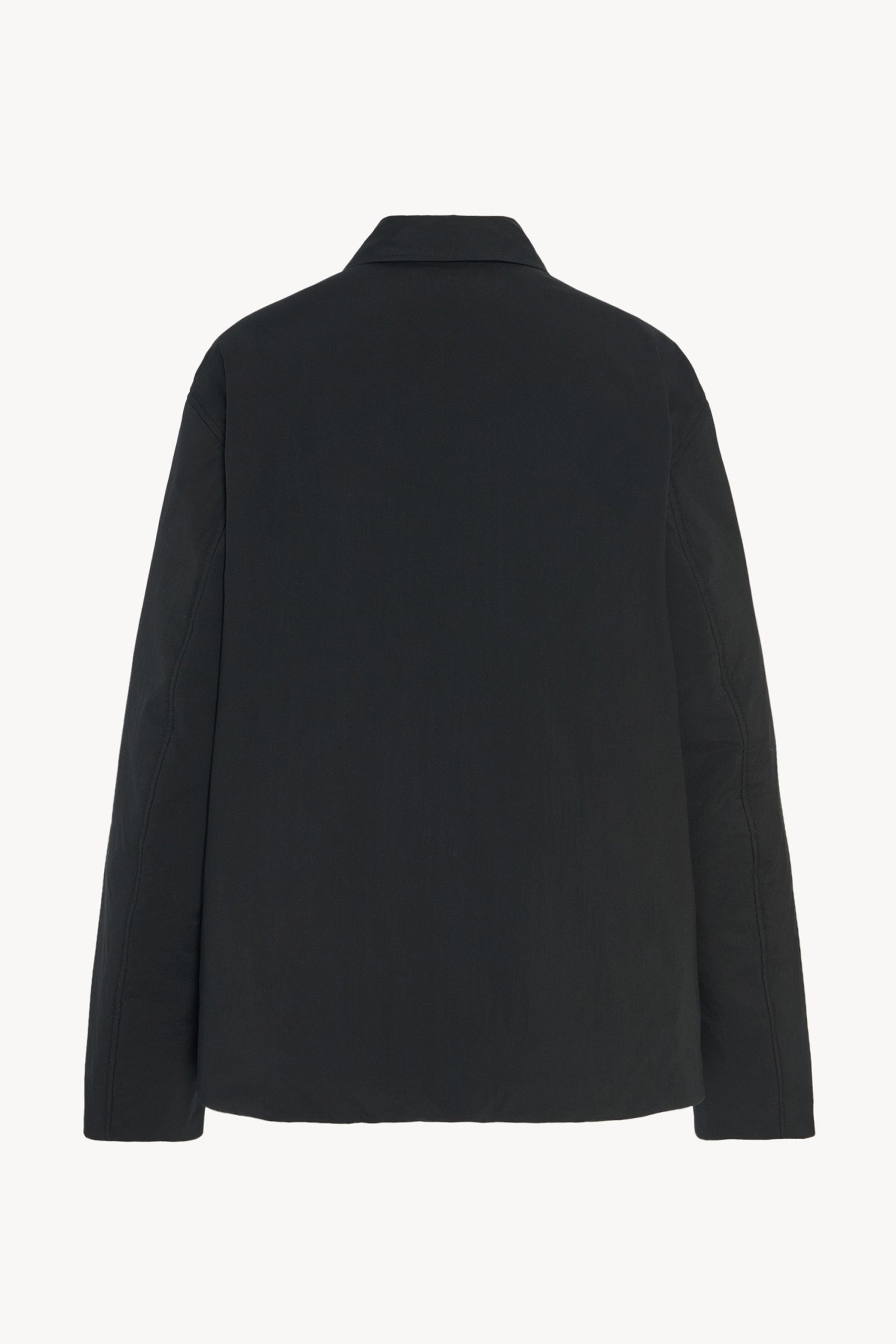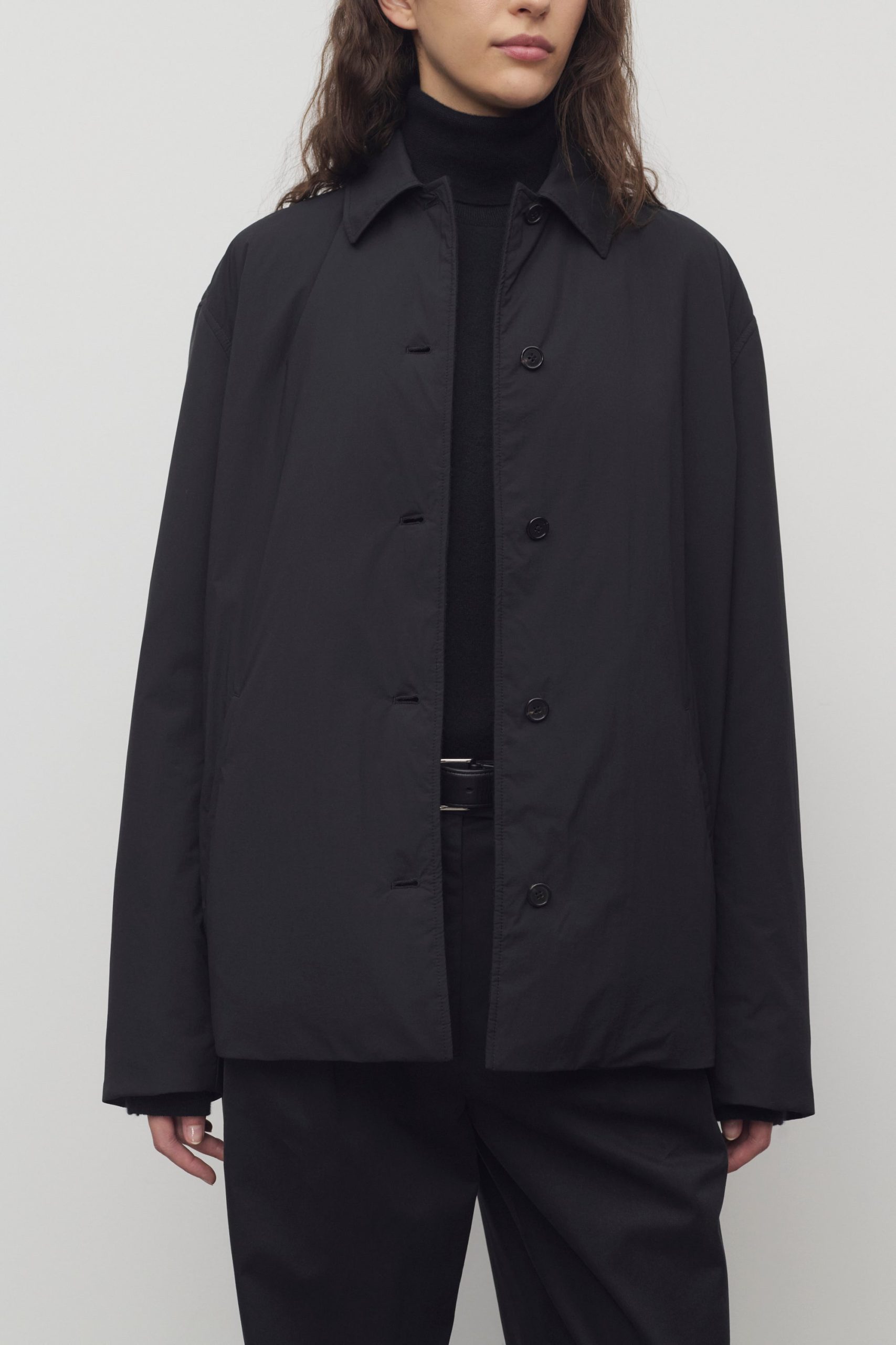 Minimal shirt jacket in ultralight technical nylon with relaxed fit. slant welt pockets. and horn button closure.