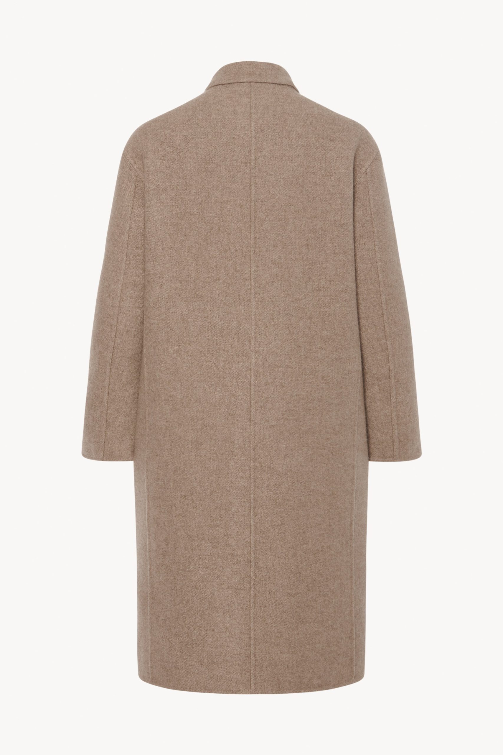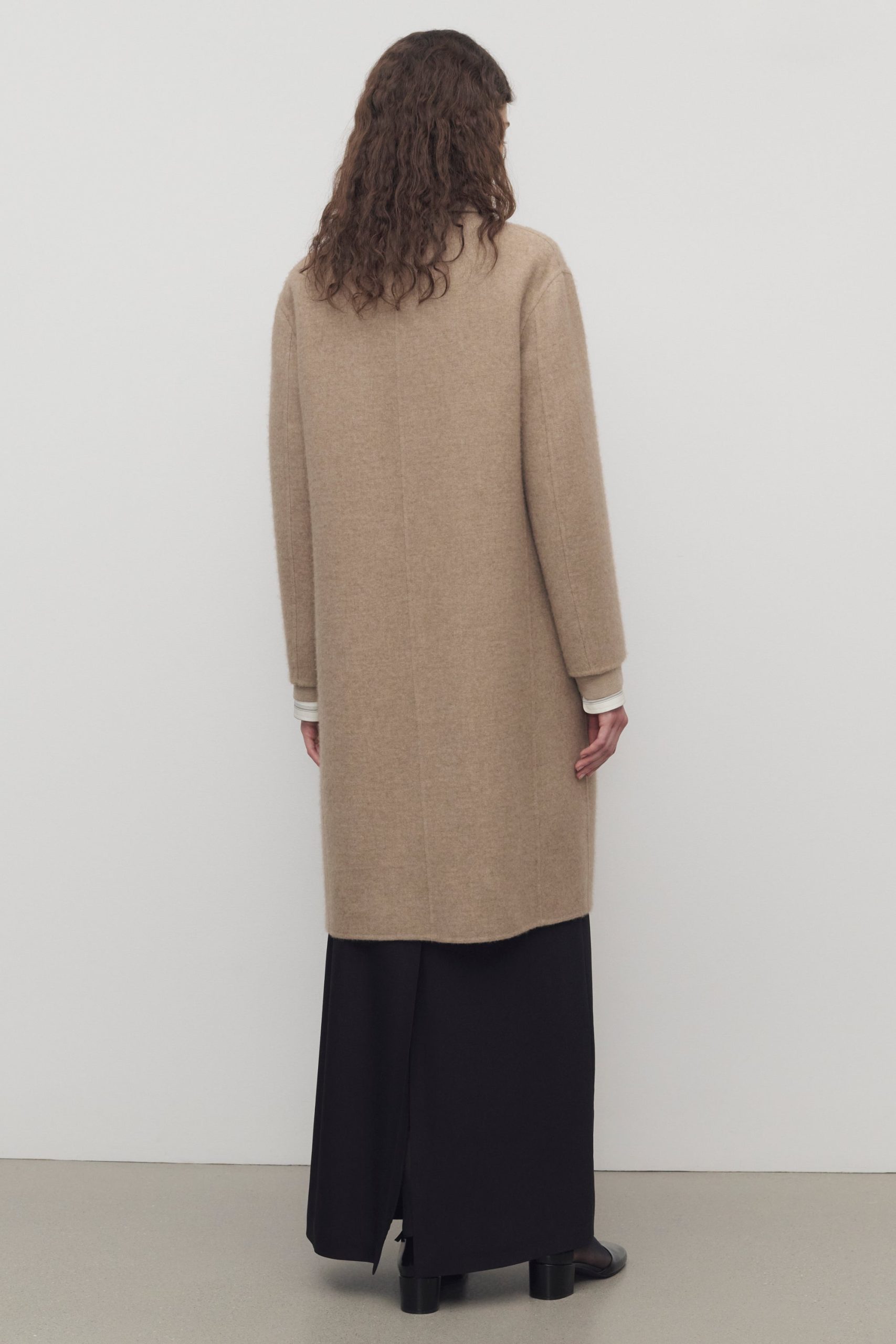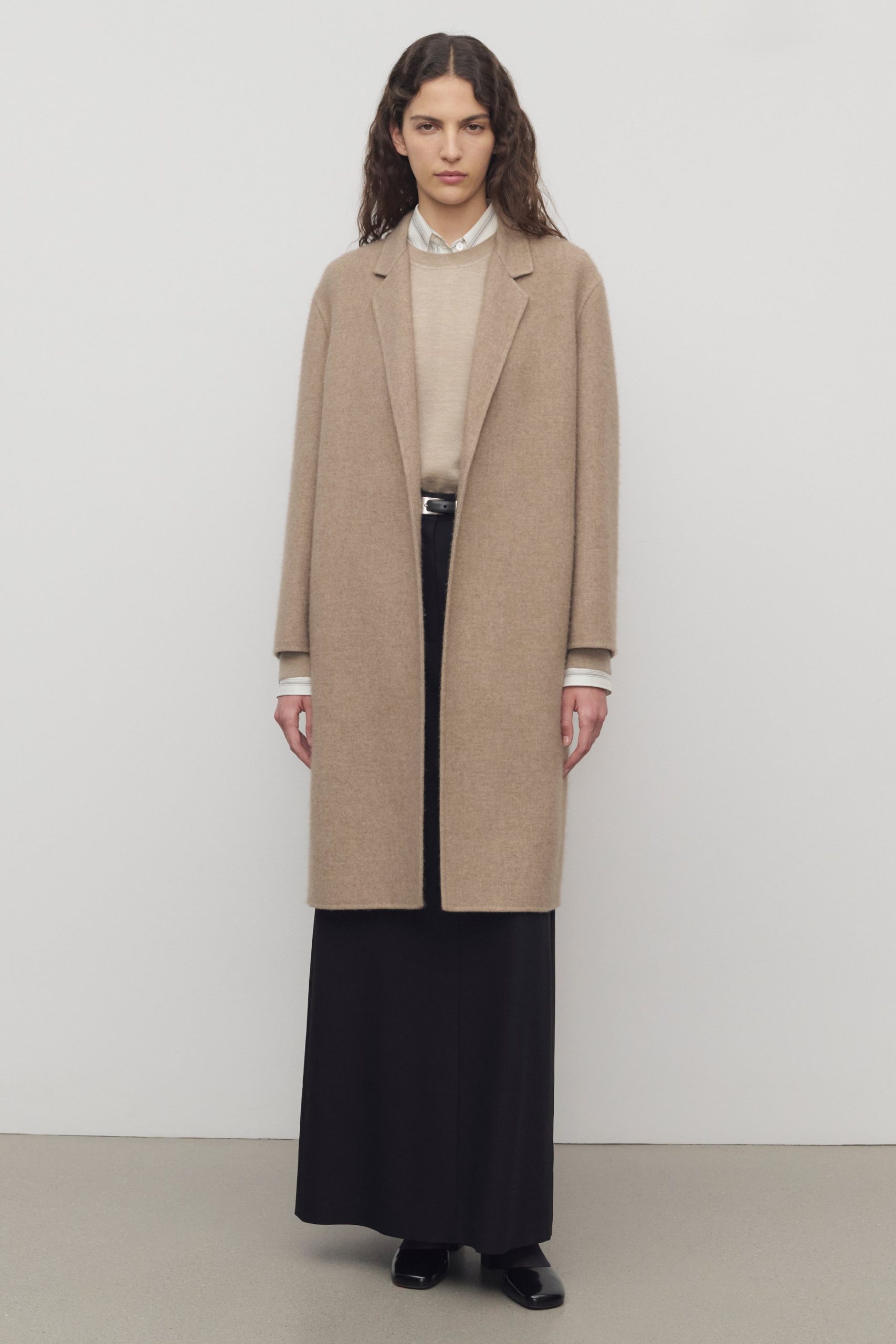 Handcrafted duster coat in double-faced cashmere flannel with notch lapel. unlined finish. and open front.
