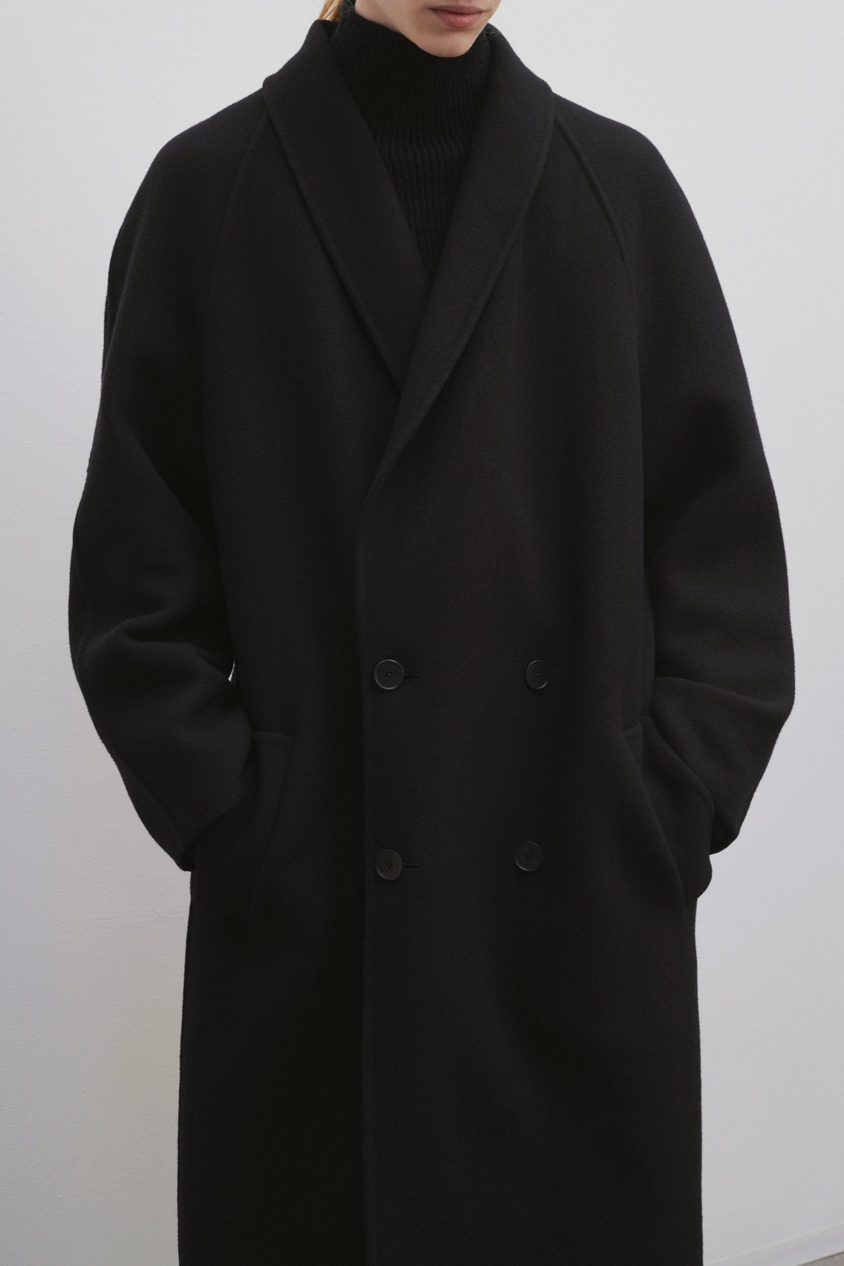 Knee-length double-breasted coat in felted wool with relaxed oversized fit. high shawl collar. exposed 4-button placket and center back vented seam.