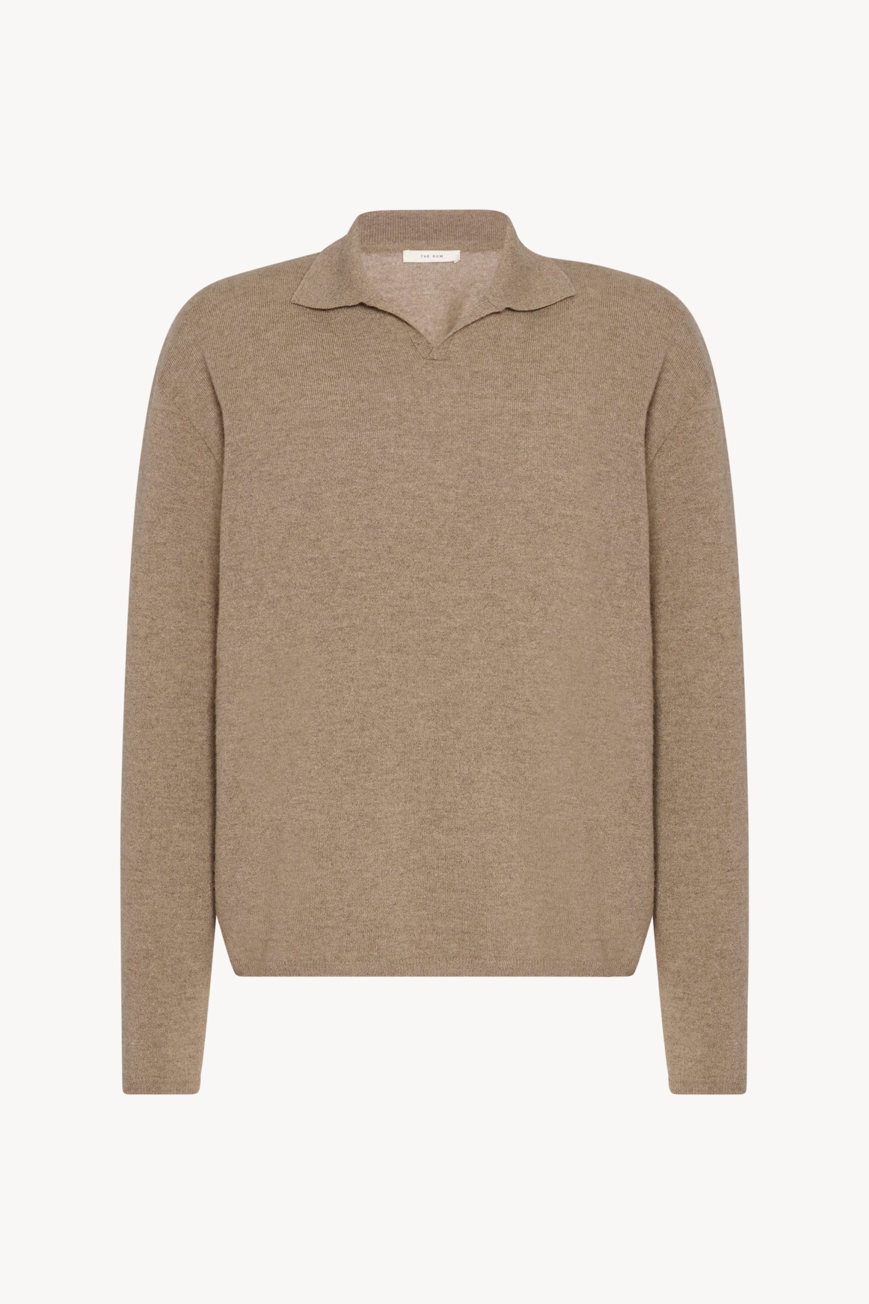 Long-sleeved polo top in soft cashmere with relaxed fit. buttonless front tab. and ribbed collar. cuffs. and hem.