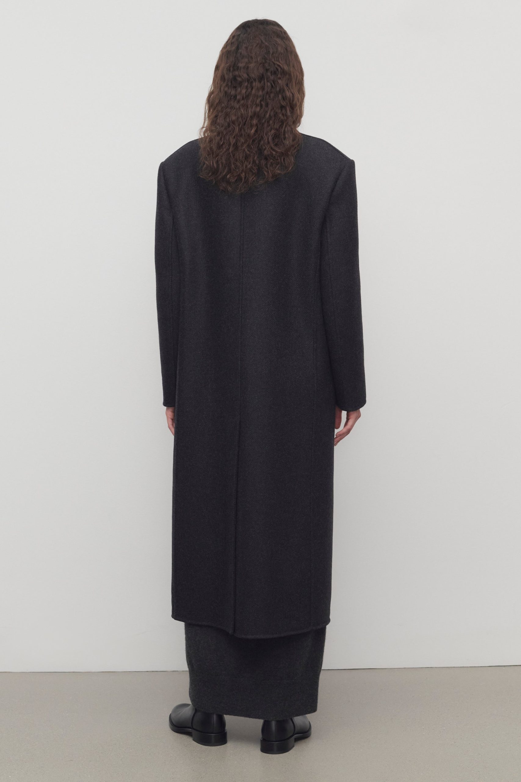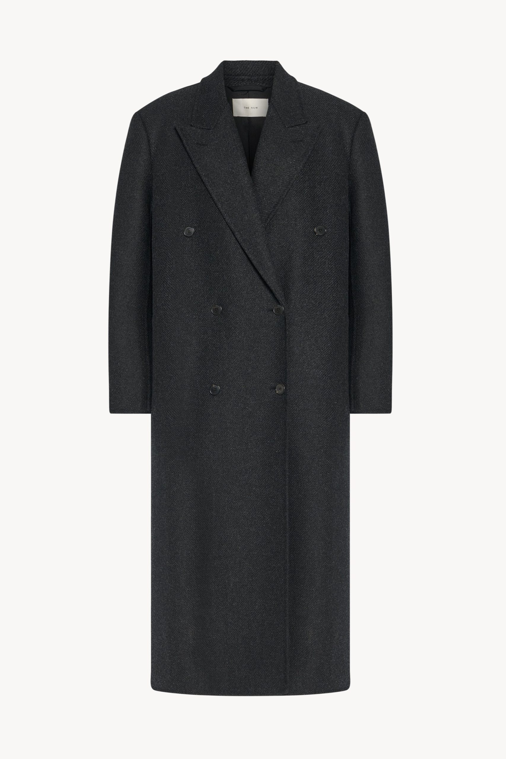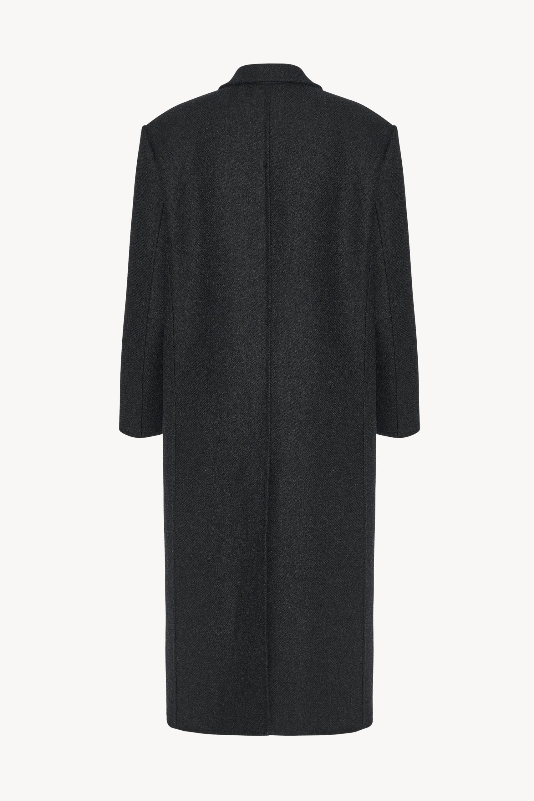 Double-breasted tailored coat in washed double-faced wool and cashmere with peak lapel. slant welt pockets. and horn button closure.