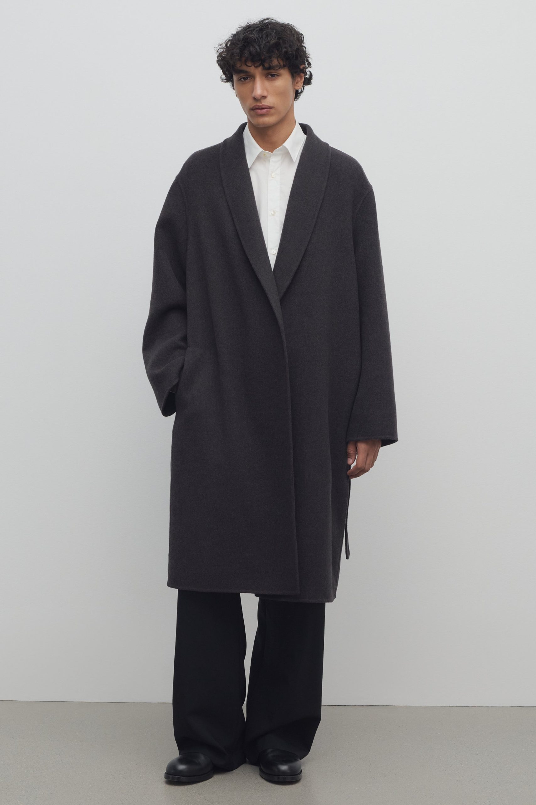Double-breasted overcoat in double-faced felted cashmere with shawl collar. side seam pockets. and removable belt.