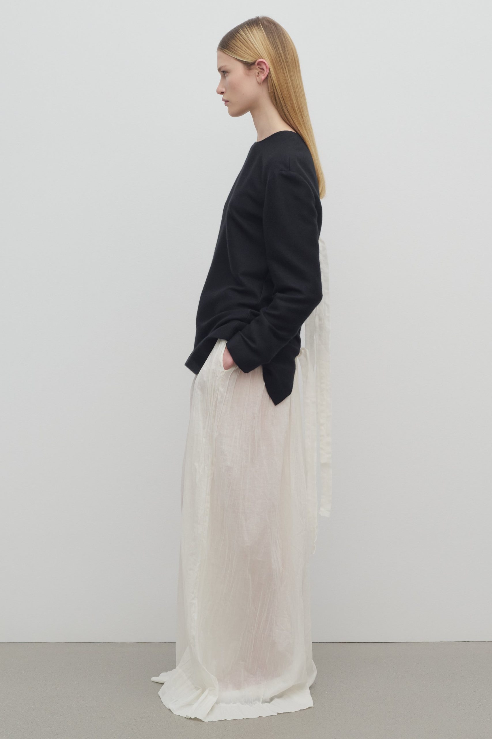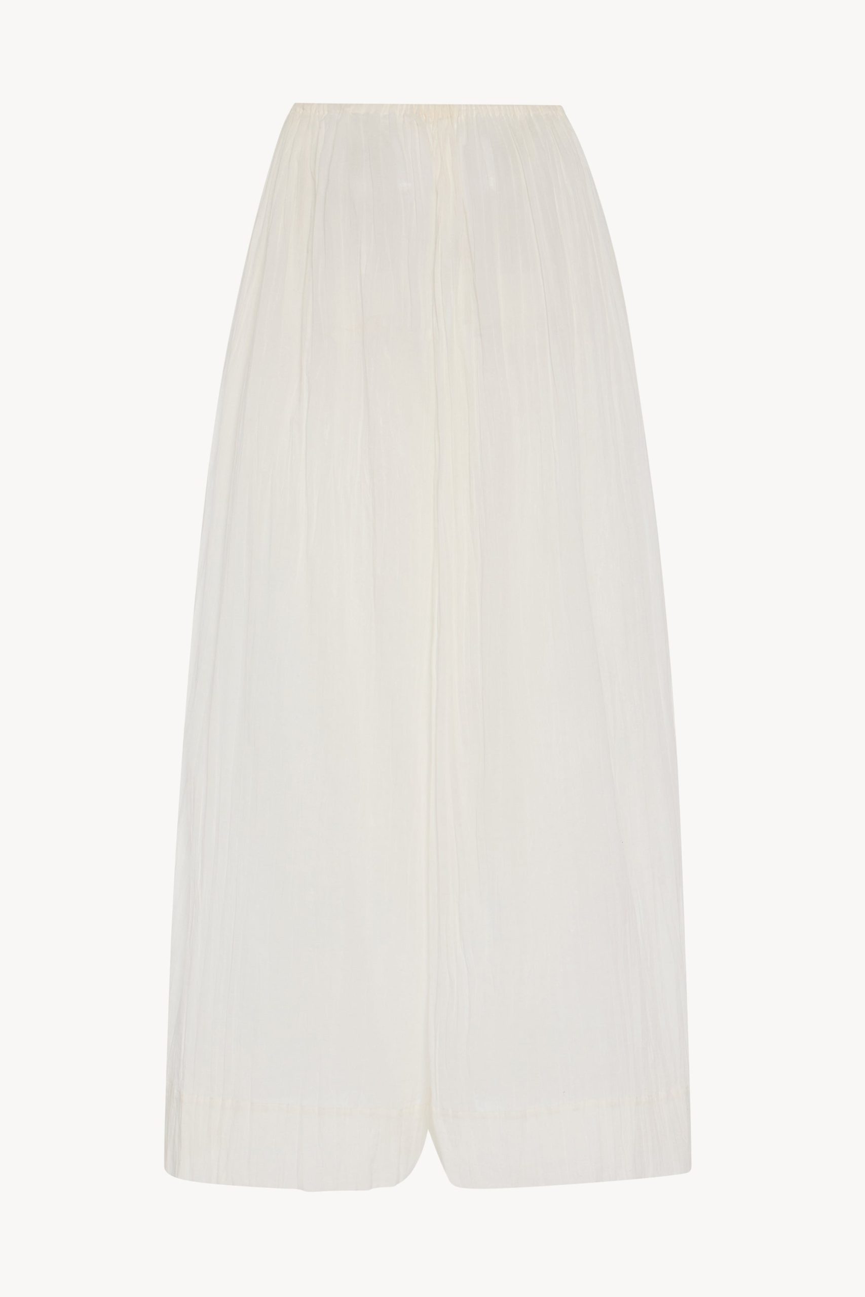 Wide-leg pajama pant in gauzy lightweight cotton with gathered drawstring waistband. side seam pockets. and French seam finish.