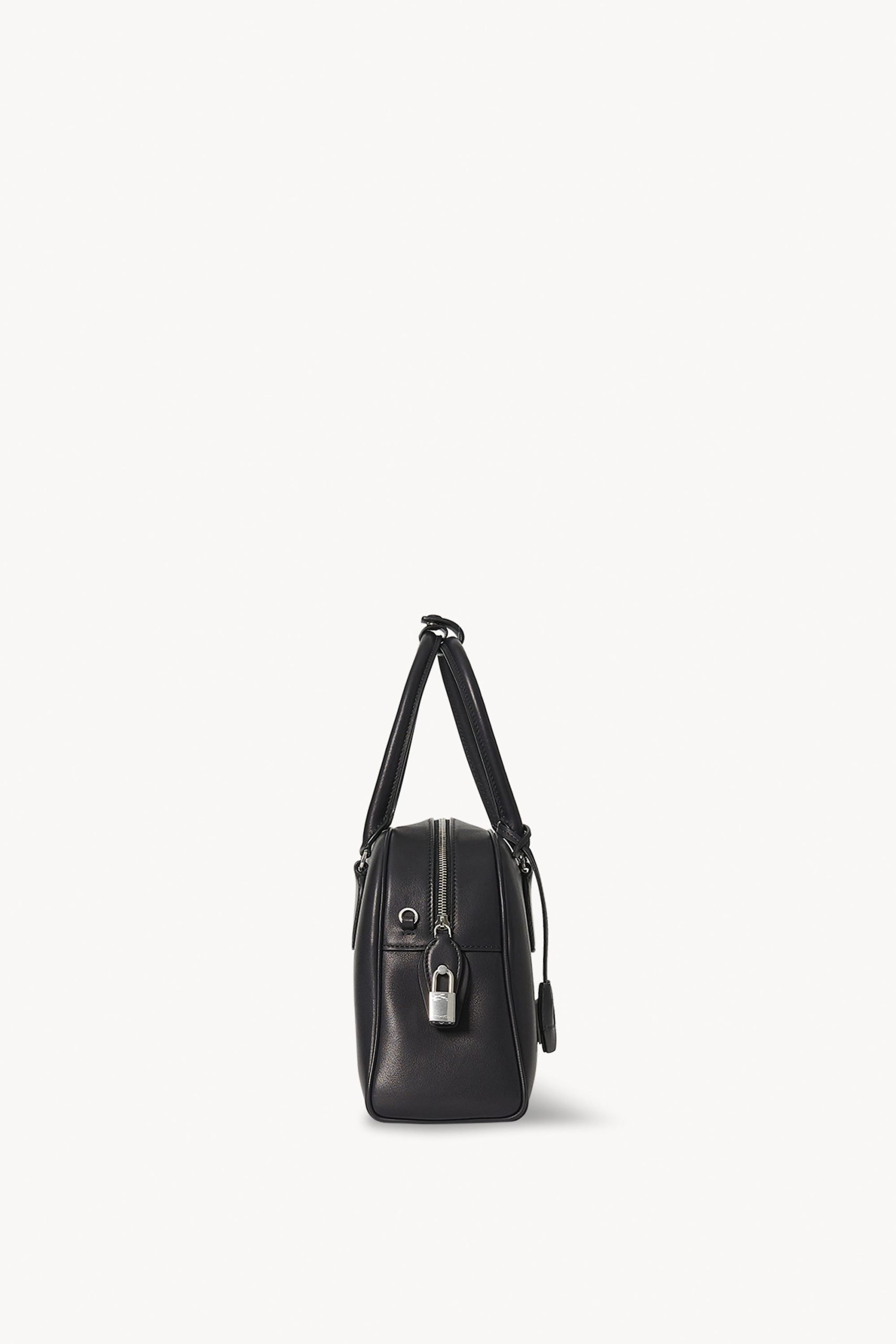 Updated bowling bag in polished saddle leather with tubular handles. branded metal padlock and key. and zipper closure.