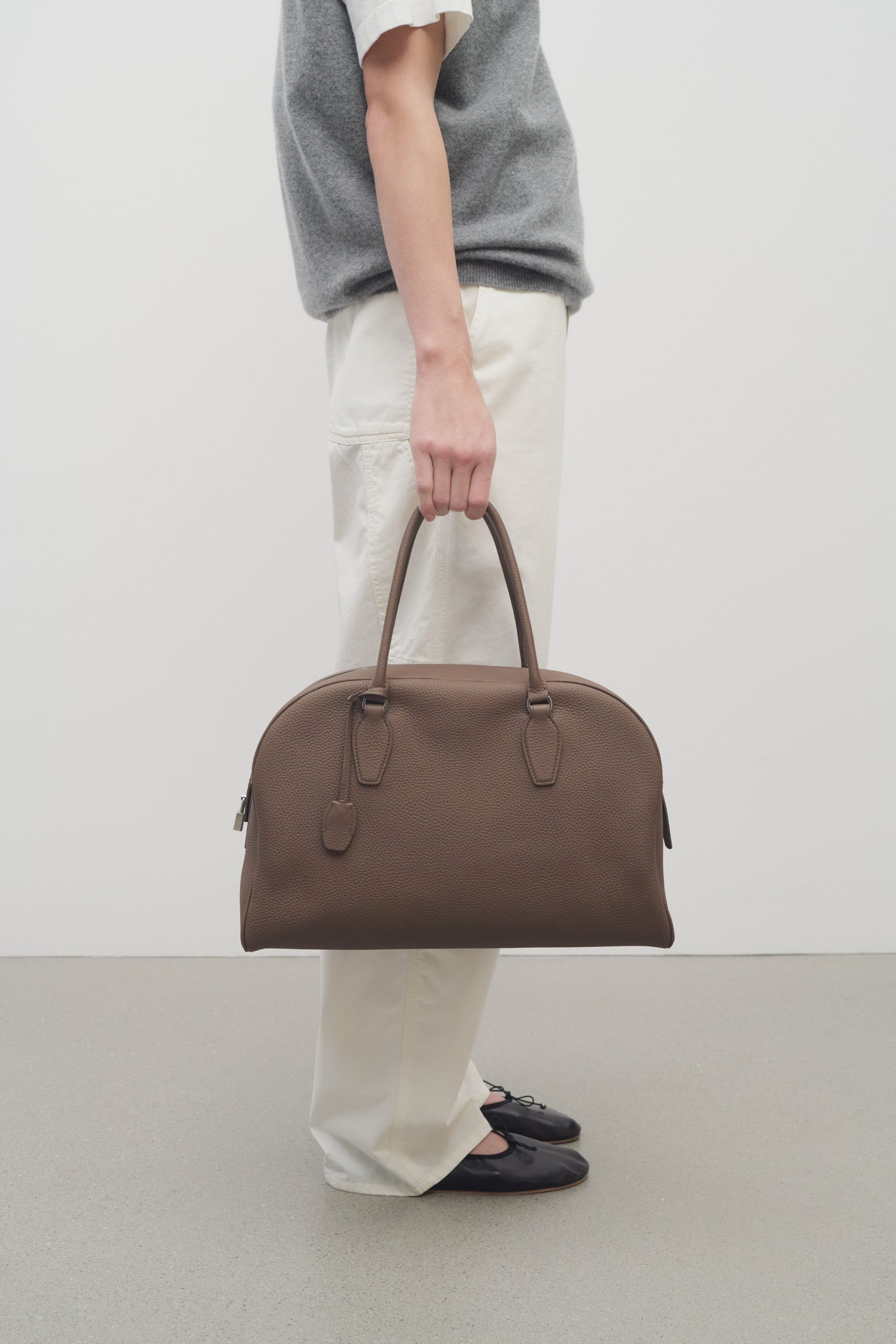 Updated bowling bag in textured calfskin leather with tubular handles. branded metal padlock and key. and zipper closure.