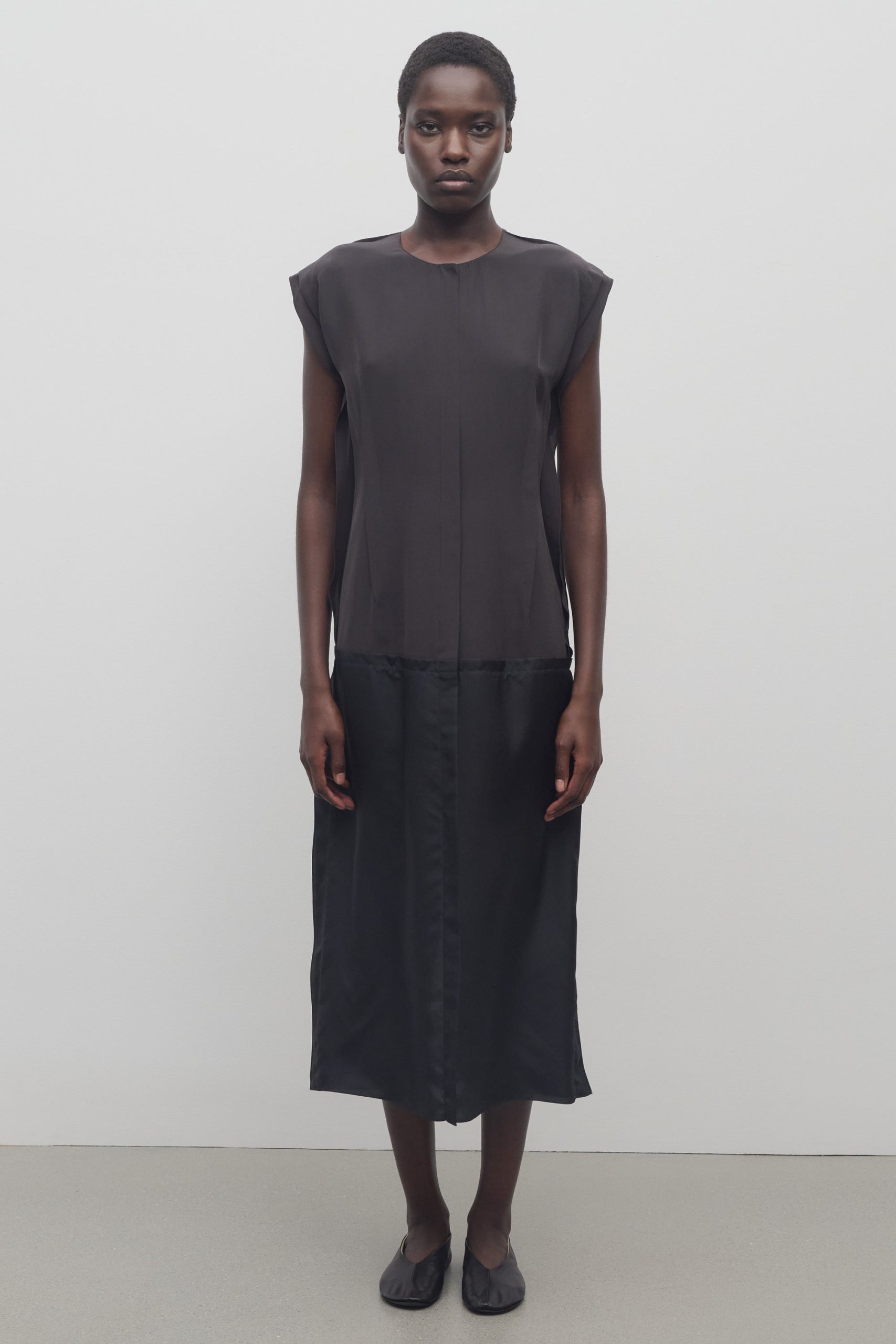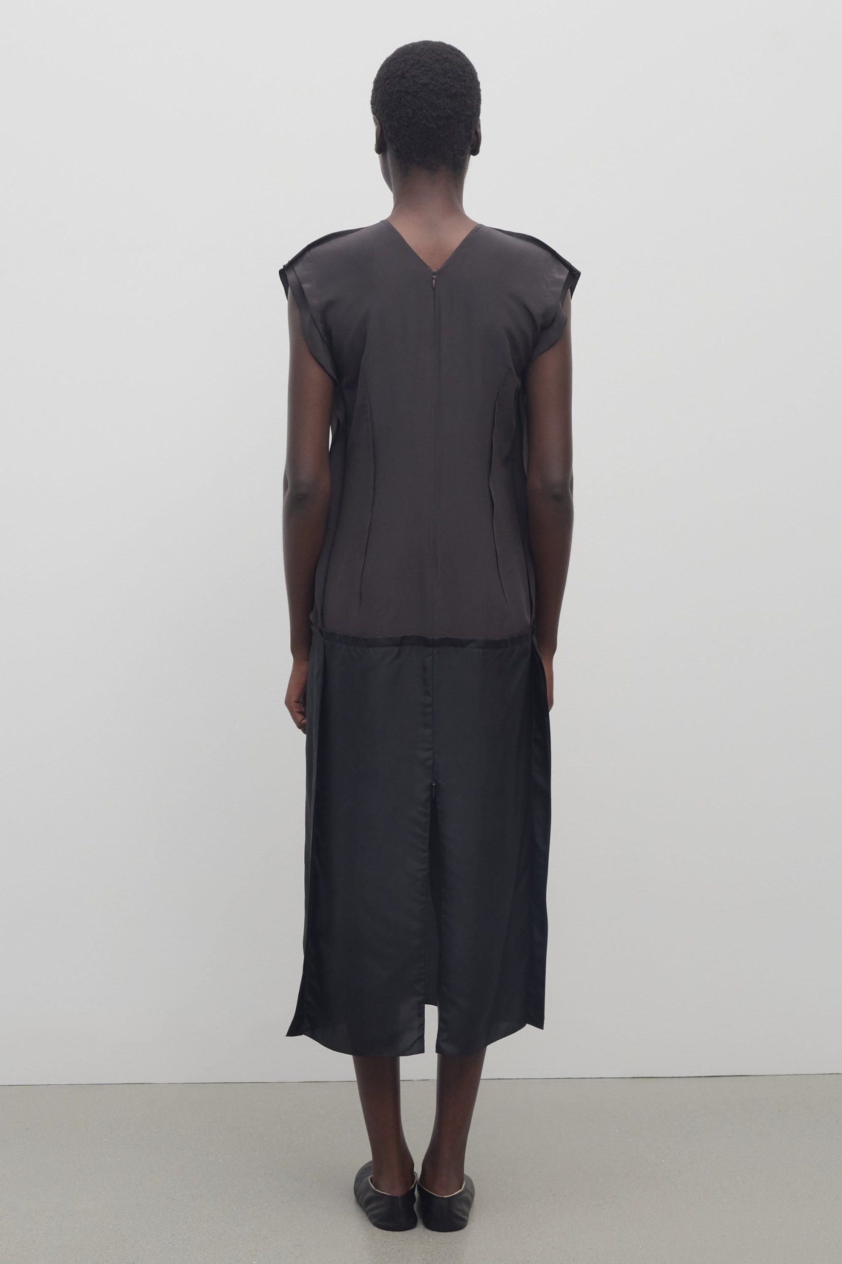 Calf-length shift dress in fluid silk viscose crepe de chine with paneled skirt. stitched front placket. and center back two-way zip closure.