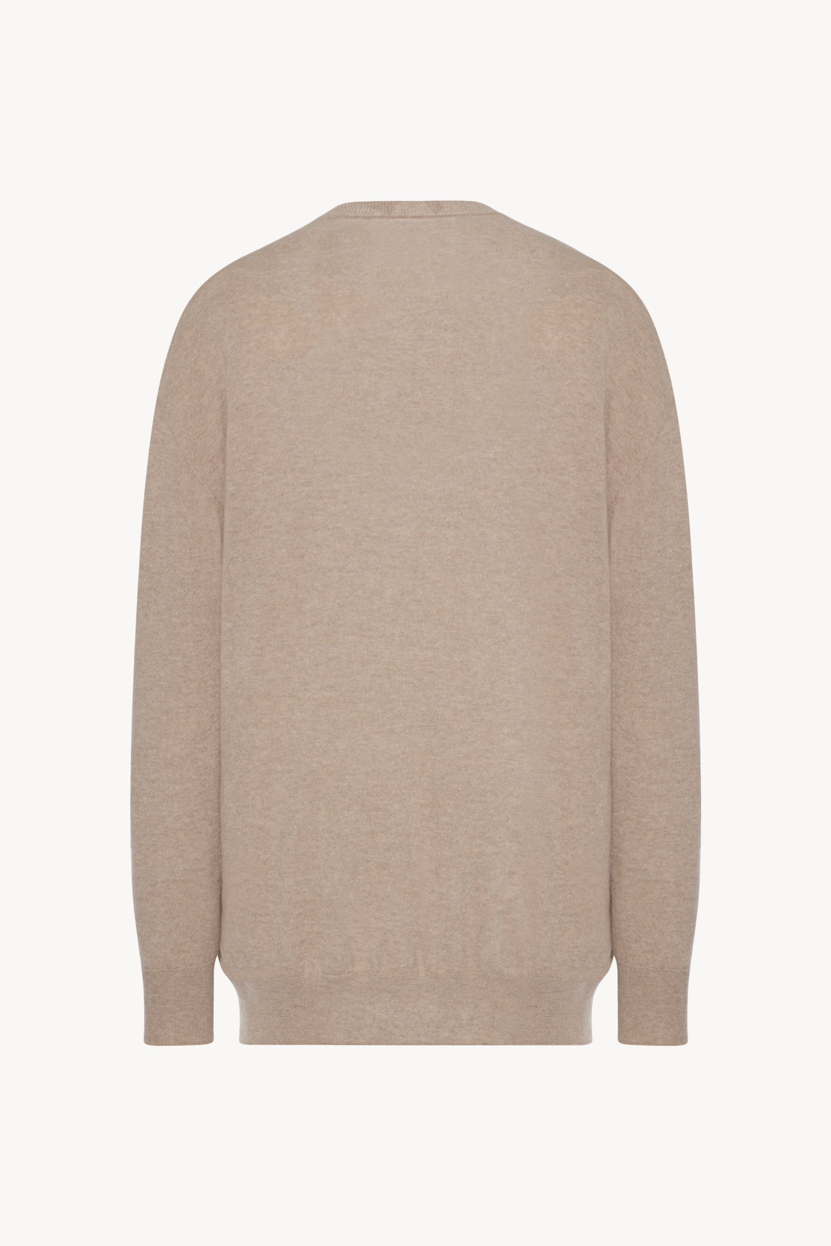 Seamless sweater in ultrafine cashmere knit with classic v-neckline. ribbed neckline. cuffs. and hem. and slightly oversized fit.
