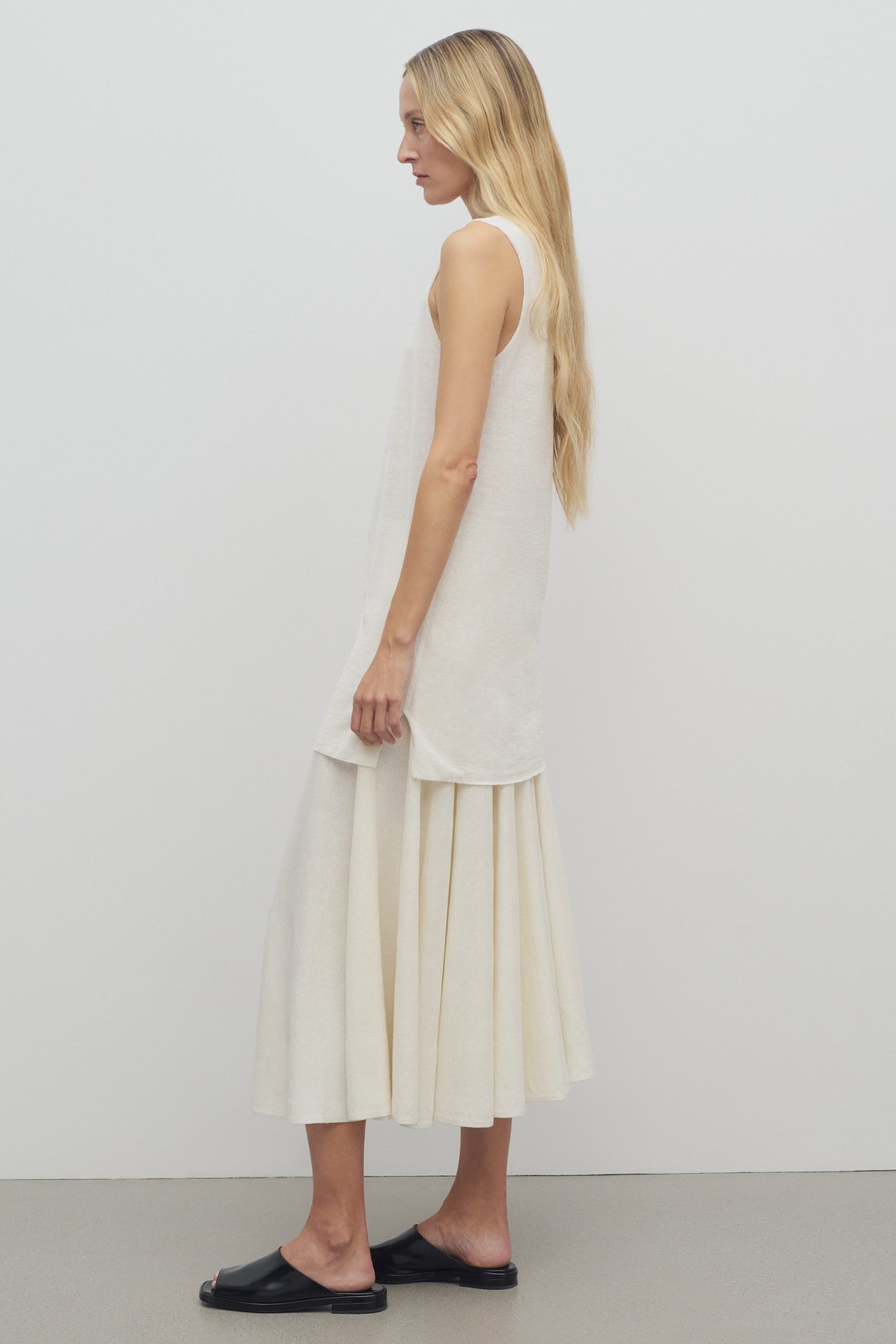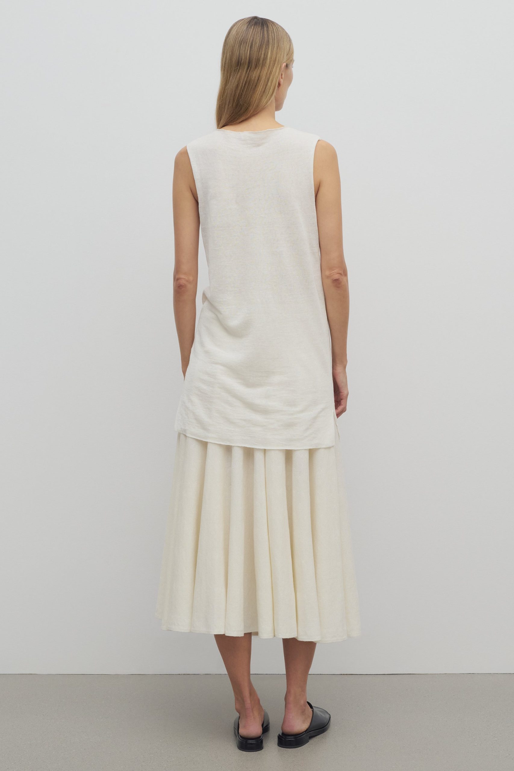 Calf-length skirt in textured linen and cotton knit with A-line silhouette and center back zip closure.