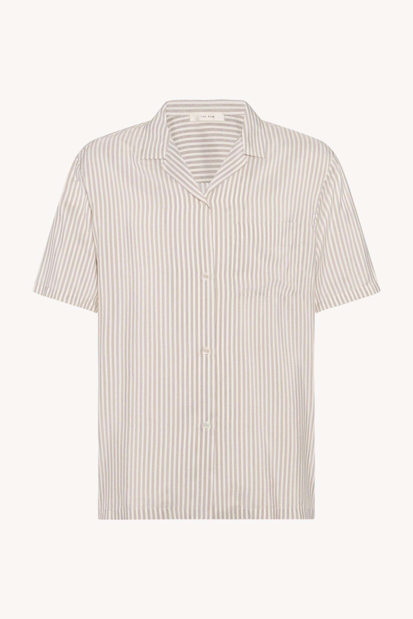 Short-sleeved button-up shirt in fluid striped silk with boxy fit. front patch pocket. and exposed horn button closure.