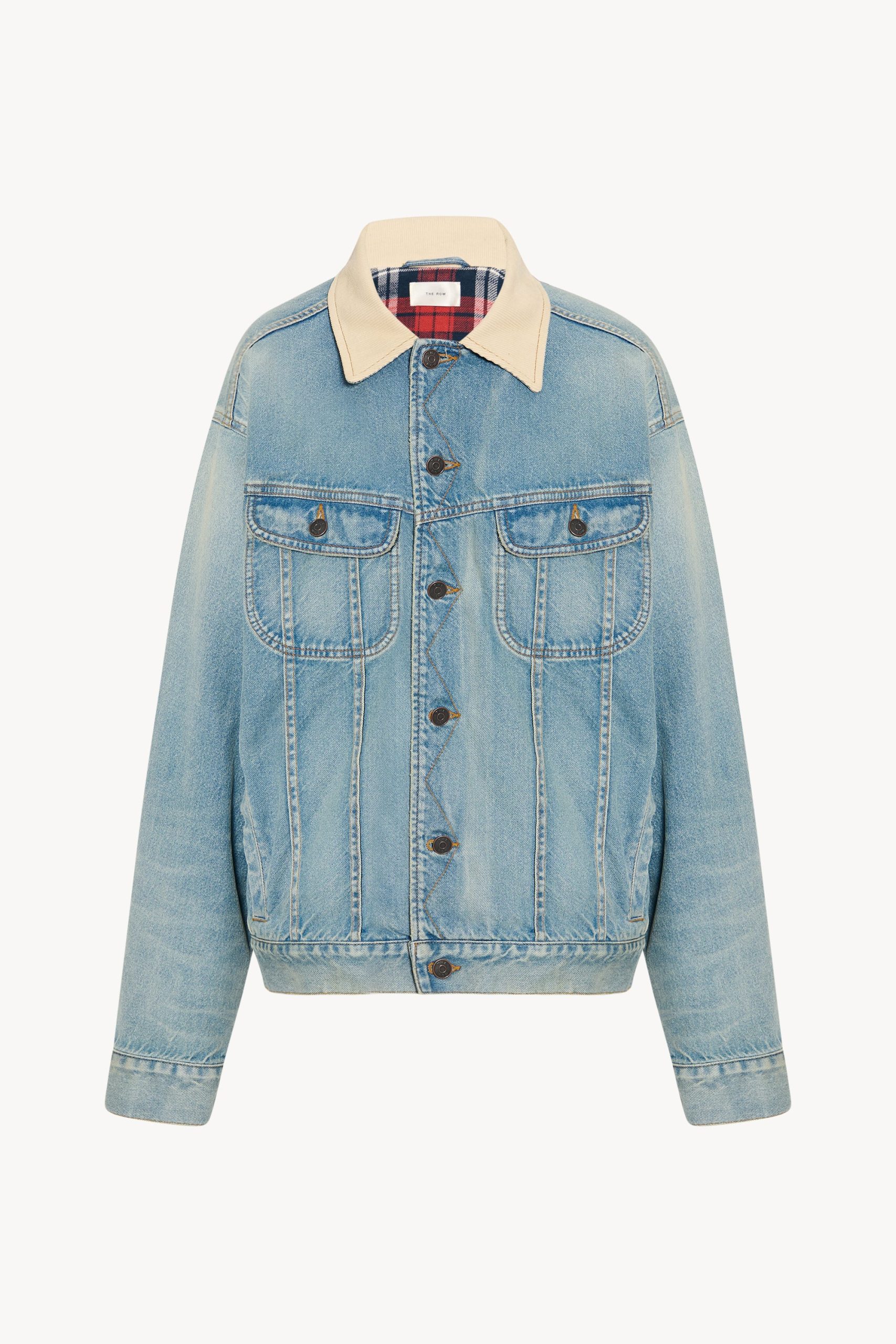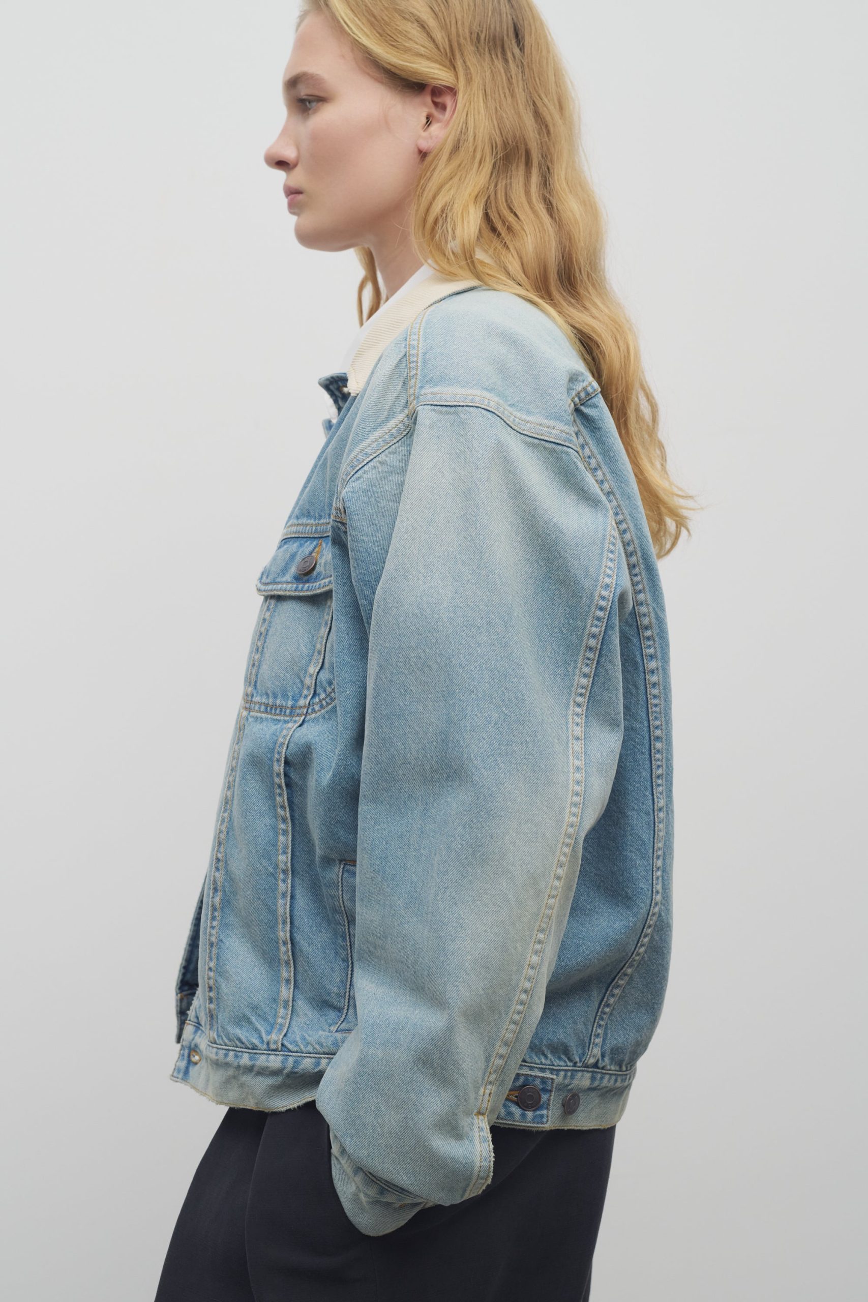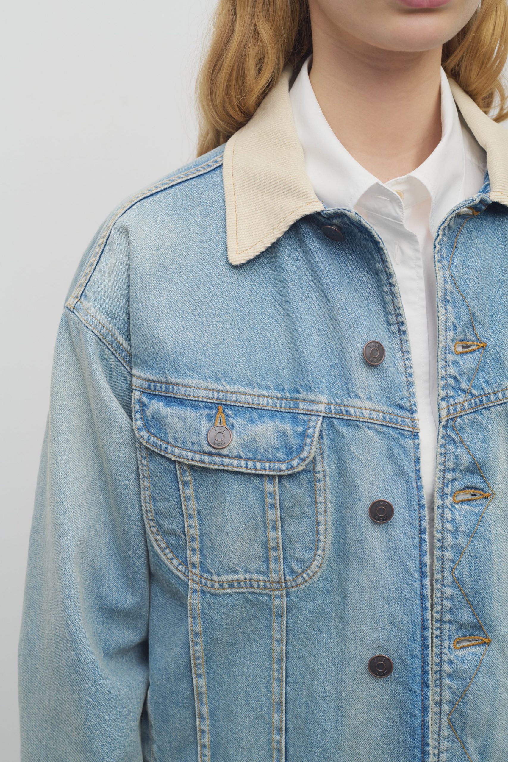 Oversized denim jacket in lightweight indigo denim with corduroy collar. cotton flannel lining. front flap and welt pockets. and front button placket.