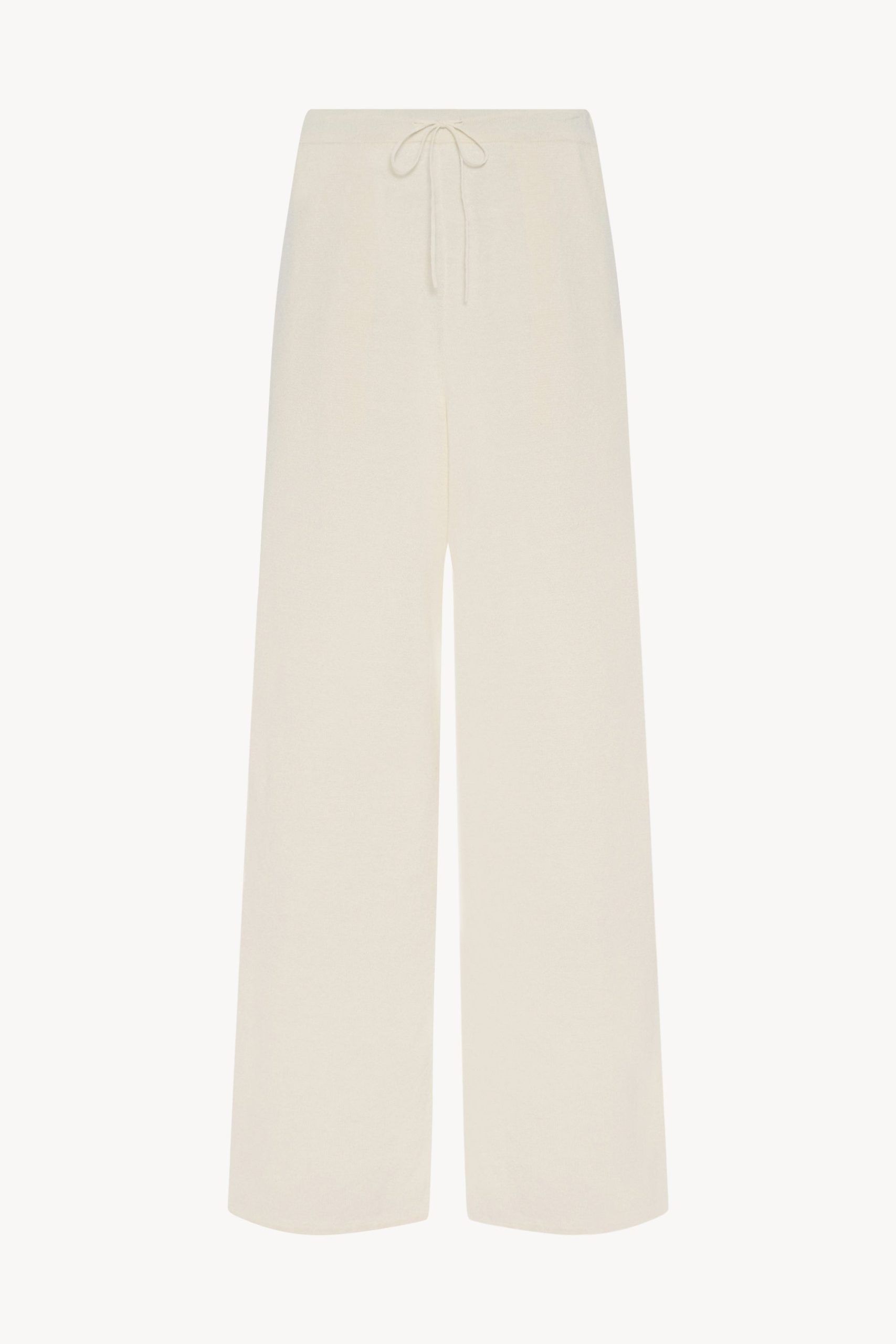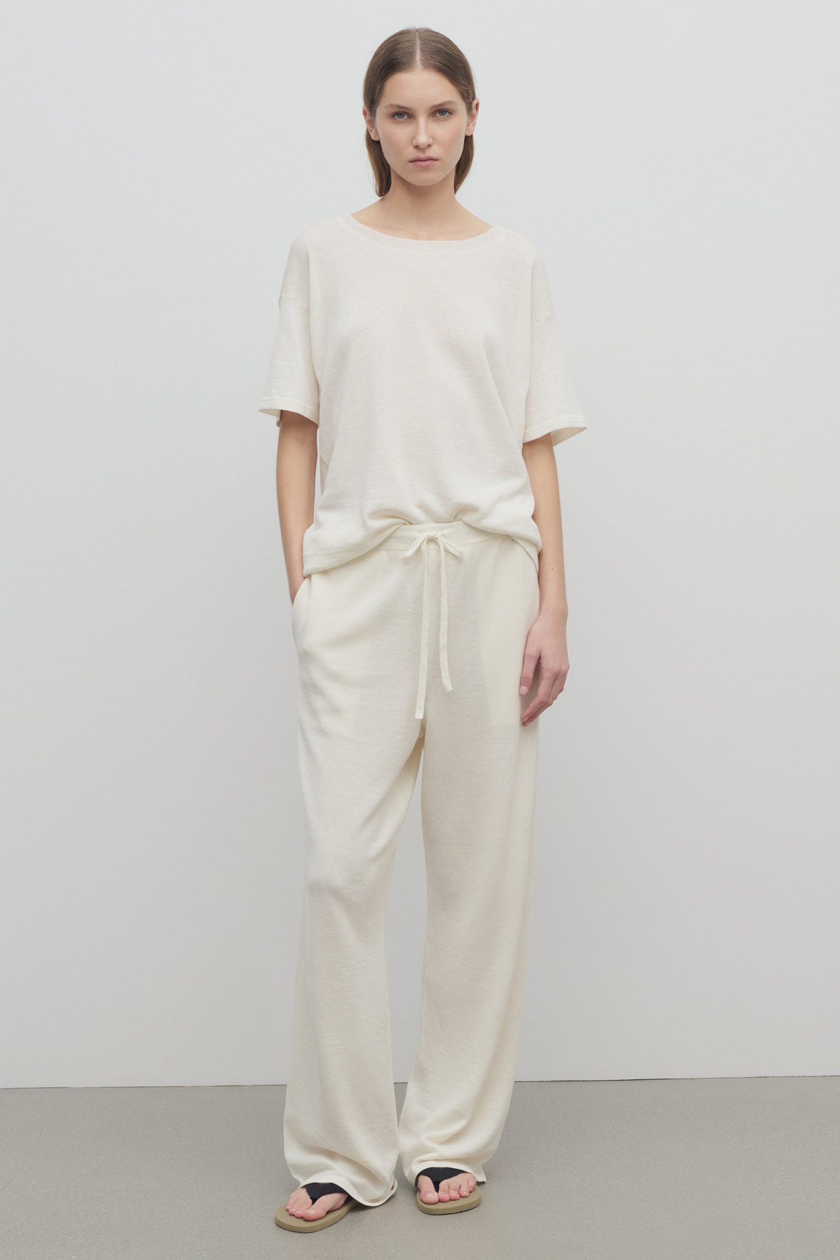 Relaxed pant in textured linen knit with wide leg. back patch pocket. and drawstring waistband.