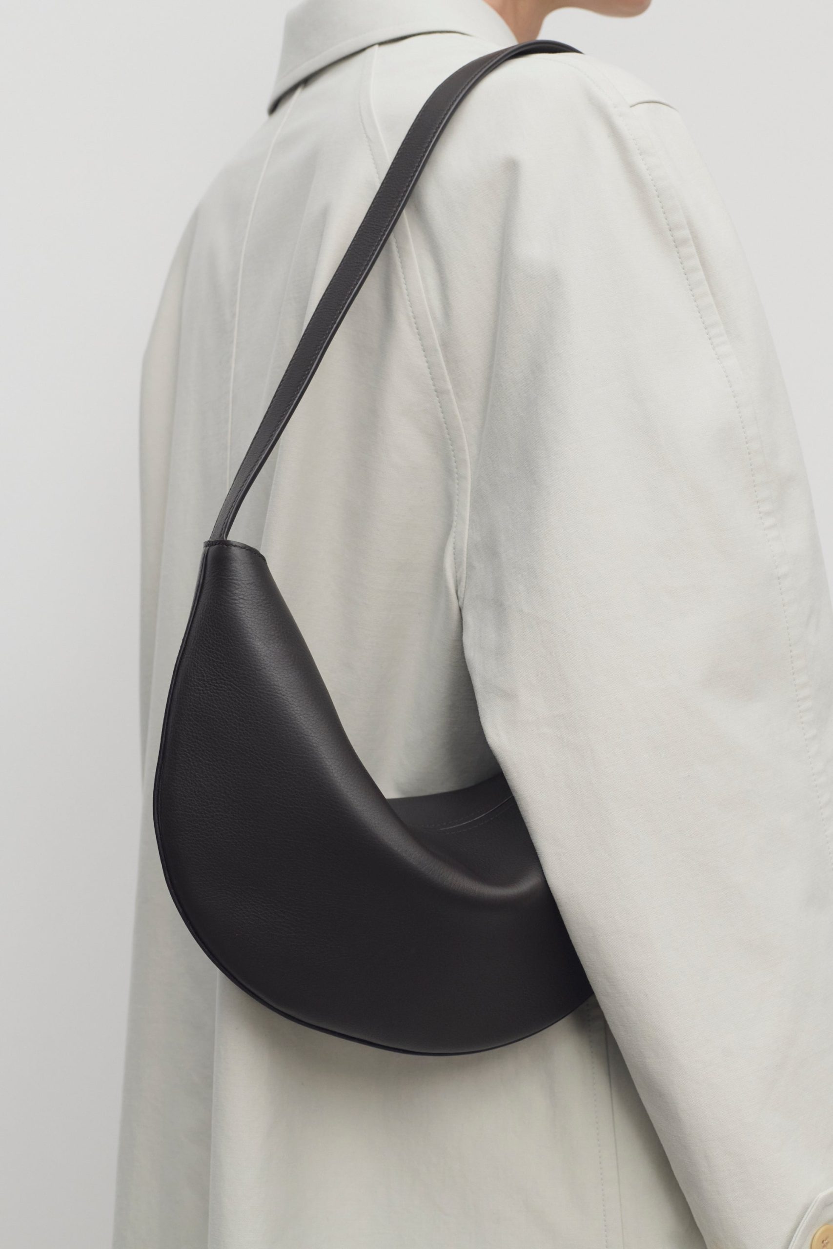 Crescent-shaped crossbody bag in finely grained calfskin leather with zipper closure and adjustable strap with metal buckle.