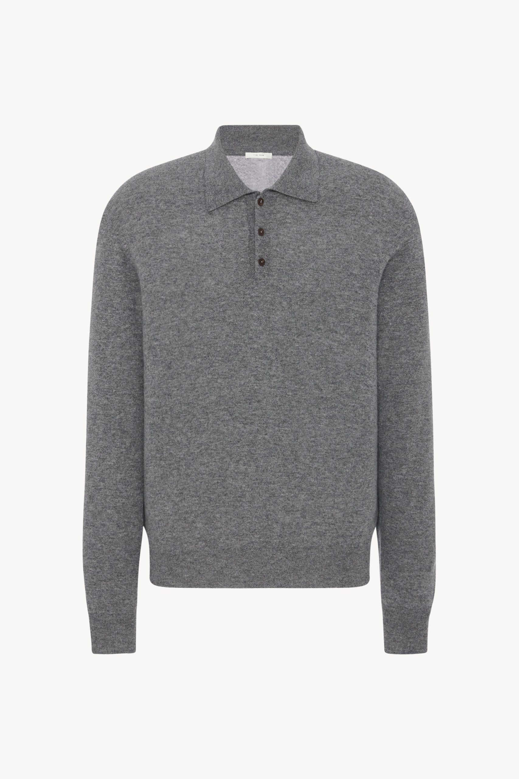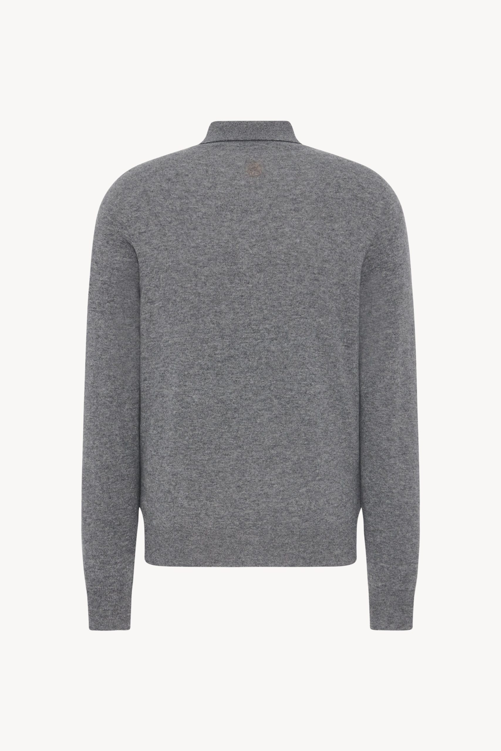 Long-sleeved polo sweater in ultrafine cashmere knit with ribbed cuffs and hem. horn button closure. and signature center back detail.