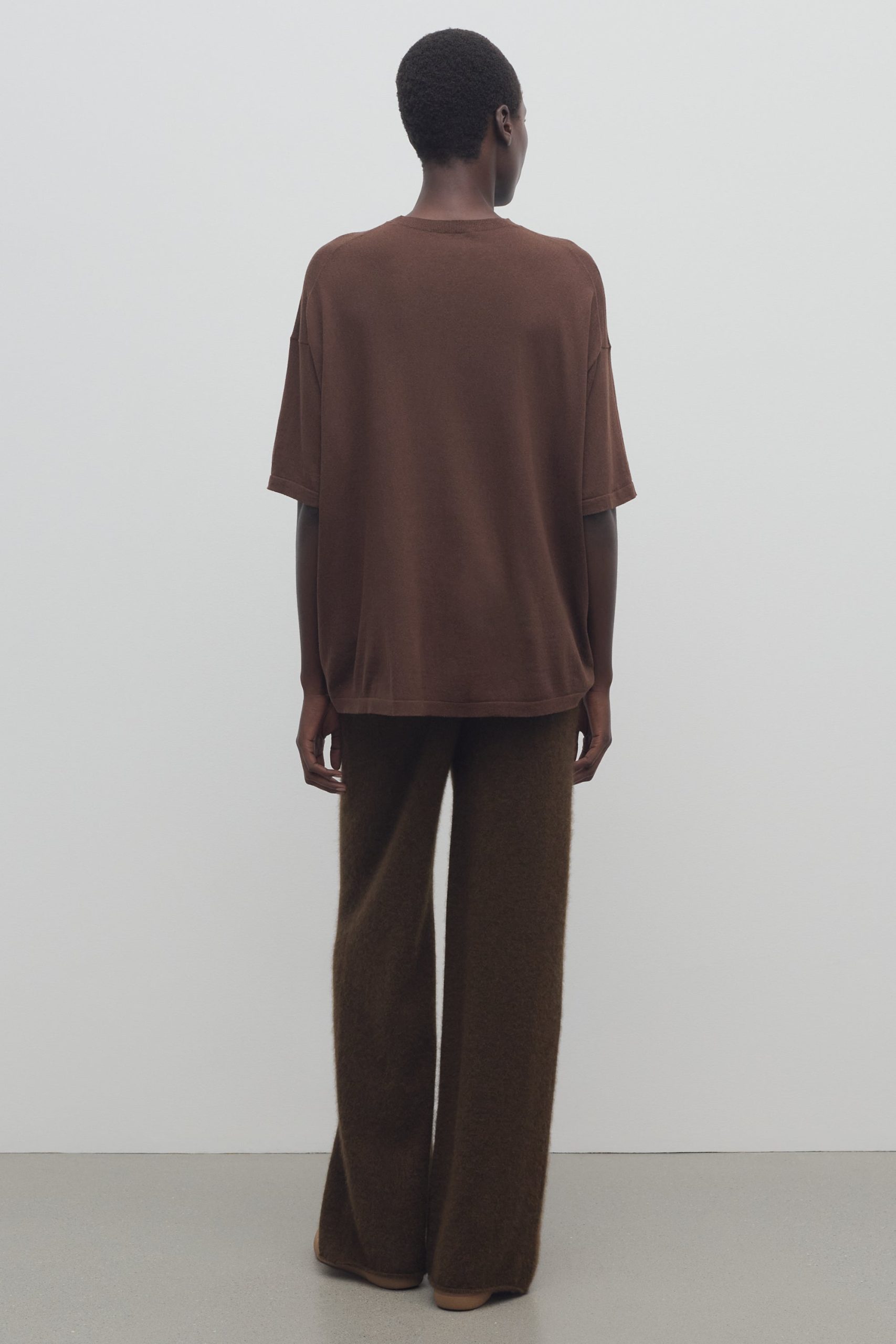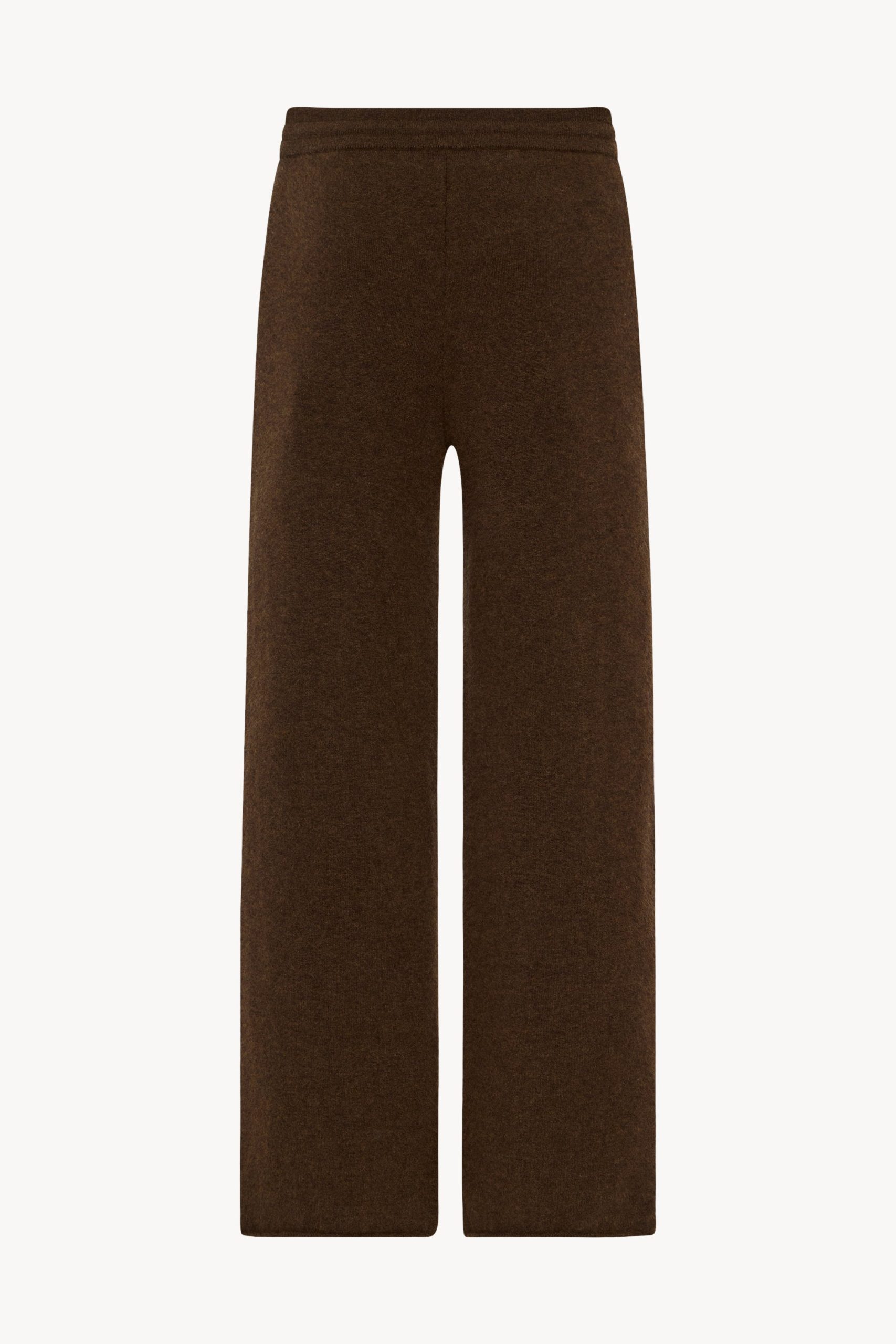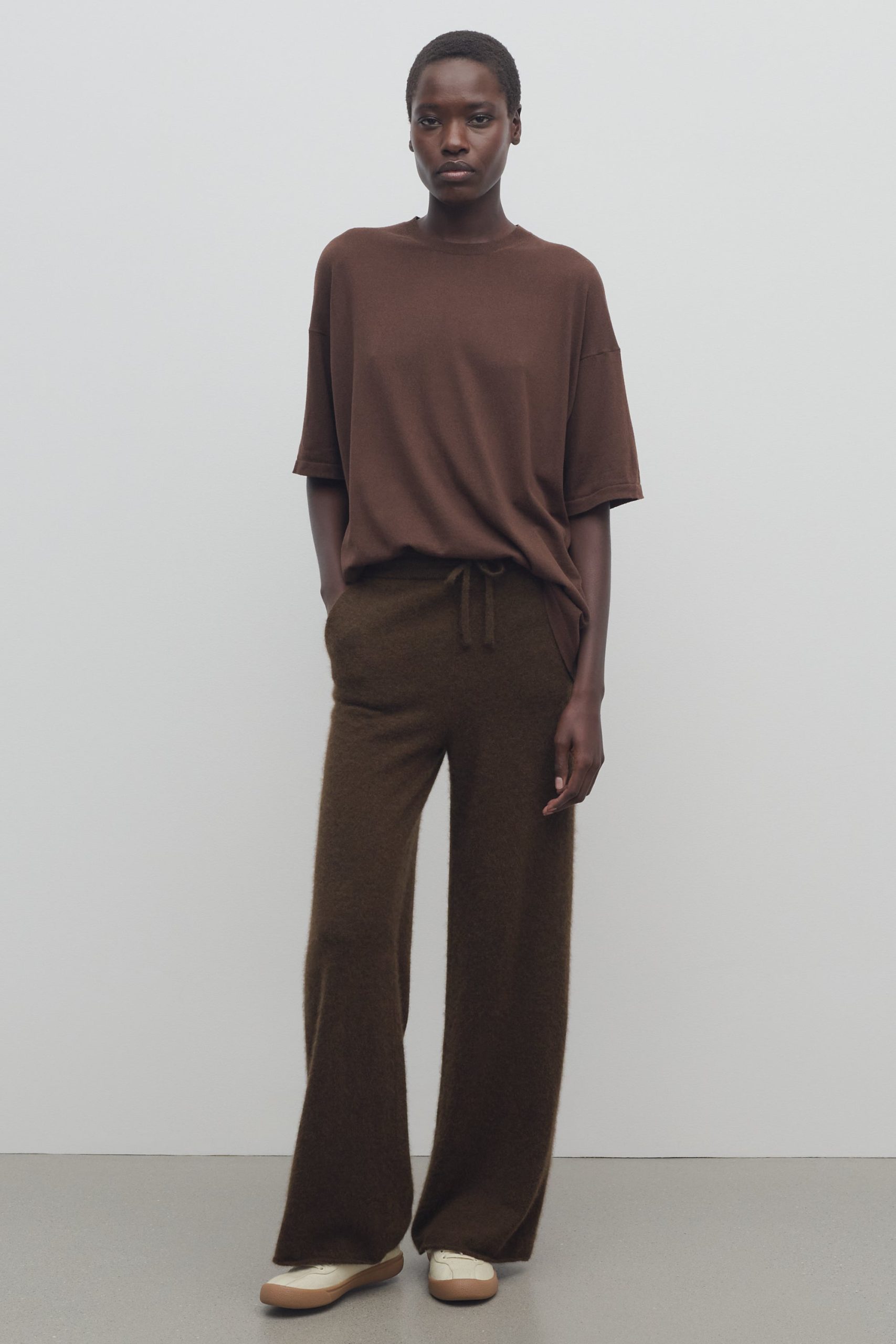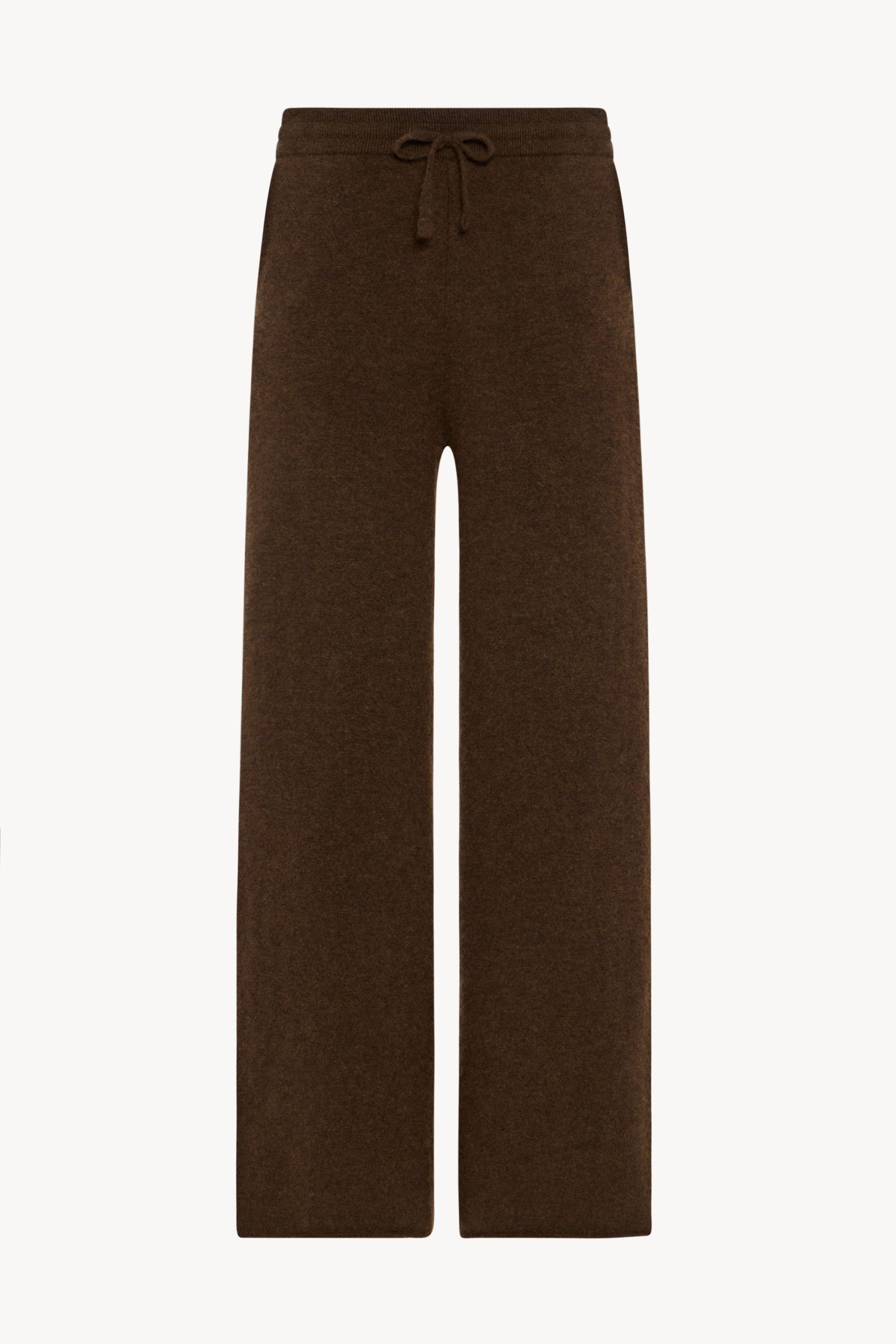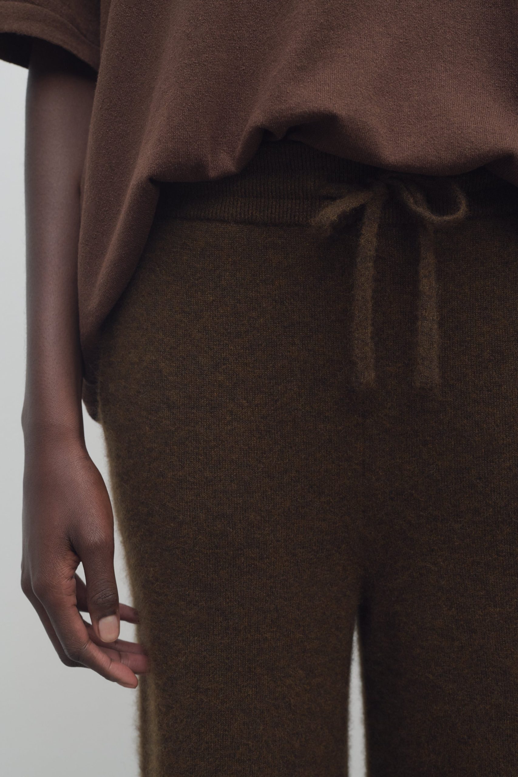 Relaxed pant in superfine cashmere and silk knit with wide leg and funnel waistband with drawstring.
