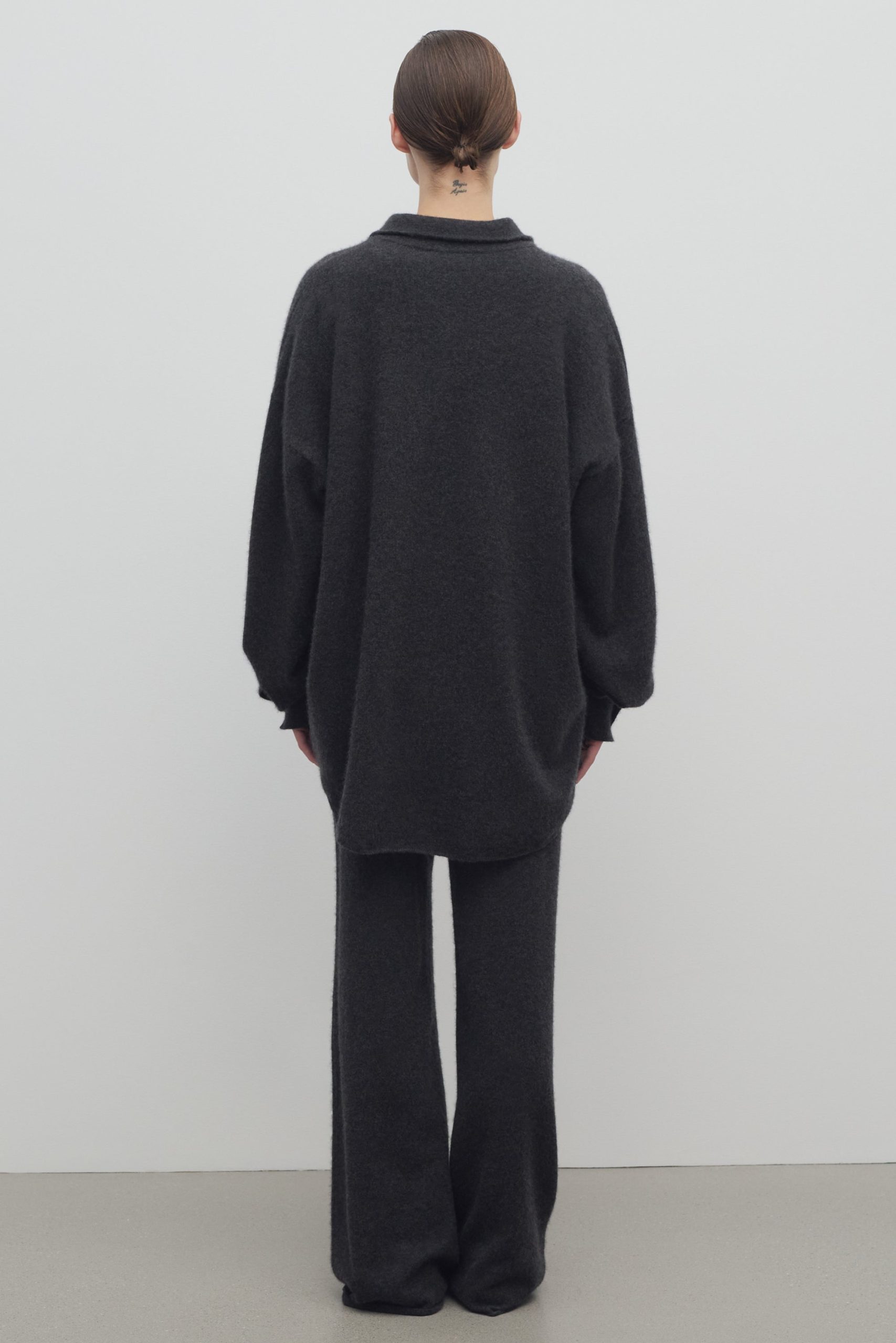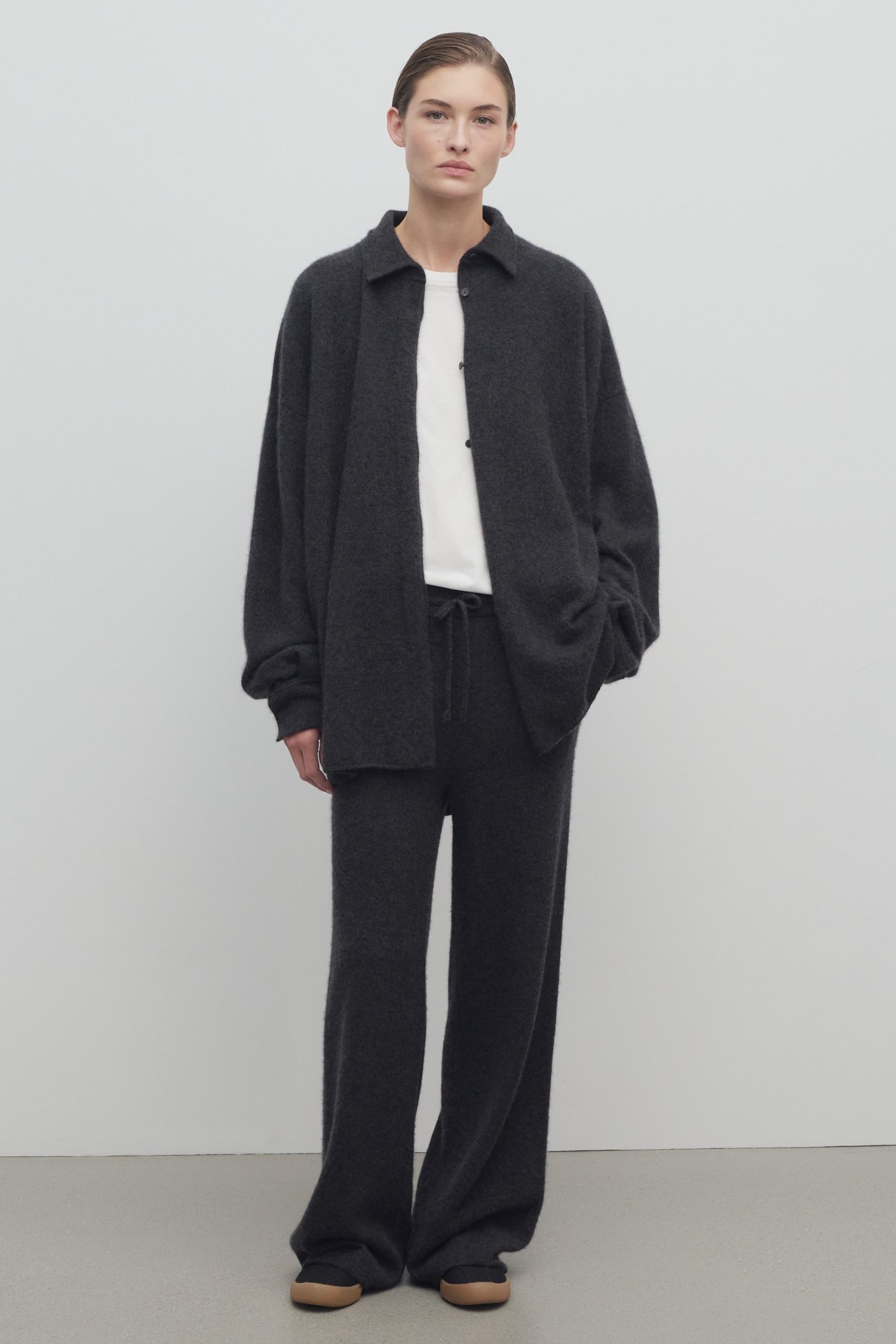 Relaxed pant in superfine cashmere and silk knit with wide leg and funnel waistband with drawstring.