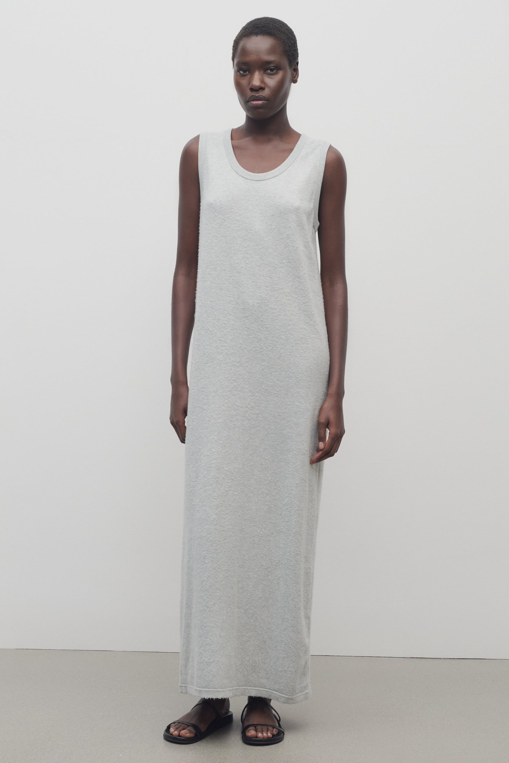 Relaxed ankle-length tank dress in softly brushed fine cotton with ribbed armholes and neckline. and straight fit.