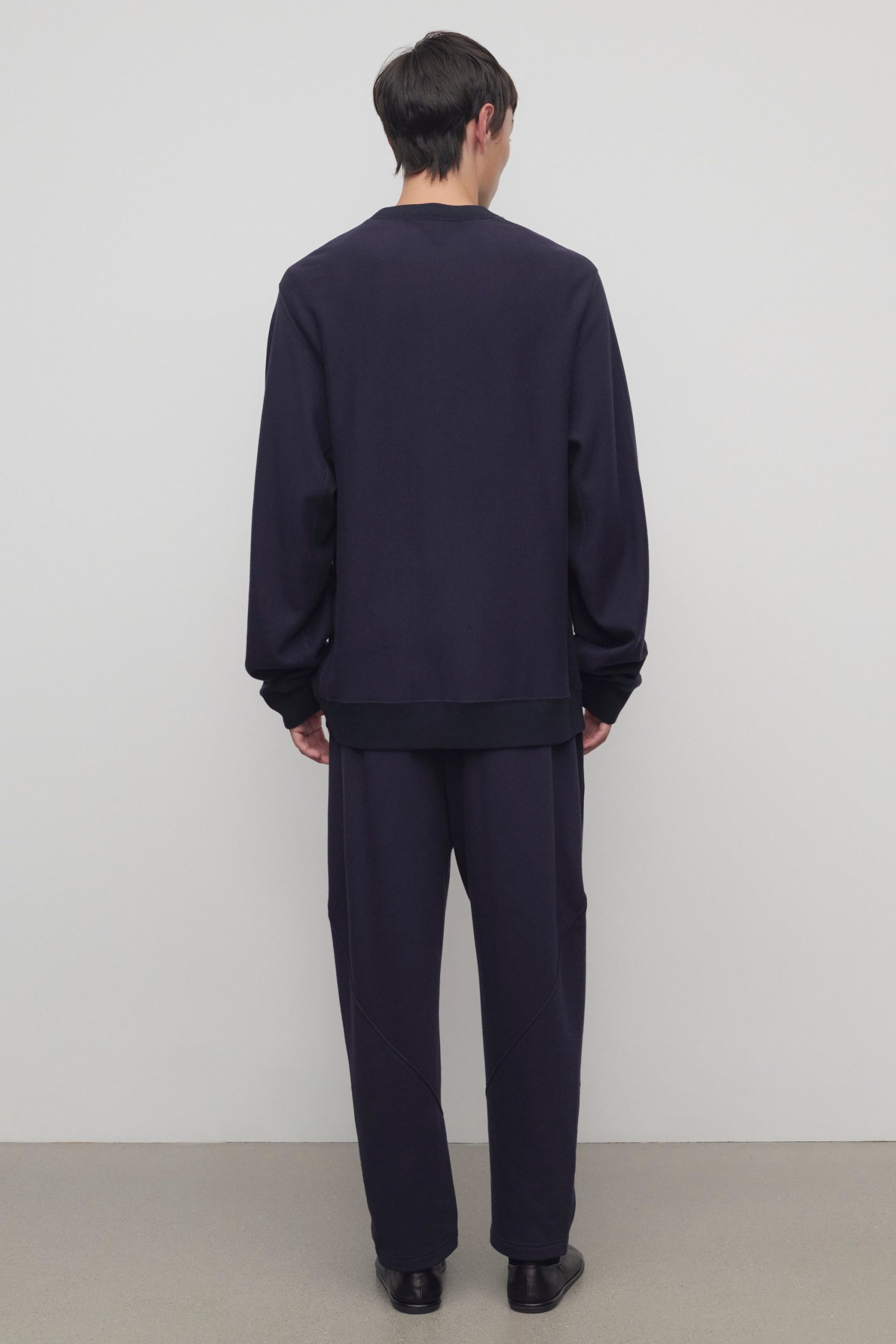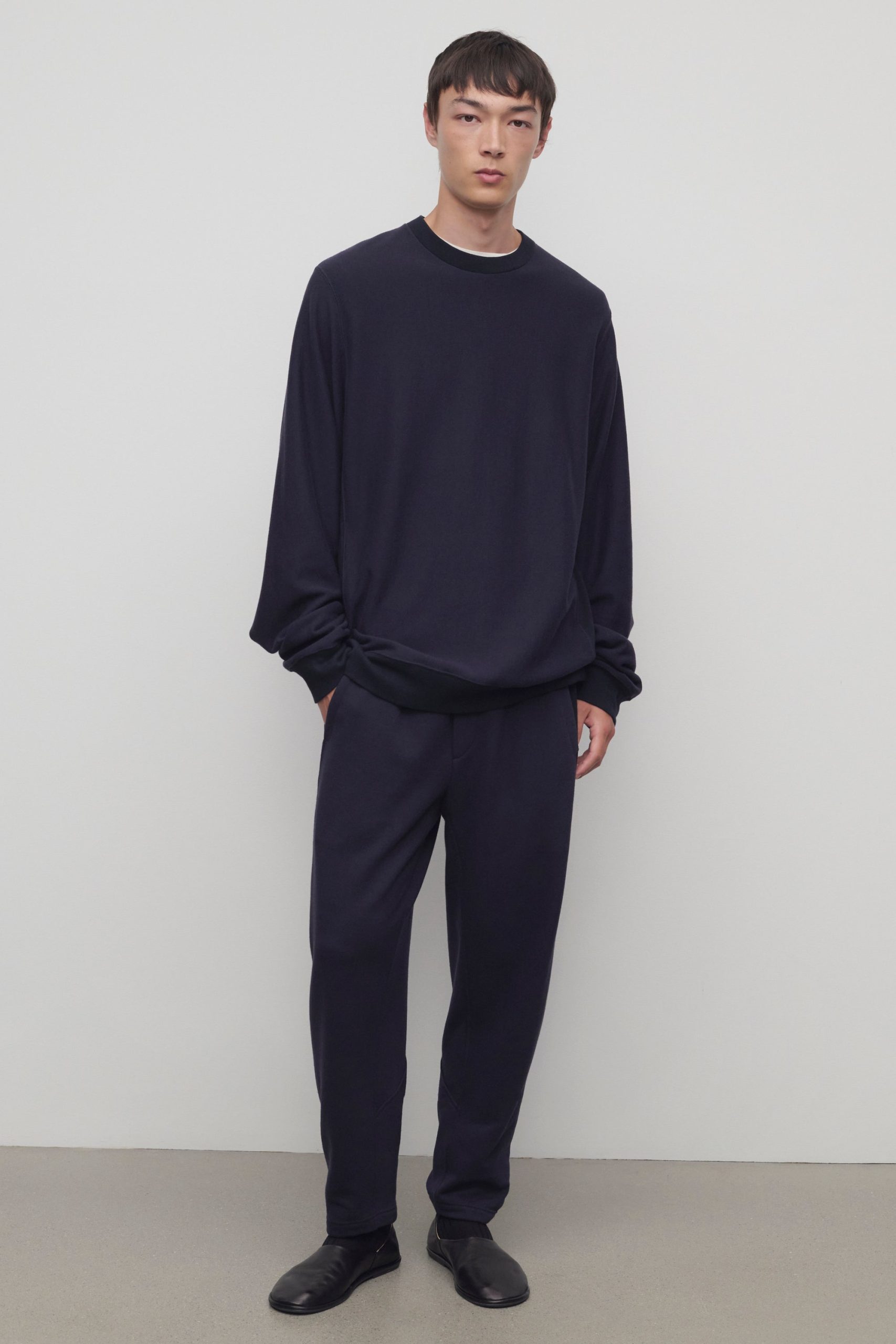 Relaxed pull-on pant in cotton and cashmere French terry with tapered hem. side seam pockets. and topstitched elastic waistband.